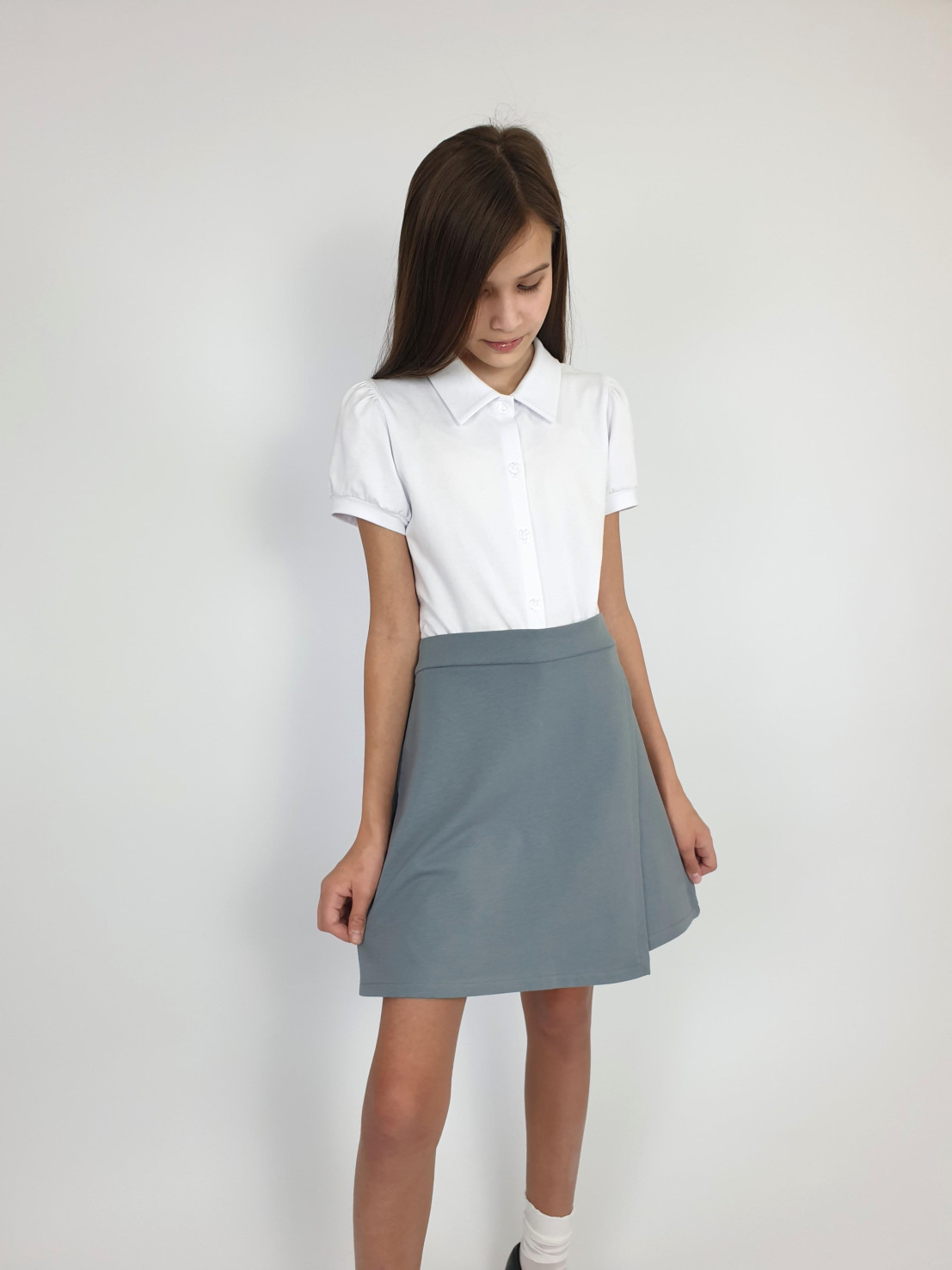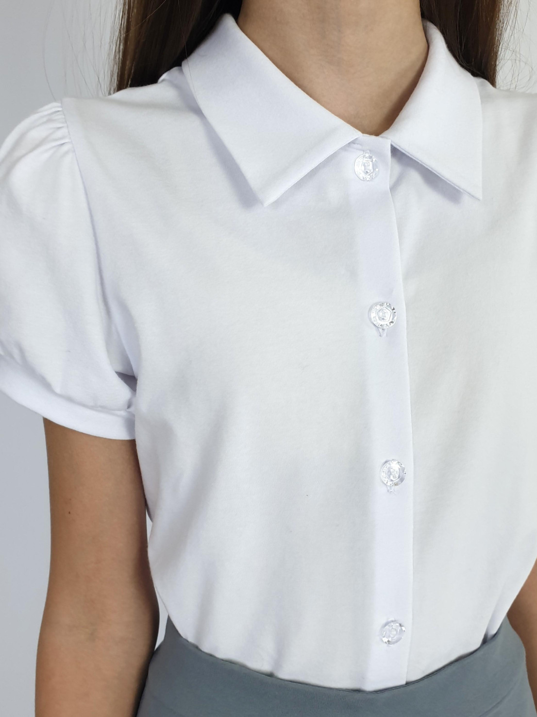 Кулирное полотно:95% х/б.,5% лайкра. Блузка-прямой силуэт,короткий рукав "фонарик",внизу на манжете.В горловине отложной воротник.Застежка центральная на пуговицы.
