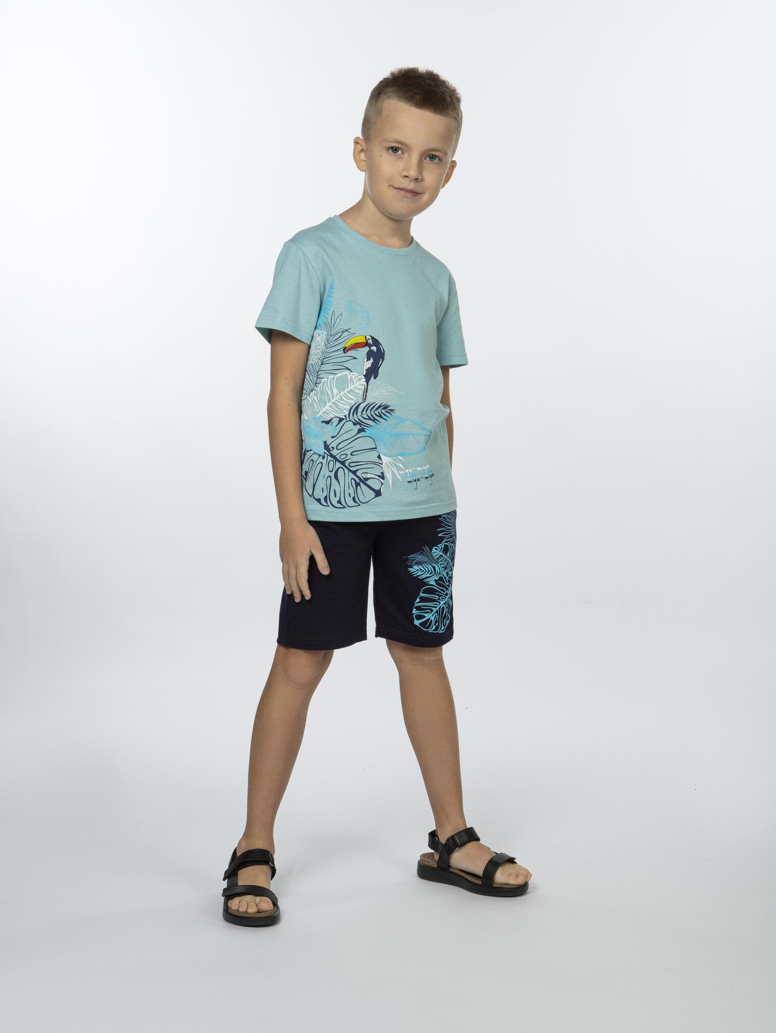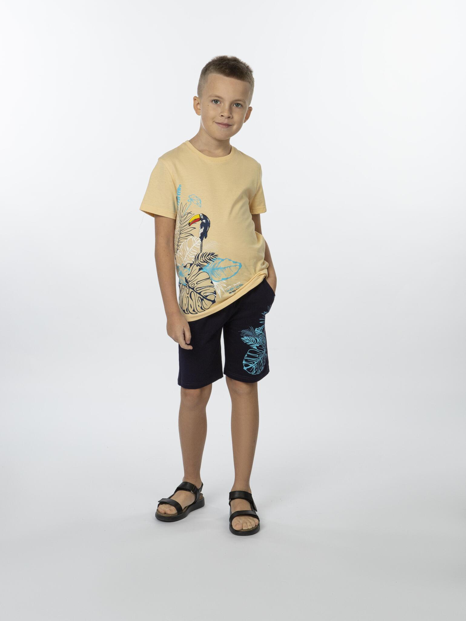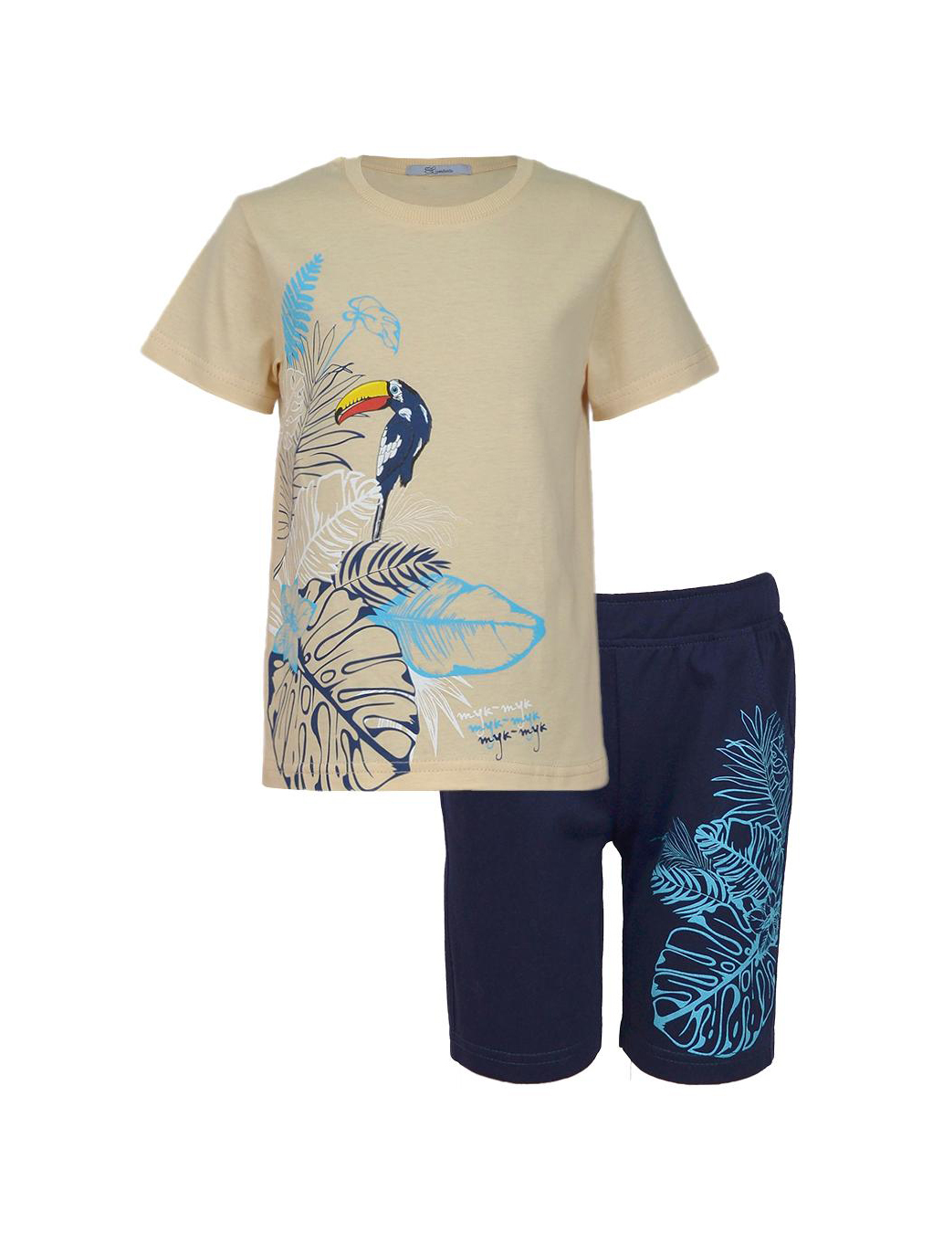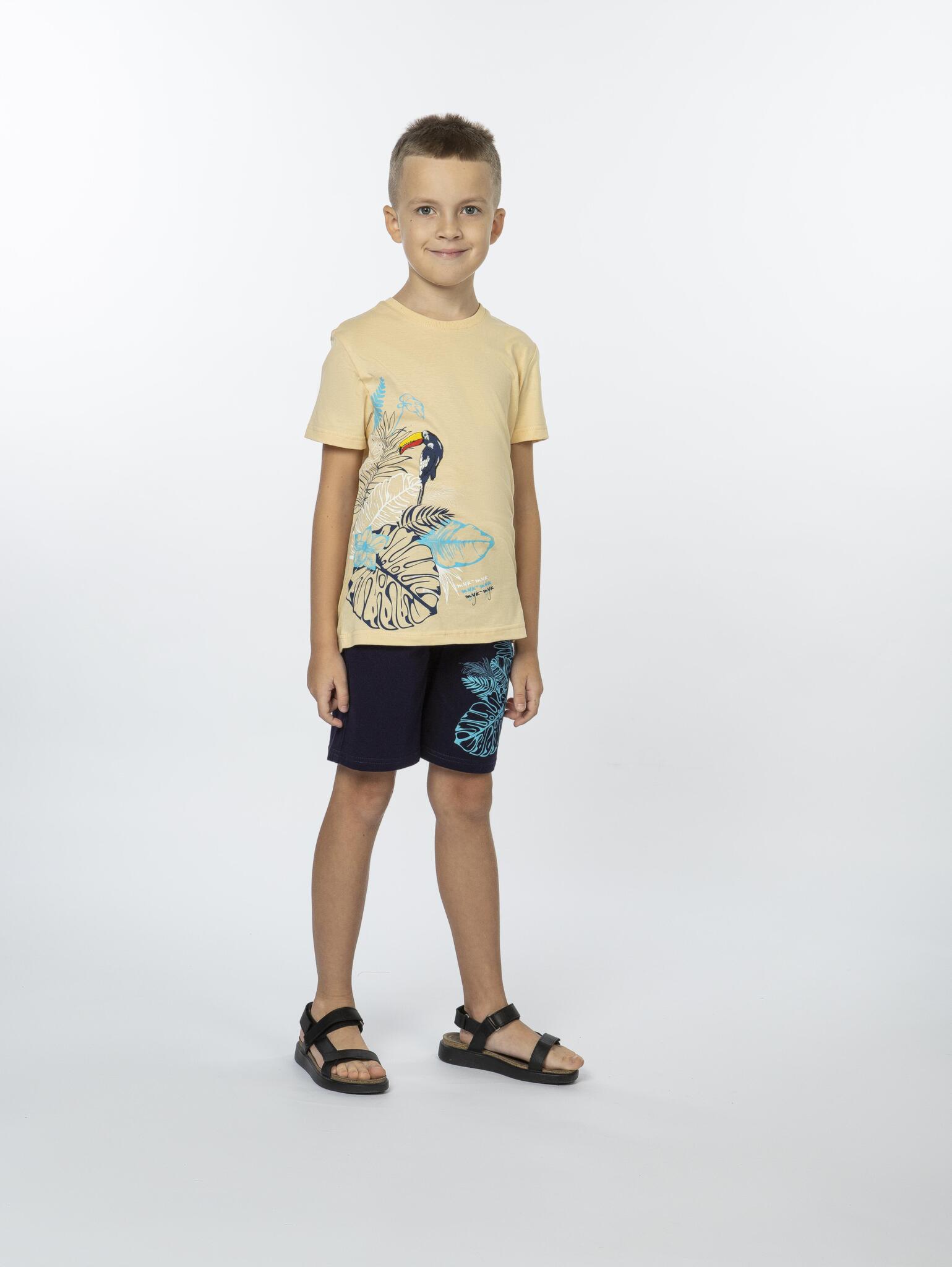 Кулирное полотно: 100% х/б. Фуфайка-прямая,короткий втачной рукав.Горловина обработана ластиком.Печать на переде. Шорты- укороченные с притачным поясом и резинкой.Два боковых кармана,печать на левой передней половинке.