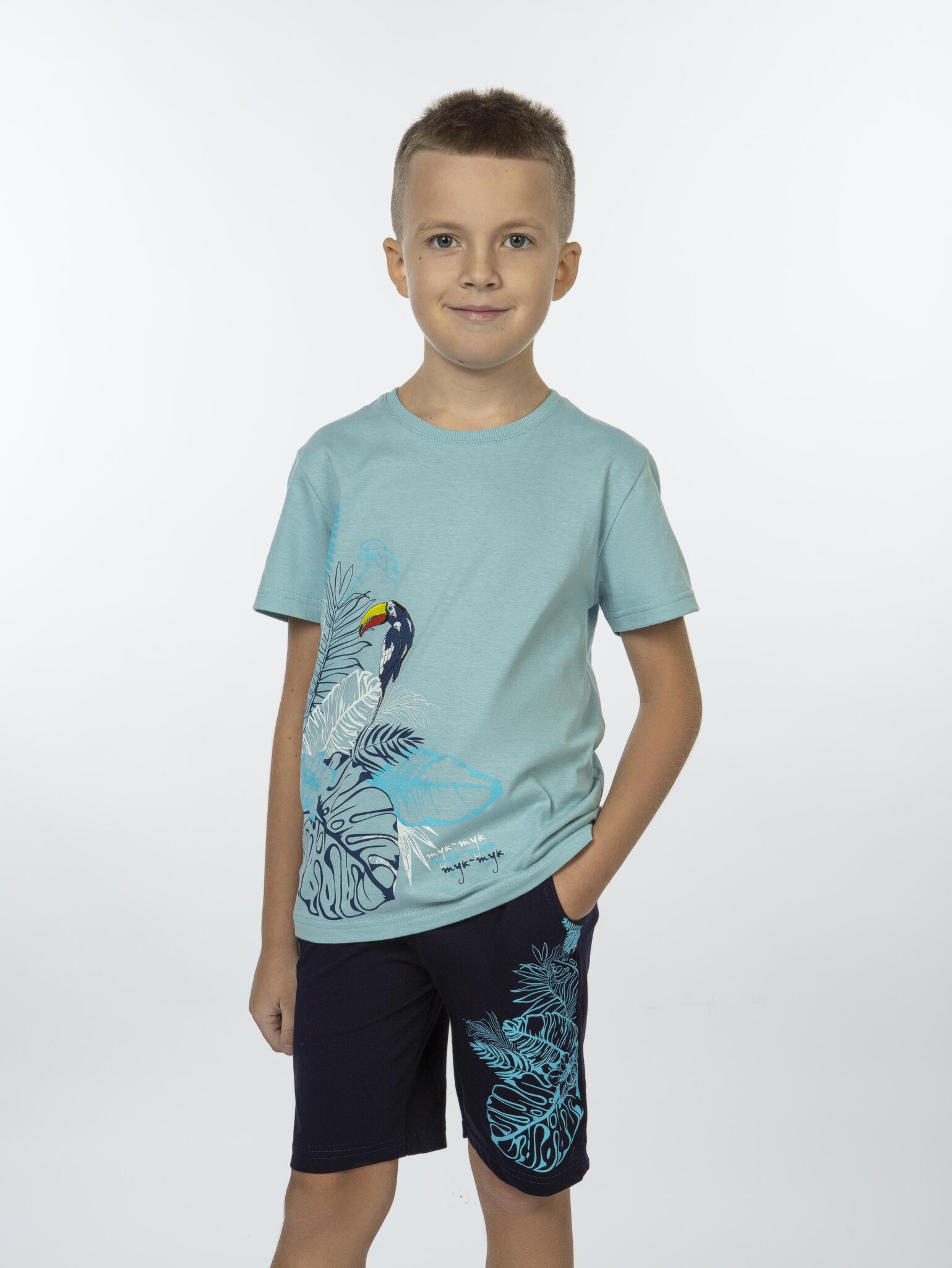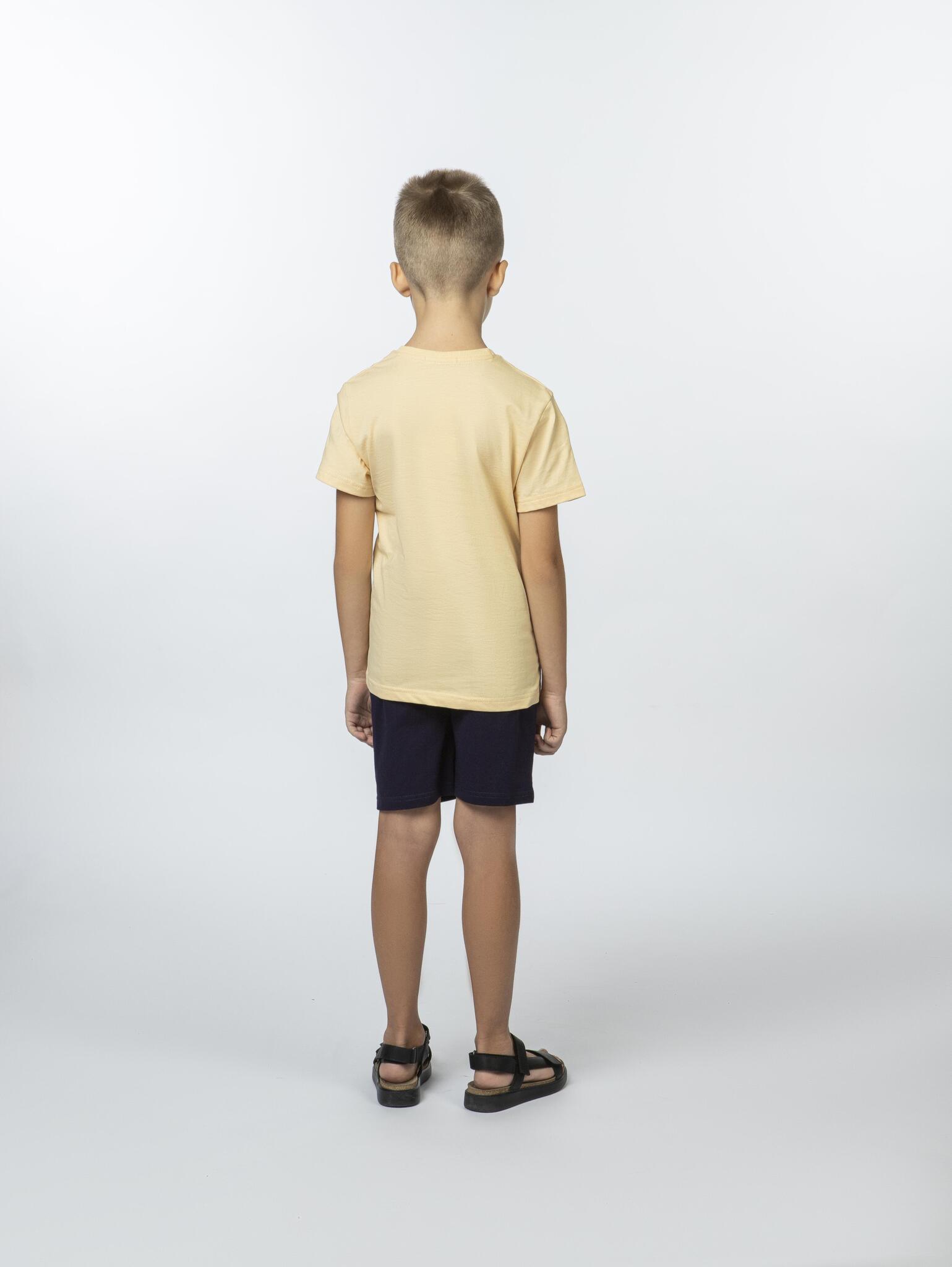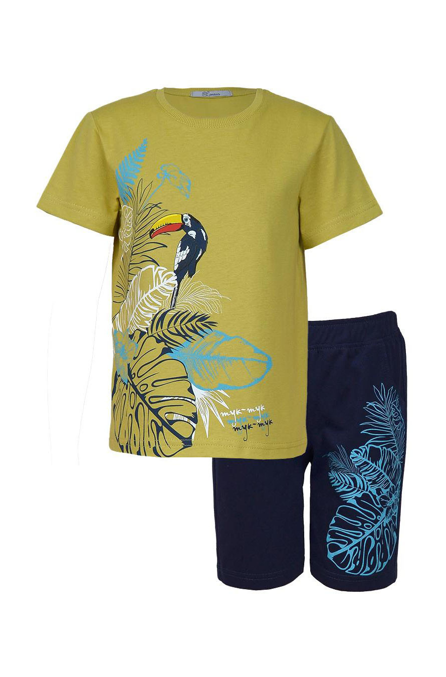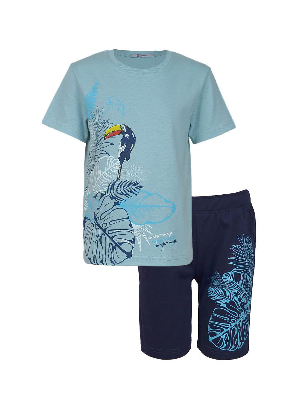 Кулирное полотно: 100% х/б. Фуфайка-прямая,короткий втачной рукав.Горловина обработана ластиком.Печать на переде. Шорты- укороченные с притачным поясом и резинкой.Два боковых кармана,печать на левой передней половинке.