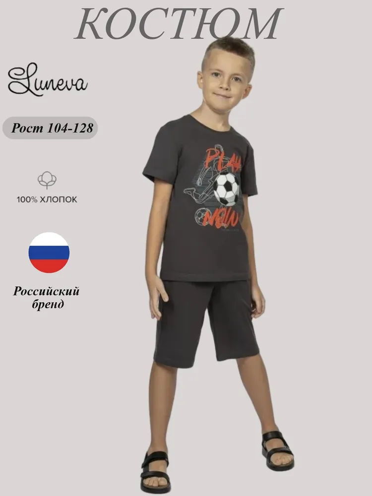 Фуфайка-прямая,короткий втачной рукав.Горловина обработана ластиком.Перед с печатью. Шорты-укороченные с притачным поясом и резинкой,два кармана.