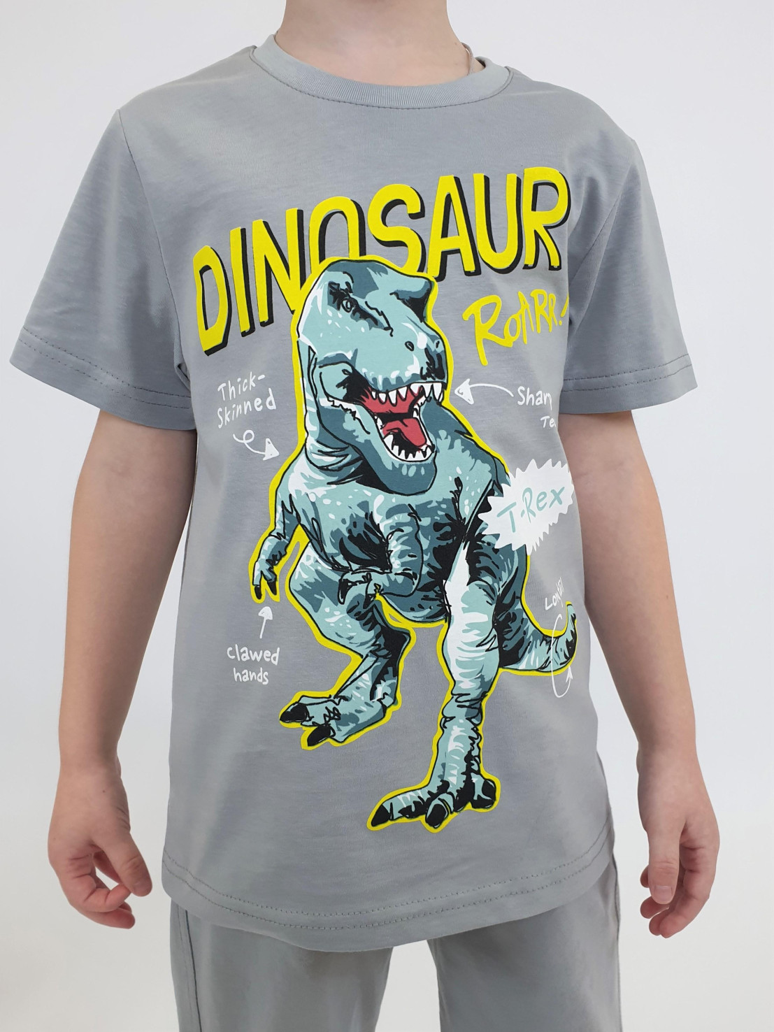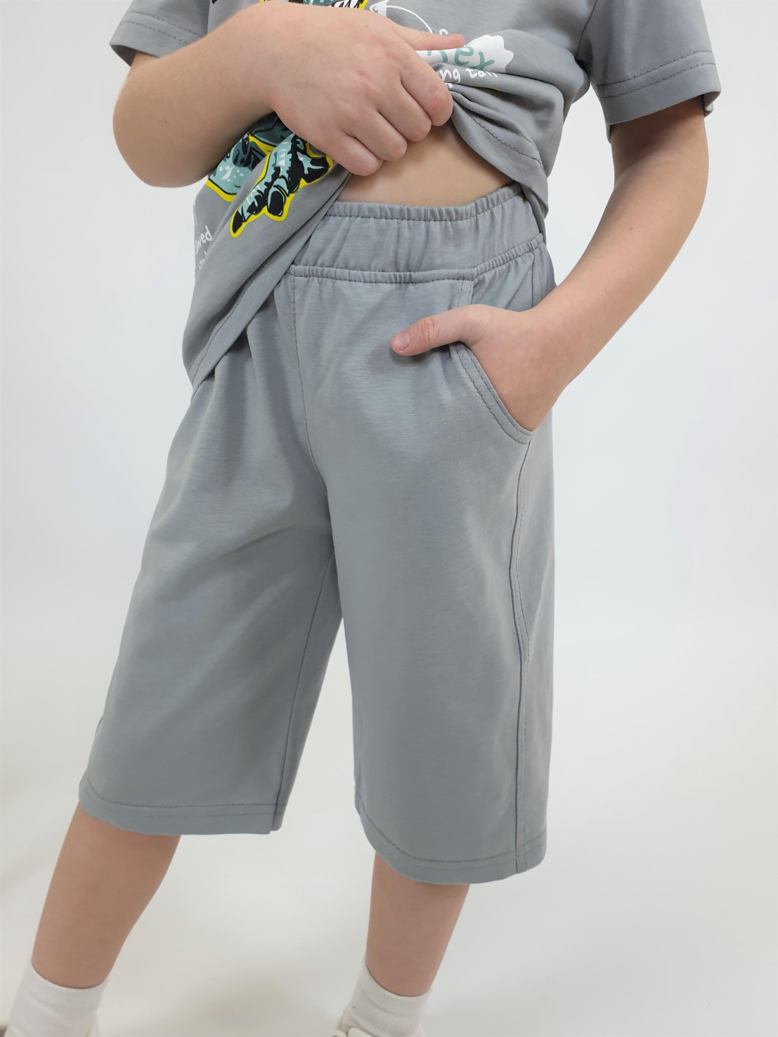 Кулирное полотно: 100% х/б. Фуфайка-прямая с печатью,короткий втачной рукав.Горловина обработана ластиком. Шорты-удлиненные с притачным поясом и резинкой.Два кармана на переде.