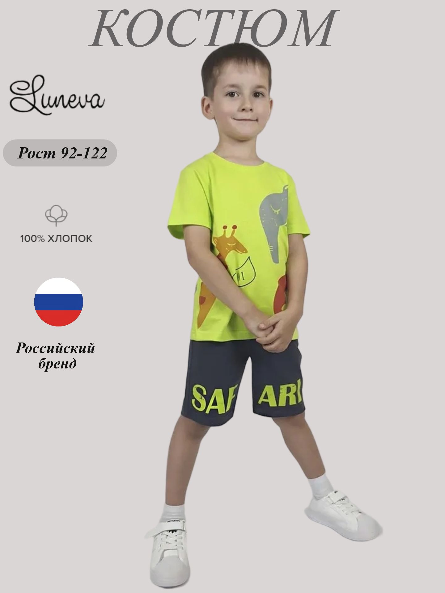 Кулирное полотно: 100% х/б. Фуфайка-прямая,перед и спинка с печатью.Рукав втачной,короткий.Горловина обработана ластиком. Шорты-укороченные с притачным поясом и резинкой.Два боковых кармана.Печать внизу,по переду.