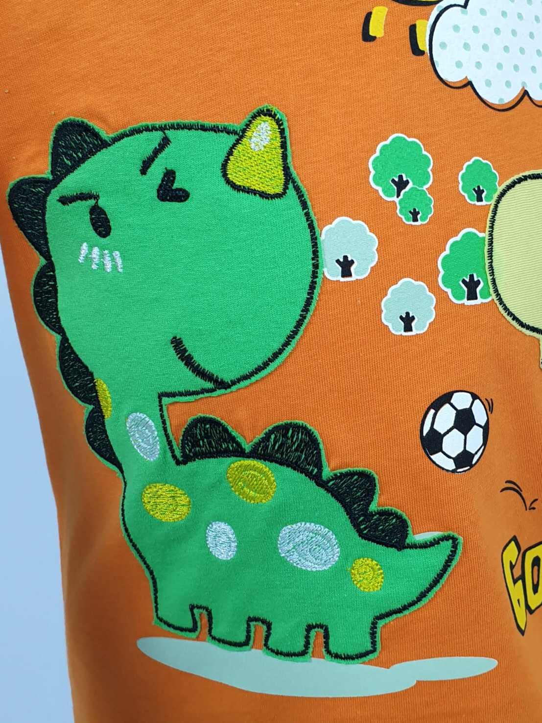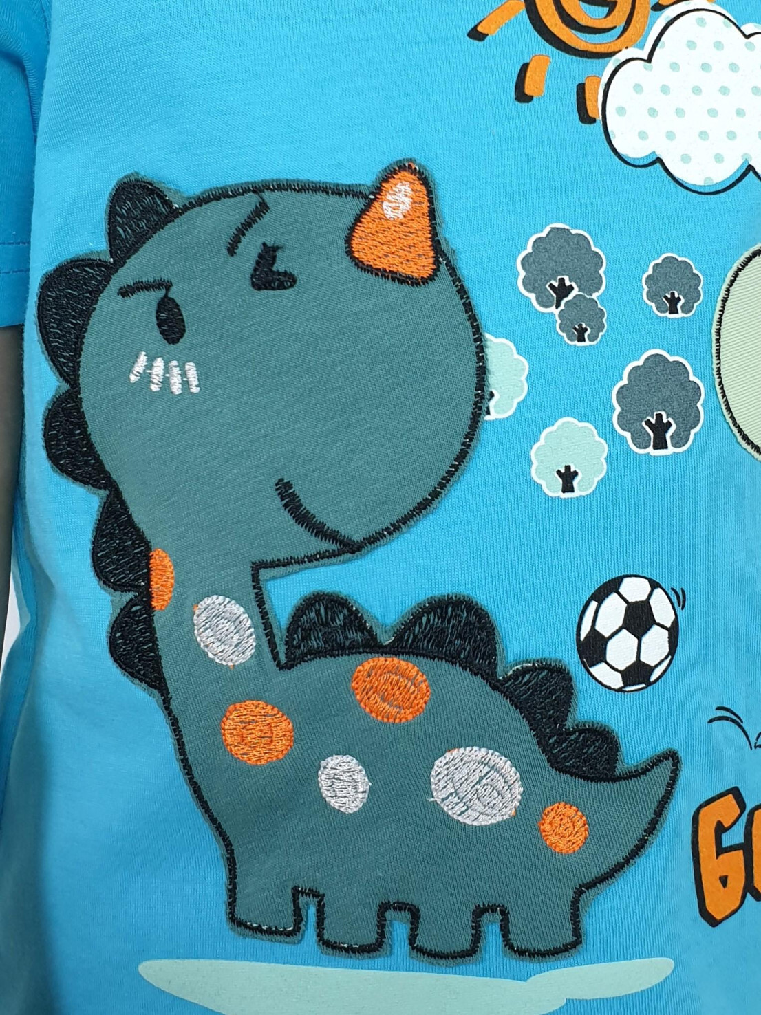 Кулирное полотно: 100% х/б. Фуфайка-прямая,перед с печатью и вышивкой.Рукав втачной,короткий.Горловина обработана ластиком. Шорты-укороченные с притачным поясом и резинкой.Два боковых кармана.Печать на передней правой половинке.