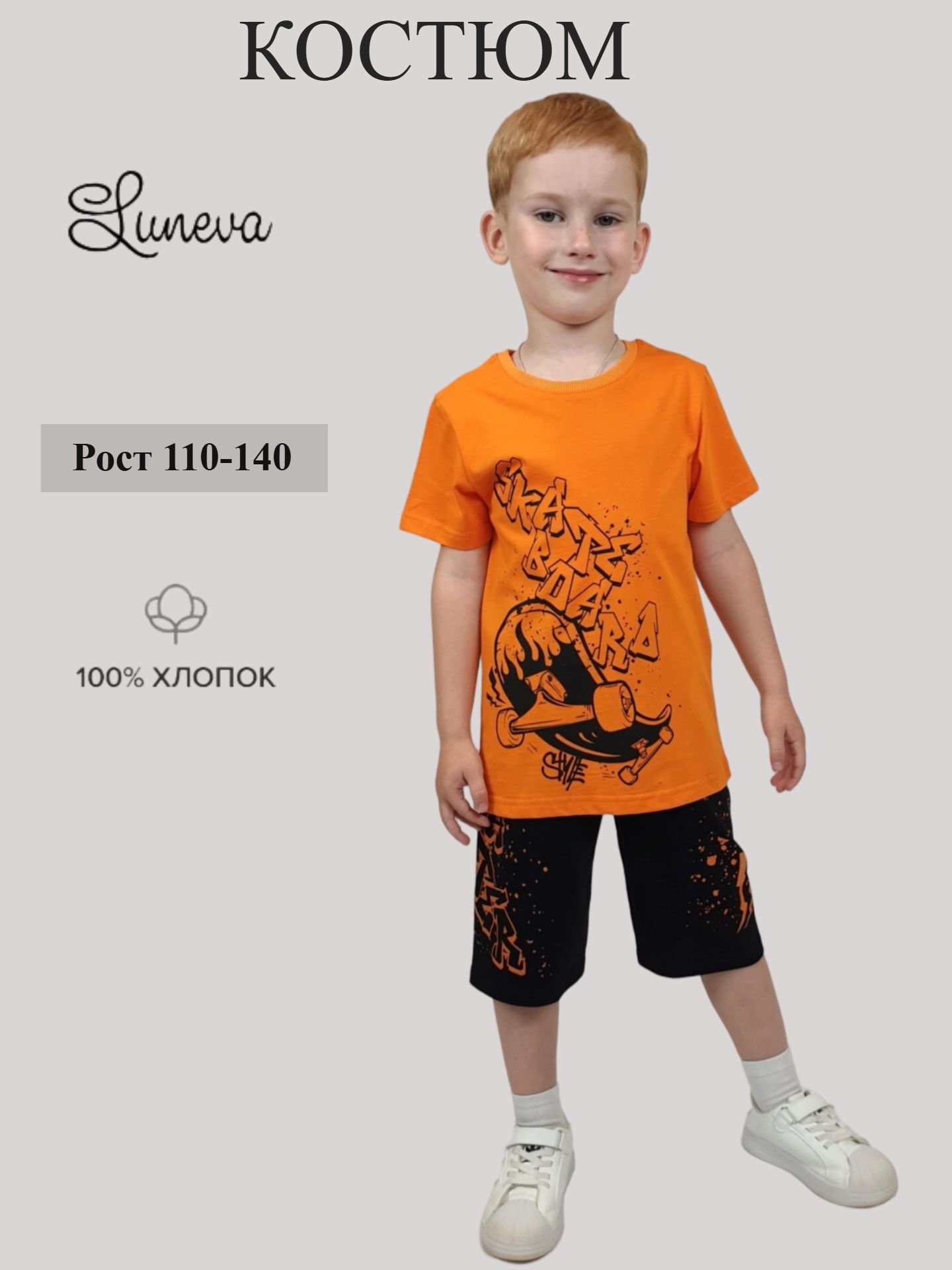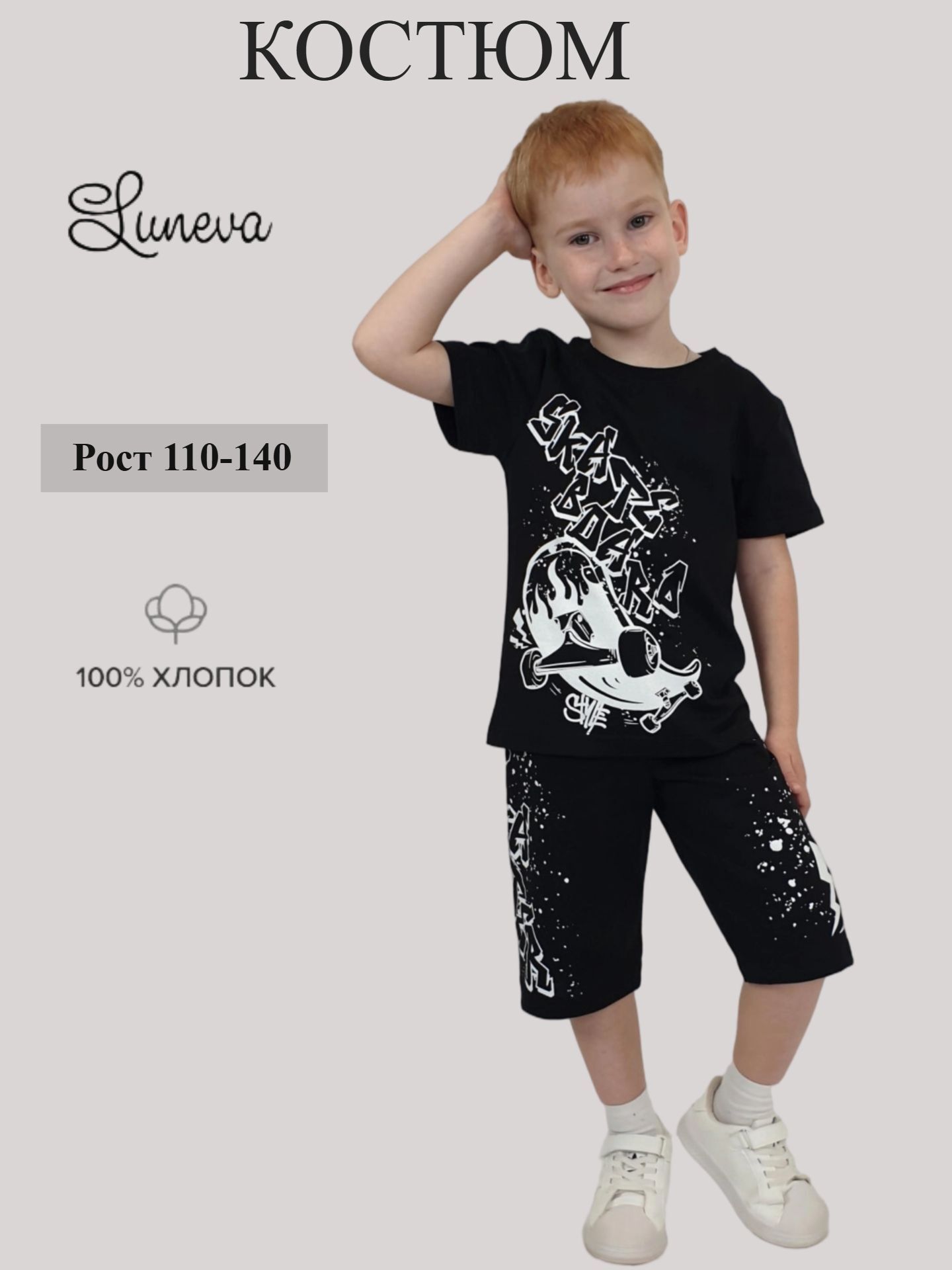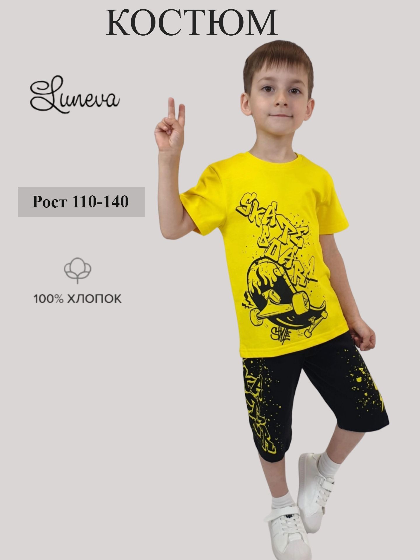 Кулирное полотно: 100% х/б. Джемпер-прямой,короткий втачной рукав,перед с печатью.Горловина обработана ластиком. Шорты-удлиненные с притачным поясом,с резинкой.без бокового шва.Печать сбоку.