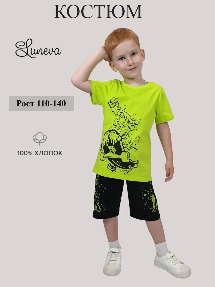Кулирное полотно: 100% х/б. Джемпер-прямой,короткий втачной рукав,перед с печатью.Горловина обработана ластиком. Шорты-удлиненные с притачным поясом,с резинкой.без бокового шва.Печать сбоку.
