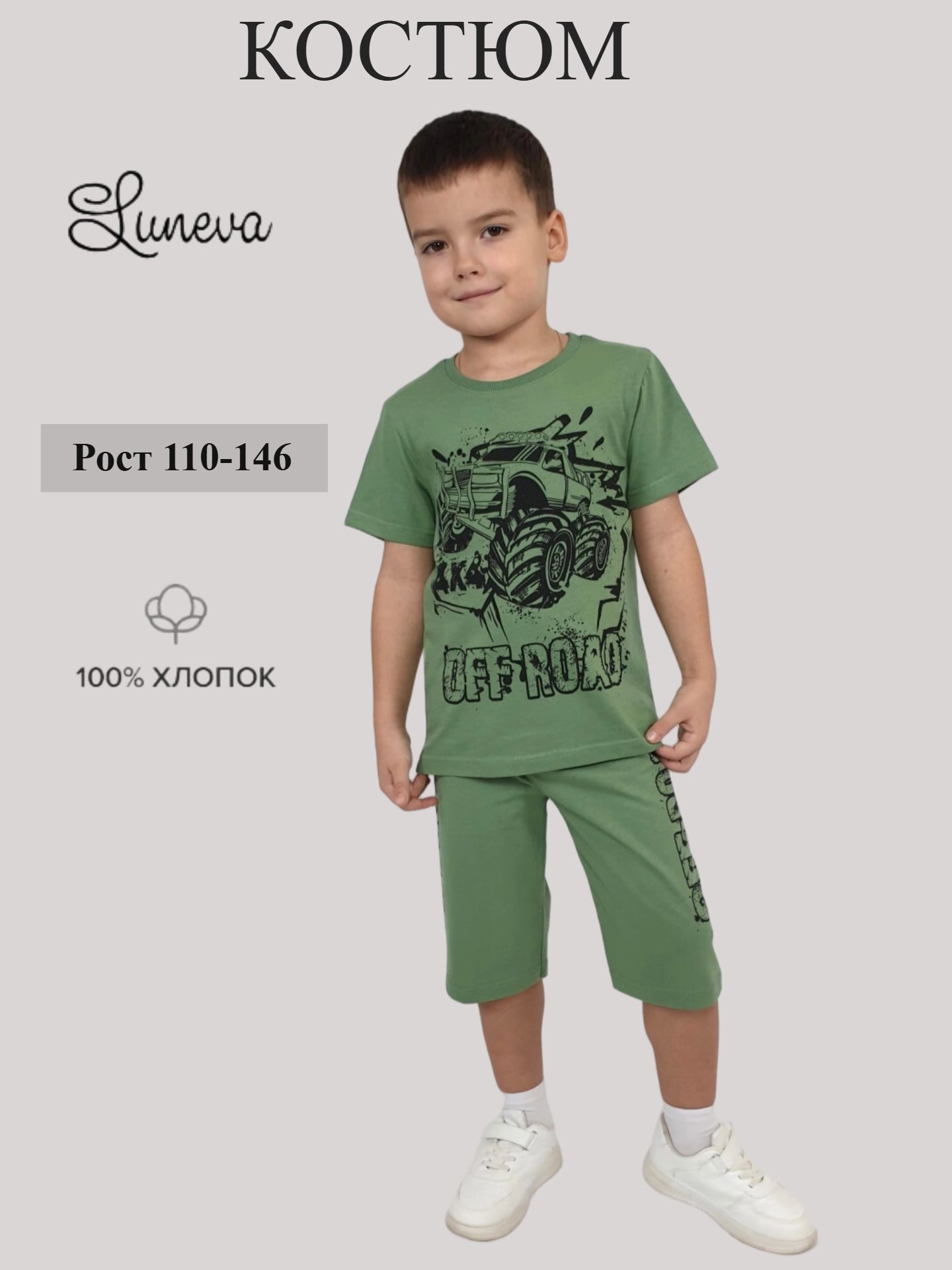 Данный комплект детской одежды от бренда Lunева включает футболку прямого кроя с коротким рукавом и принтом впереди, а также удлинённые шорты без бокового шва с резиночкой по талии. Комплект выполнен из практичного и комфортного 100%-го хлопка (кулирного полотна). Изделия производятся в России и предназначены для мальчиков.