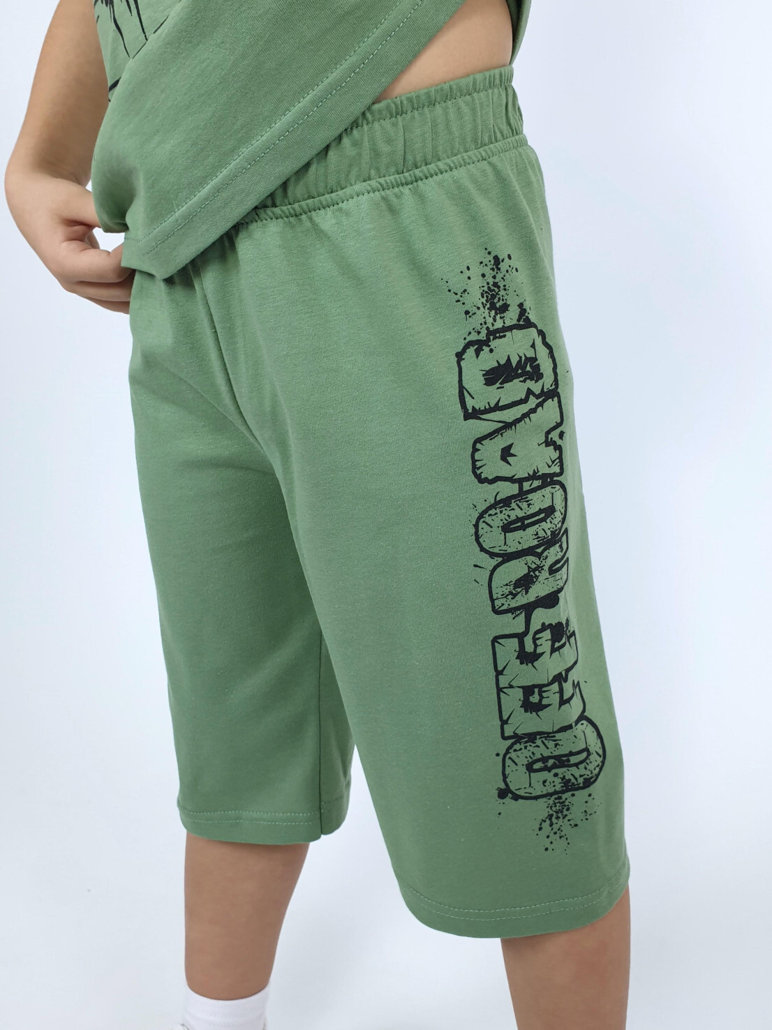 Кулирное полотно: 100% х/б. Джемпер-прямой,короткий втачной рукав,перед с печатью.Горловина обработана ластиком. Шорты-удлиненные с притачным поясом и резинкой,без бокового шва.Печать сбоку.