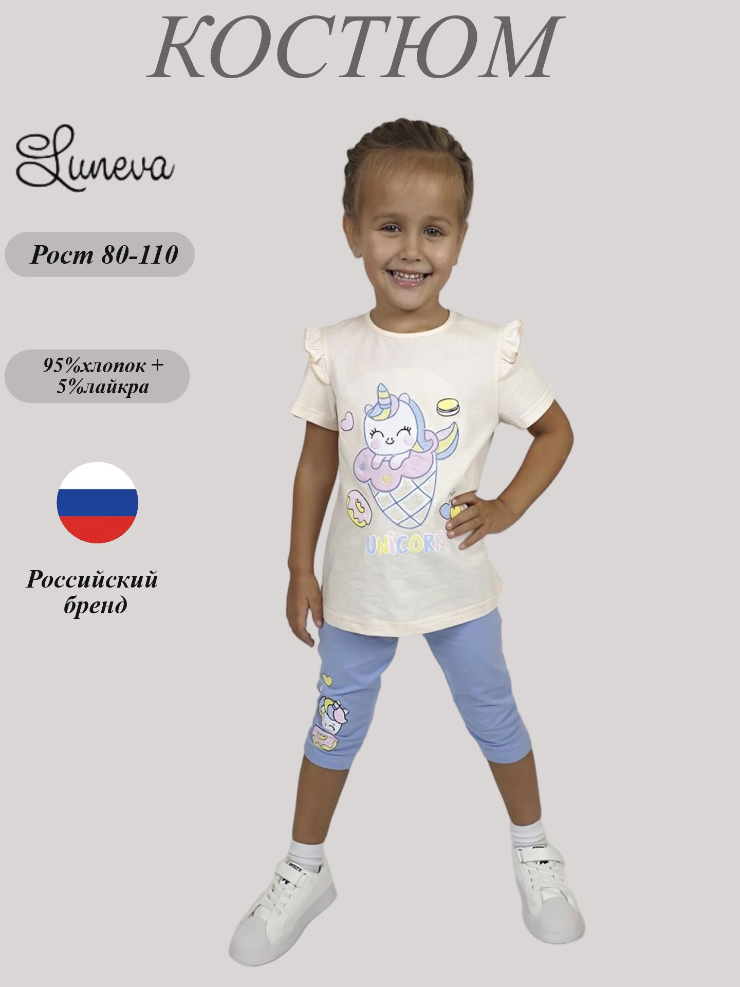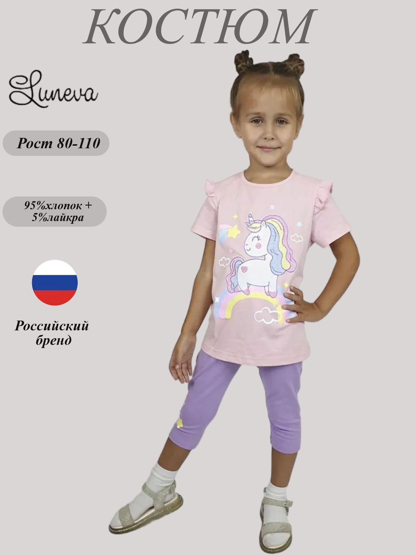 Кулирное полотно: Фуфайка- 100% х/б.,лосины-95% х/б,5% лайкра. Фуфайка-силуэт трапеция,короткий втачной рукав,в пройме рюша.Горловина окантована,застежка на пуговицу по спинке.Вышивка и печать на переде. Лосины-укороченные с печатью на правой стороне внизу,вверху на резинке.