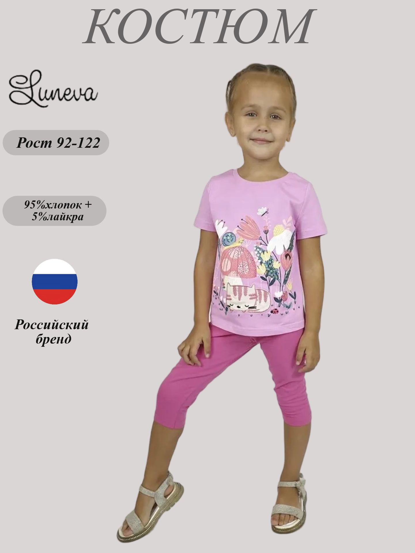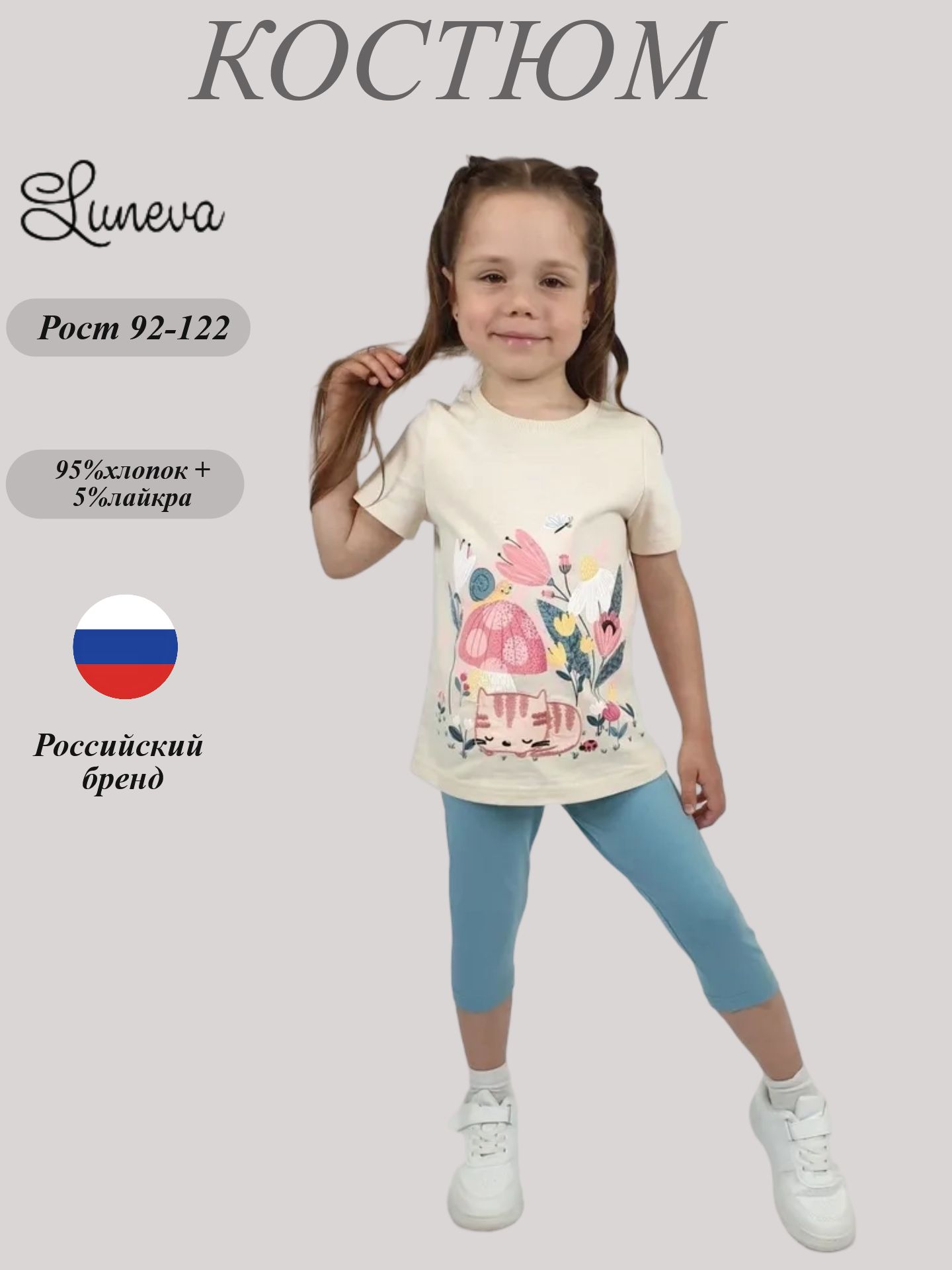 Кулирное полотно: Фуфайка- 100% х/б.,лосины-95% х/б,5% лайкра. Фуфайка-прямой силуэт,печать и вышивка на переде,короткий втачной рукав.Низ рукава и фуфайки подшит.Горловина обработана ластиком. Лосины-укороченные,вверху на резинке.