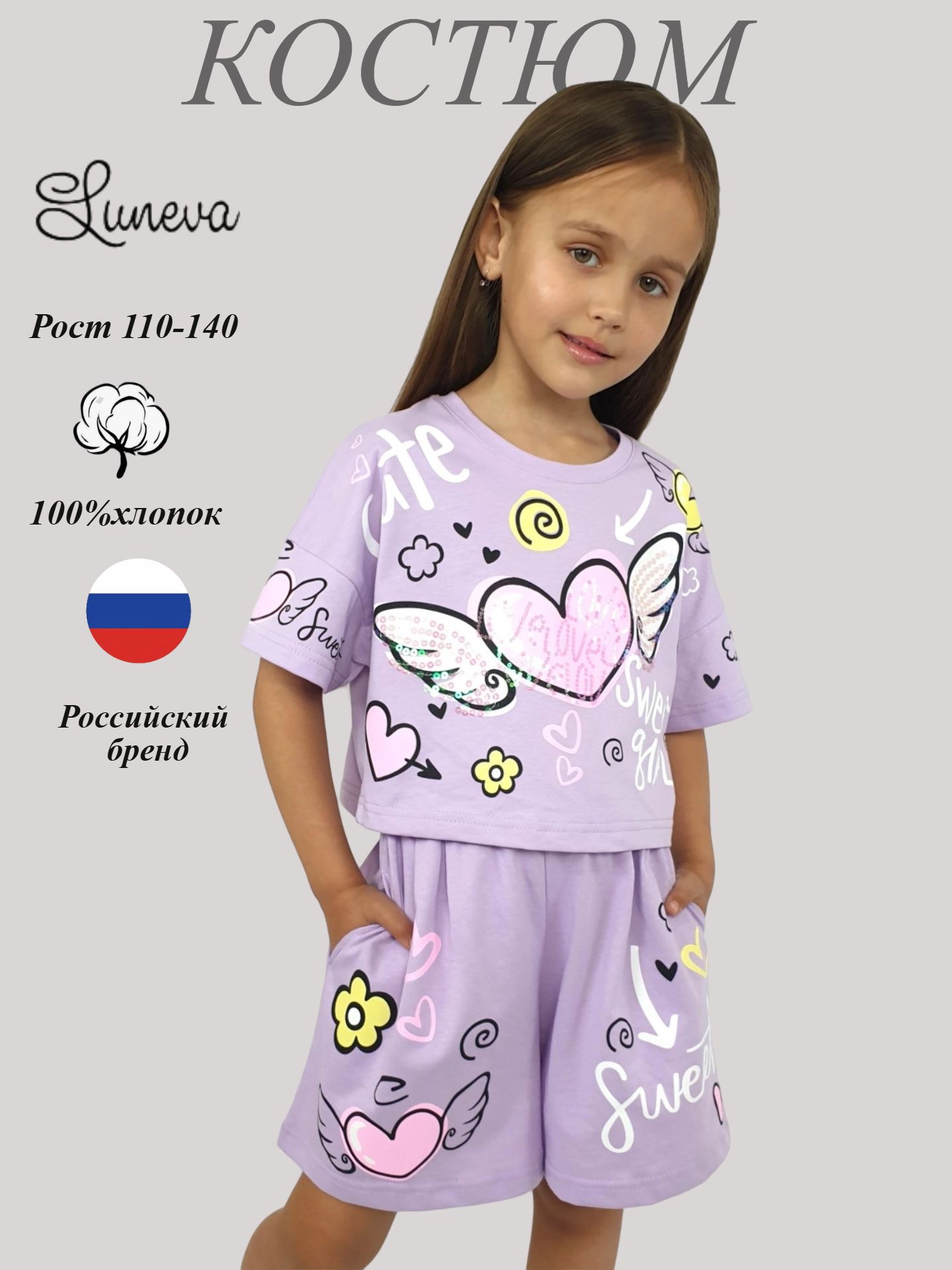 Этот стильный костюм станет настоящей изюминкой вашего гардероба! Комплект включает фуфайку оверсайз с укороченным рукавом, украшенную блестящими пайетками и оригинальной печатью, а также элегантные шортики из кулирного полотна со складками впереди. Красивый сиреневый оттенок придаст образу нежности и женственности. Сделано в России, материал — стопроцентный натуральный хлопок, марка "Lunева". Идеален как для прогулок, так и для яркого выхода в свет!
