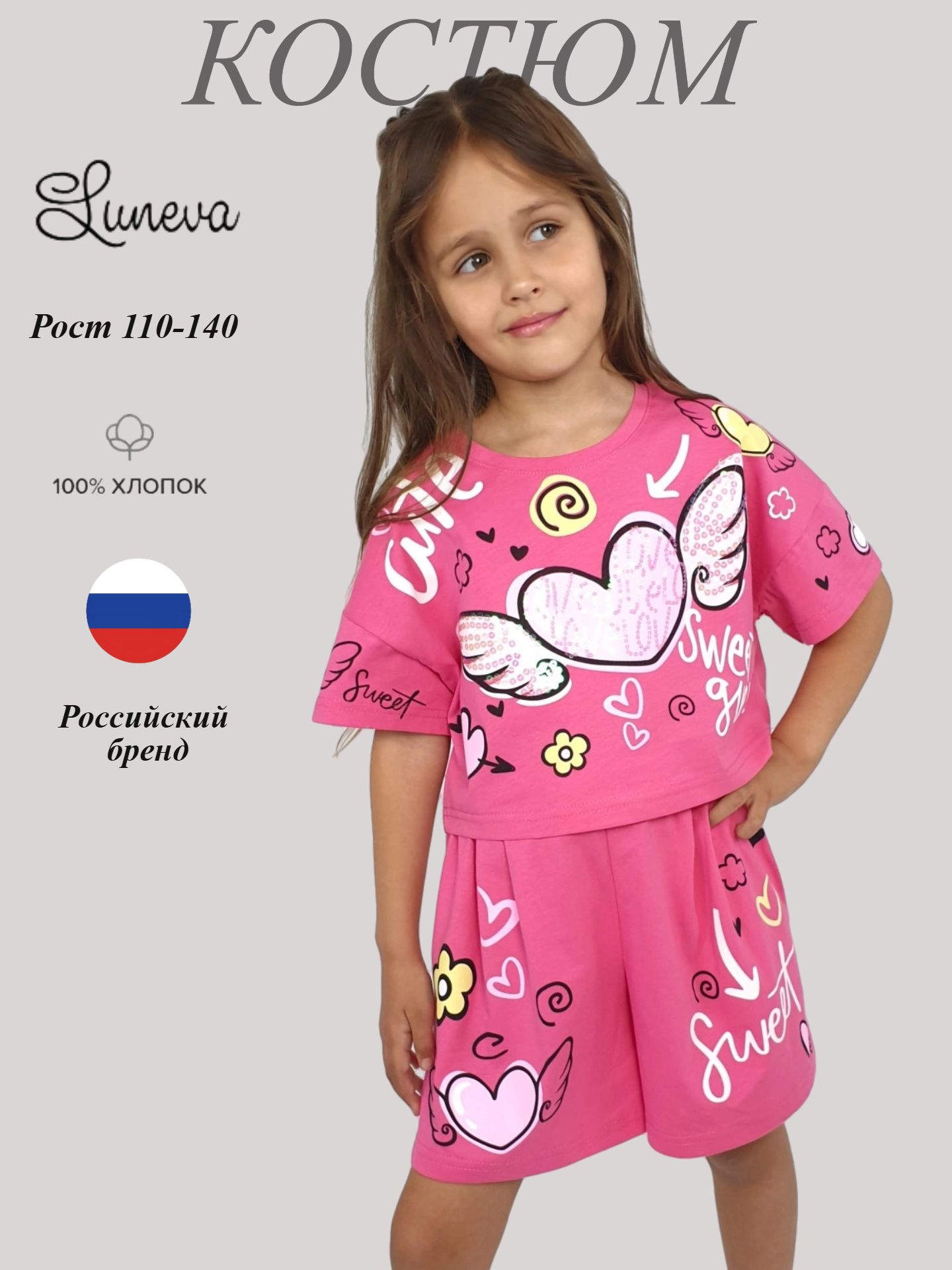 Этот стильный комплект из фуфайки-оверсайз и коротких шорт станет настоящей находкой для модниц! Визуальный акцент создает яркая печать и блестящая вышивка пайетками на фуфайке, дополняя образ игривыми складочками и удобством ношения. Шорты идеально подчеркивают фигуру благодаря поясу на резинке и удобным боковым карманам. Комплект выполнен из мягкого кулирного полотна (100% хлопок), что обеспечивает комфорт даже в жаркую погоду. Маршрут к стильным образам начинается здесь – выбирай Lunева!