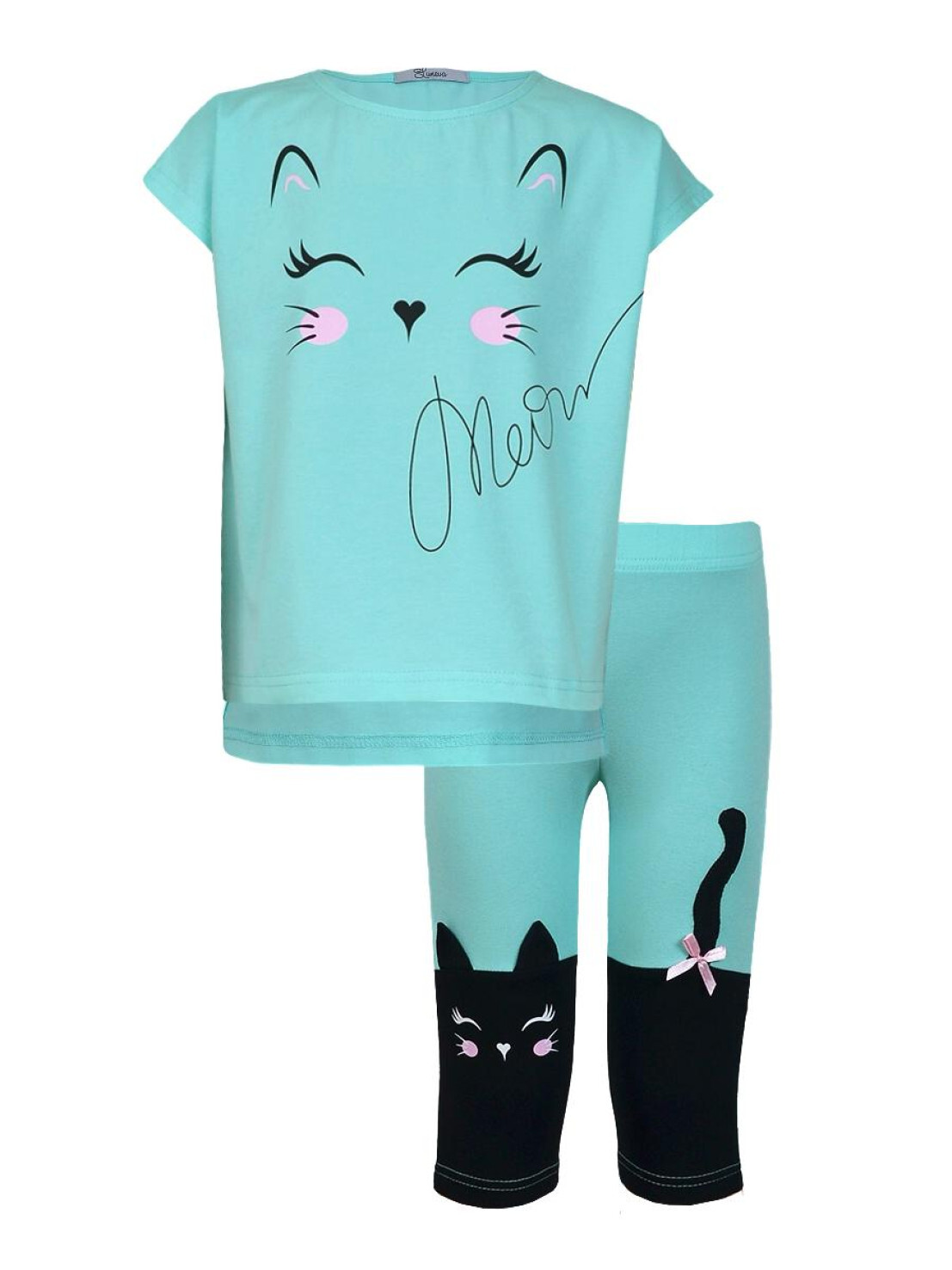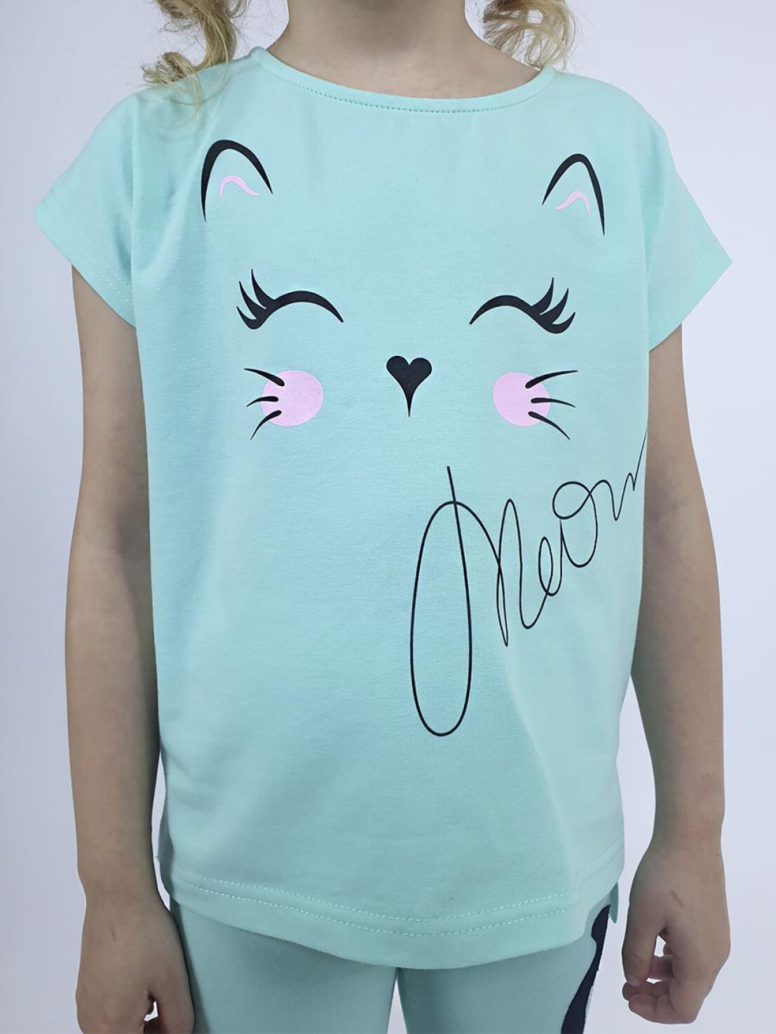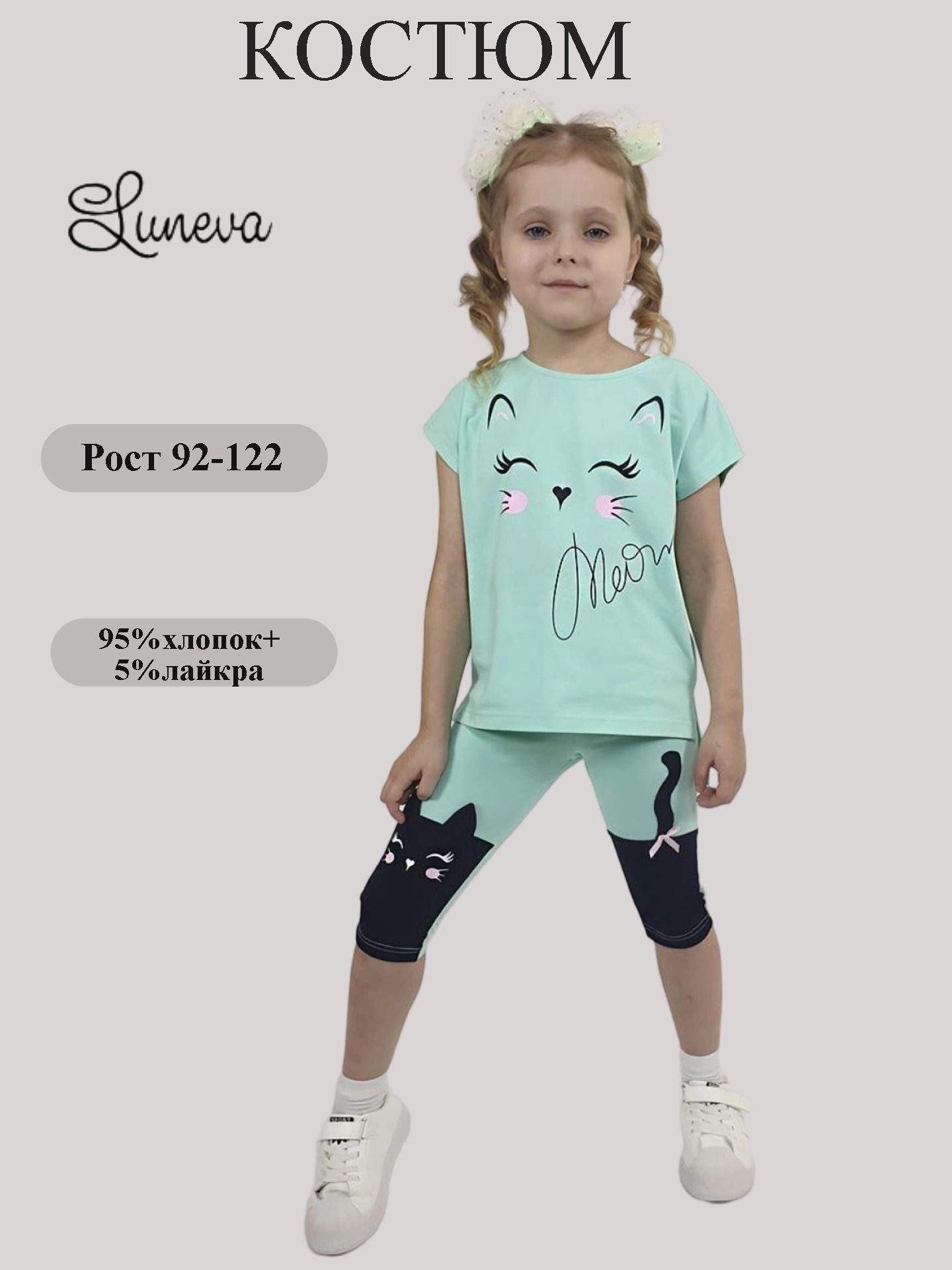 Кулирное полотно:95% х/б,5% лайкра. Фуфайка-прямой силуэт,удлиненная спинка с разрезами,перед с печатью.Спущенное плечо,горловина окантована и подшита. Лосины-укороченные,передние половинки с подрезами.Вышивка-аппликация слева,печать на правой передней стороне.Отделочный бантик.
