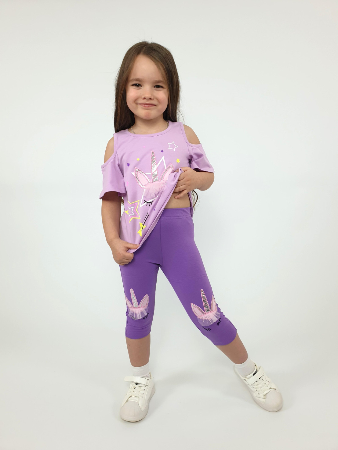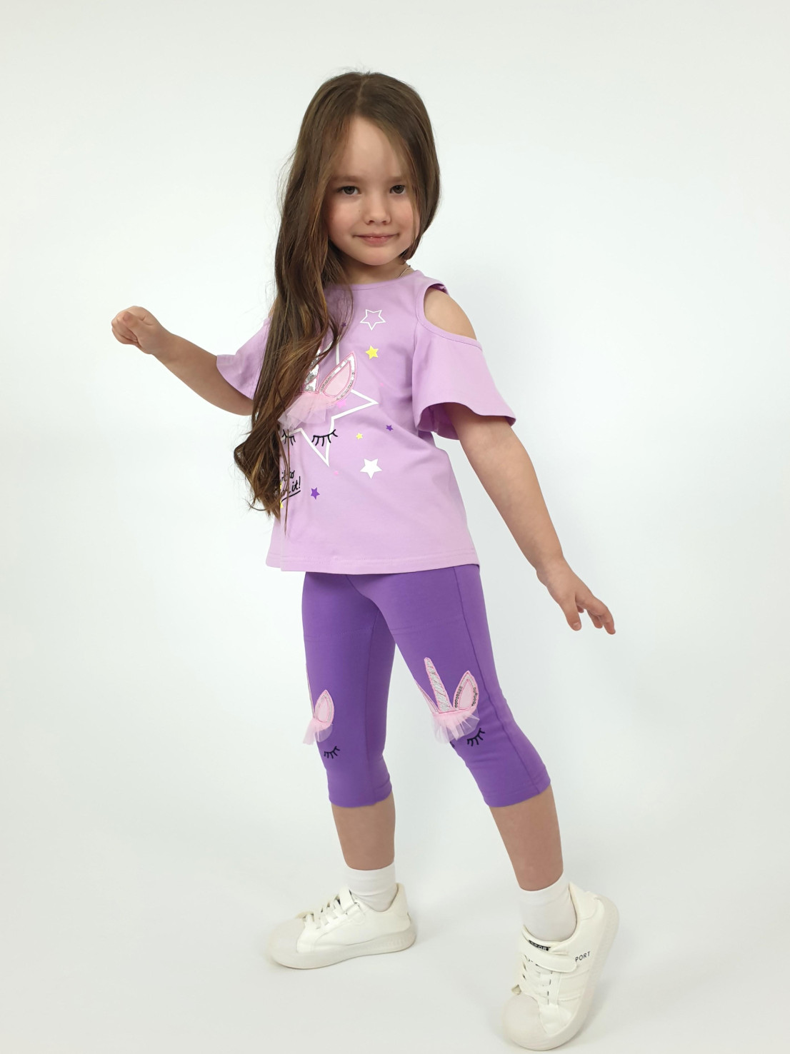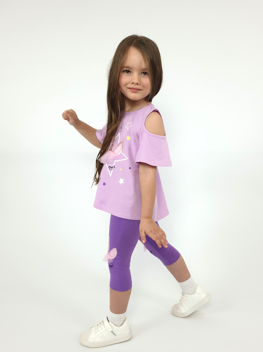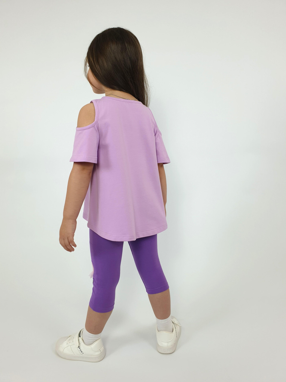 Кулирное полотно:95% х/б,5% лайкра. Фуфайка-силуэт трапеция,печать и вышивка(аппликация) по переду.Рукав втачной с декоративным вырезом на плече.Горловина и вырез на плече окантованы. Лосины-укороченные с вышивкой-аппликацией и отделочным элементом из сетки.