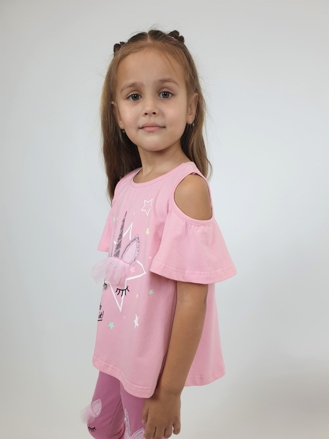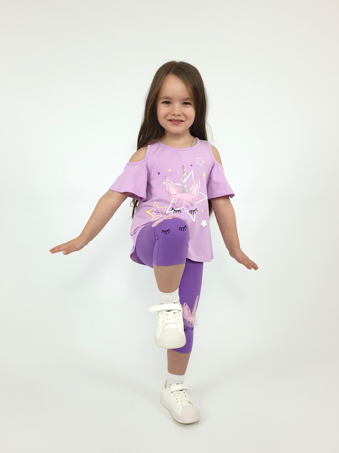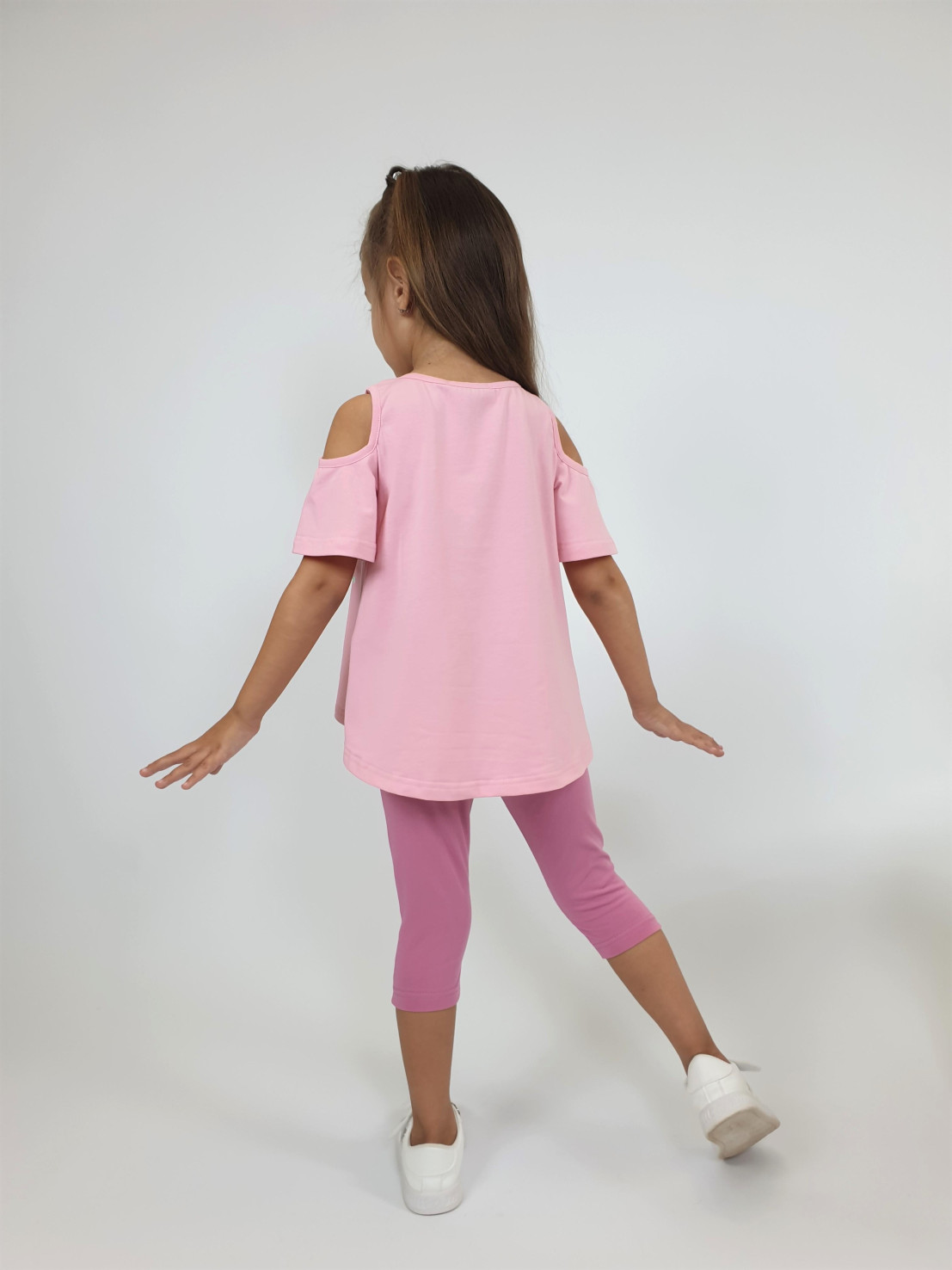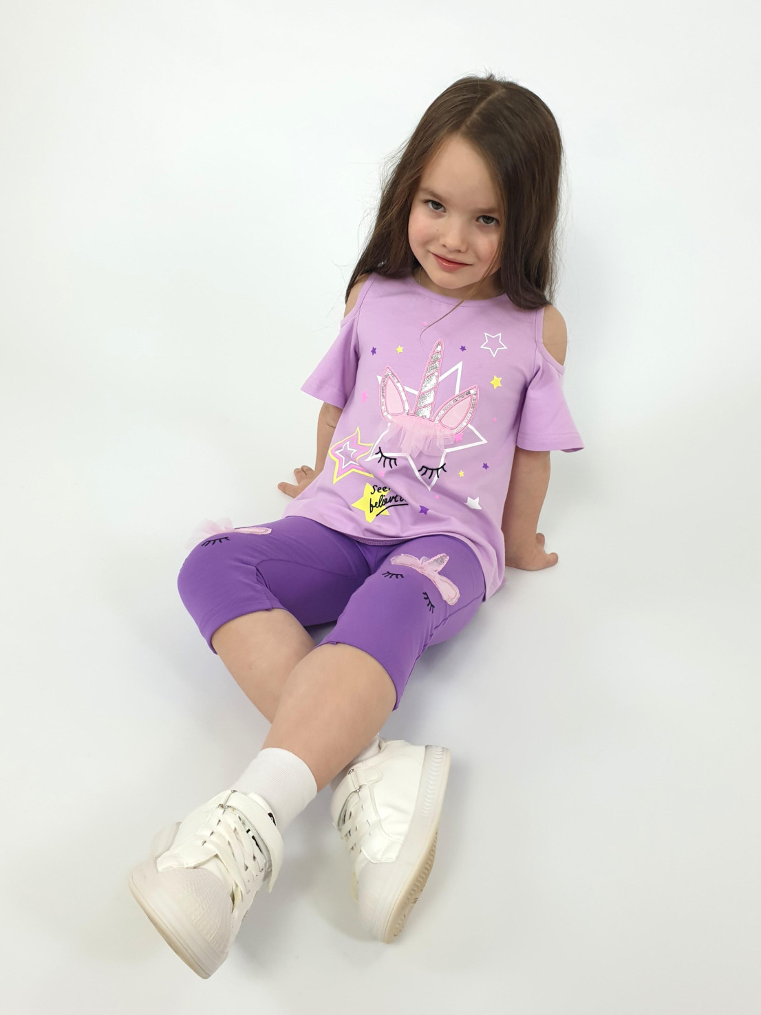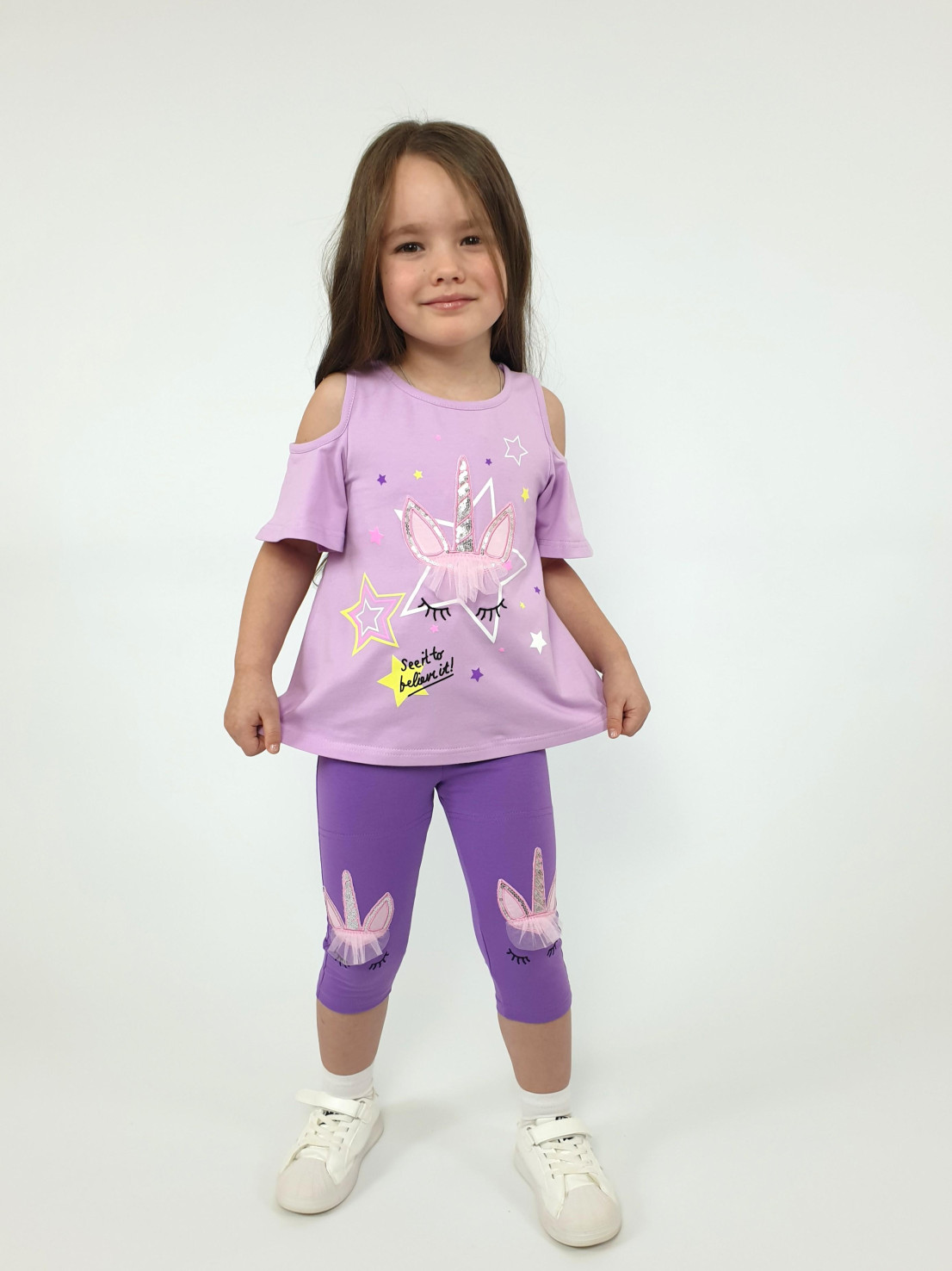 Кулирное полотно:95% х/б,5% лайкра. Фуфайка-силуэт трапеция,печать и вышивка(аппликация) по переду.Рукав втачной с декоративным вырезом на плече.Горловина и вырез на плече окантованы. Лосины-укороченные с вышивкой-аппликацией и отделочным элементом из сетки.