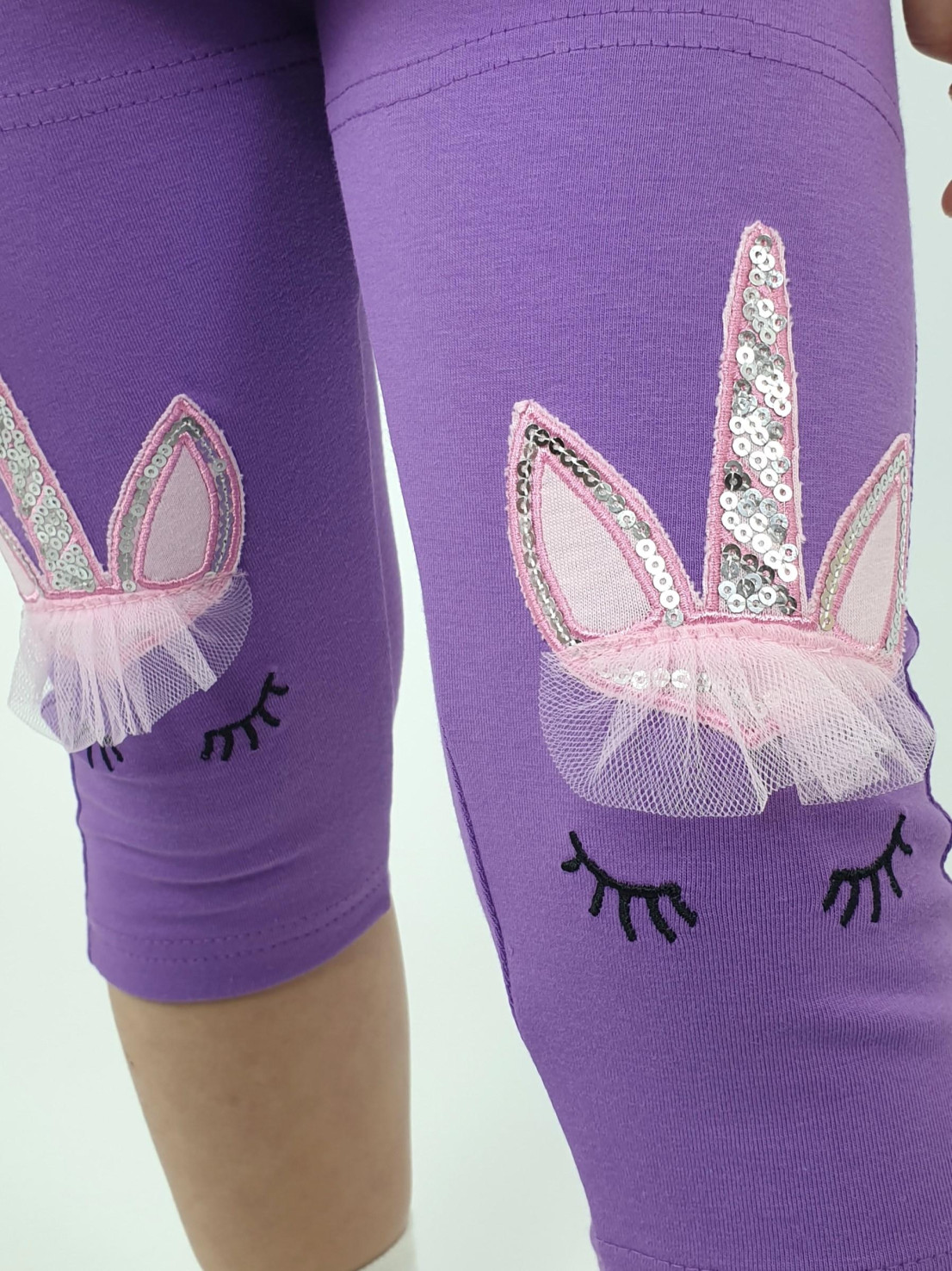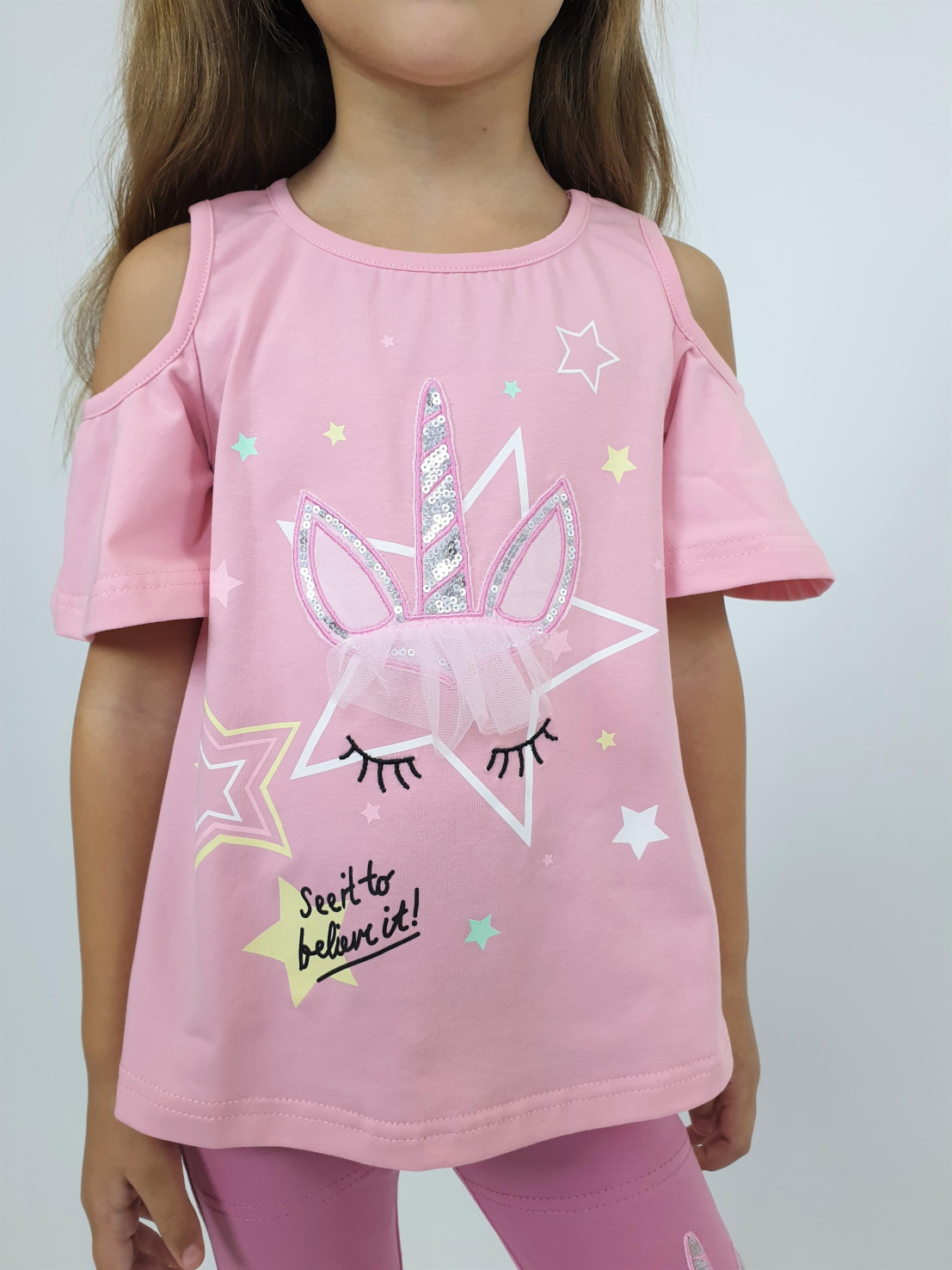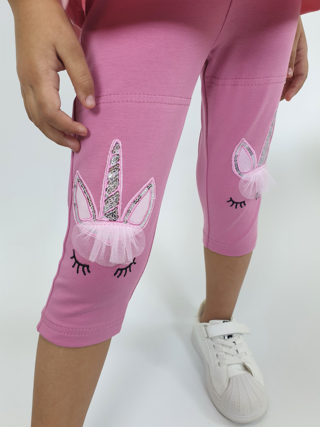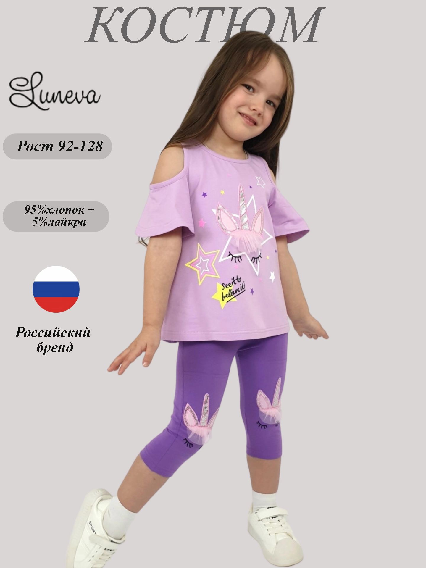 Кулирное полотно:95% х/б,5% лайкра. Фуфайка-силуэт трапеция,печать и вышивка(аппликация) по переду.Рукав втачной с декоративным вырезом на плече.Горловина и вырез на плече окантованы. Лосины-укороченные с вышивкой-аппликацией и отделочным элементом из сетки.