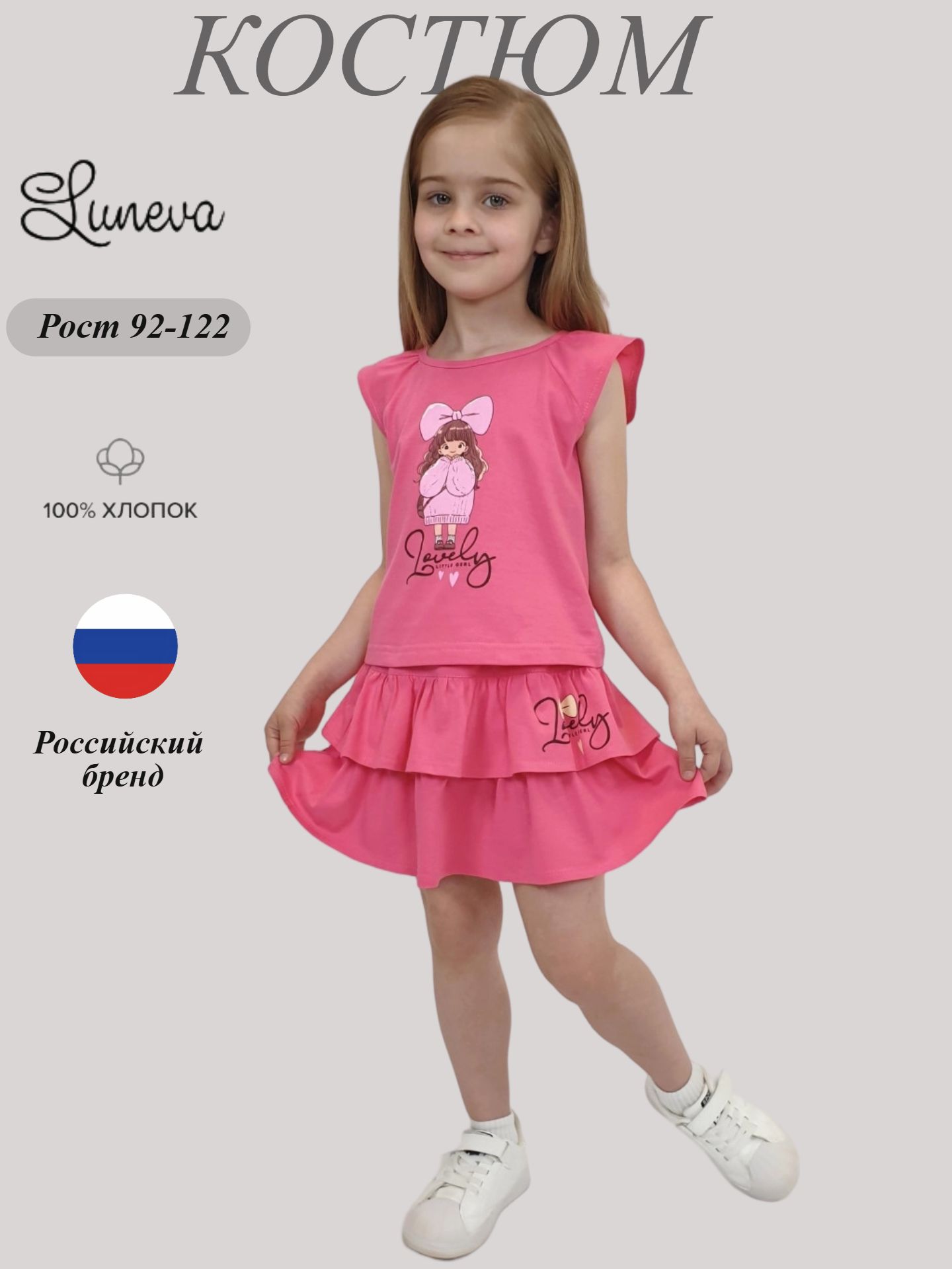 Этот стильный комплект покорит сердца маленьких модниц! Яркая фуфайка прямого кроя из мягкого кулирного полотна украшена привлекательной печатью и удобной горловиной-регланом. Укороченную длину дополняет милый образ юбки-кокетки с рюшами и эластичной вставкой. Для комфорта и безопасности используется исключительно натуральный материал – стопроцентный хлопок. Бренд Lunева предлагает качество и стиль, которые оценят мамы и малышки.
