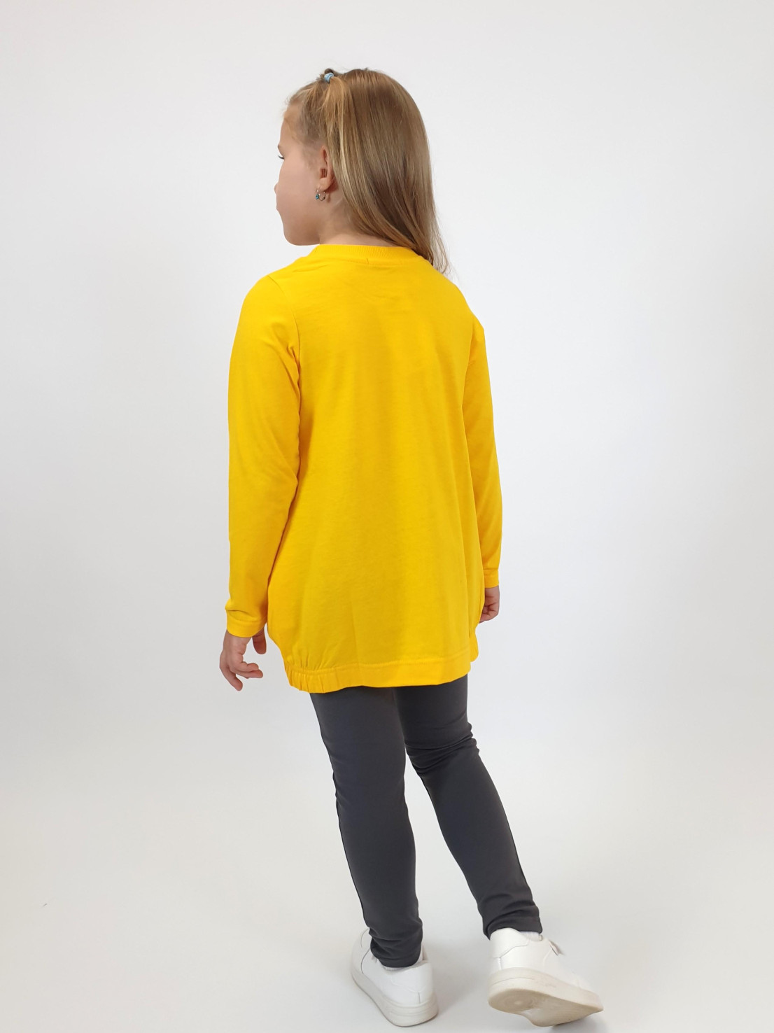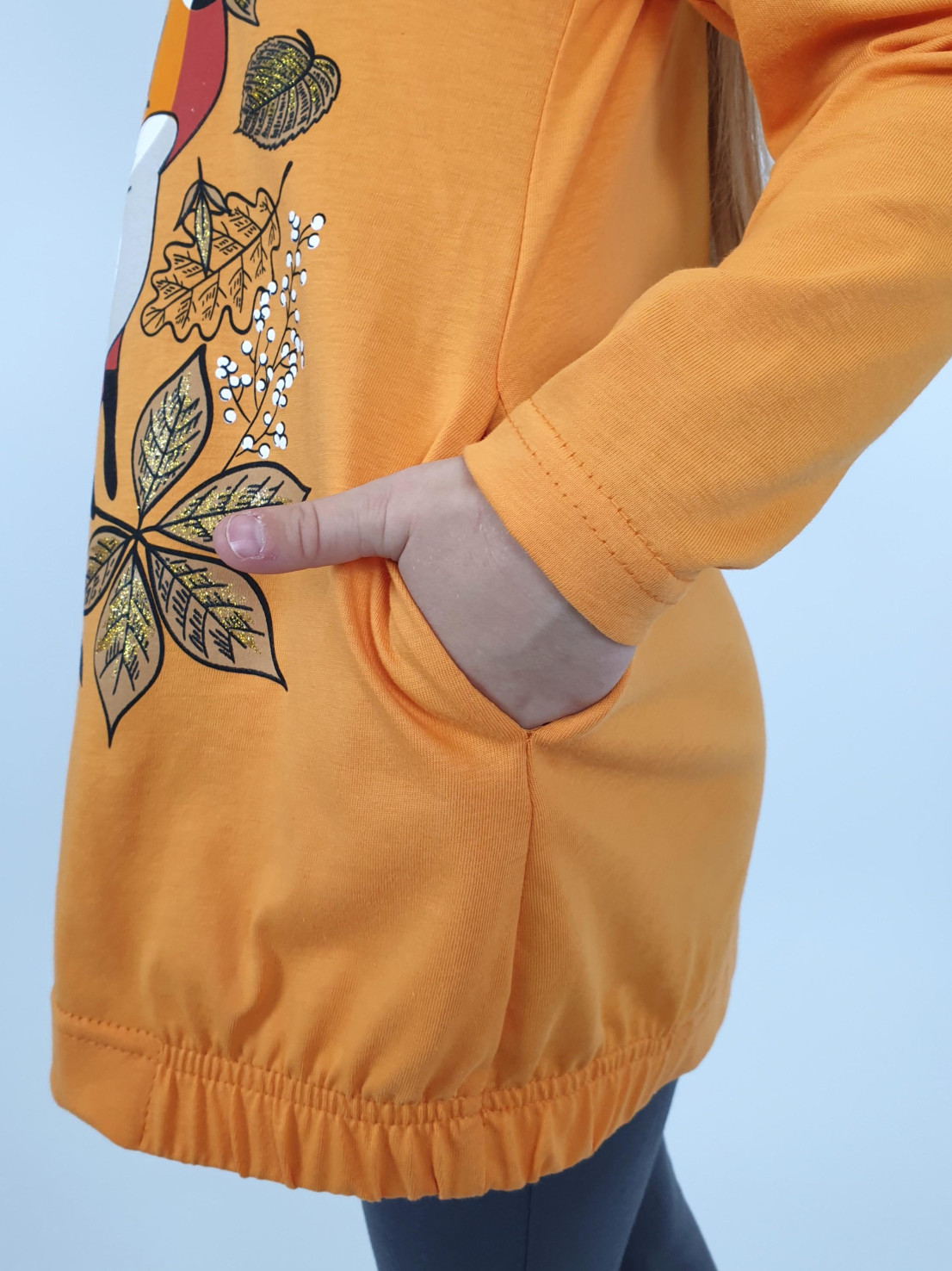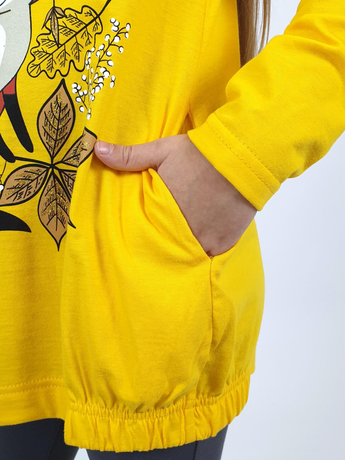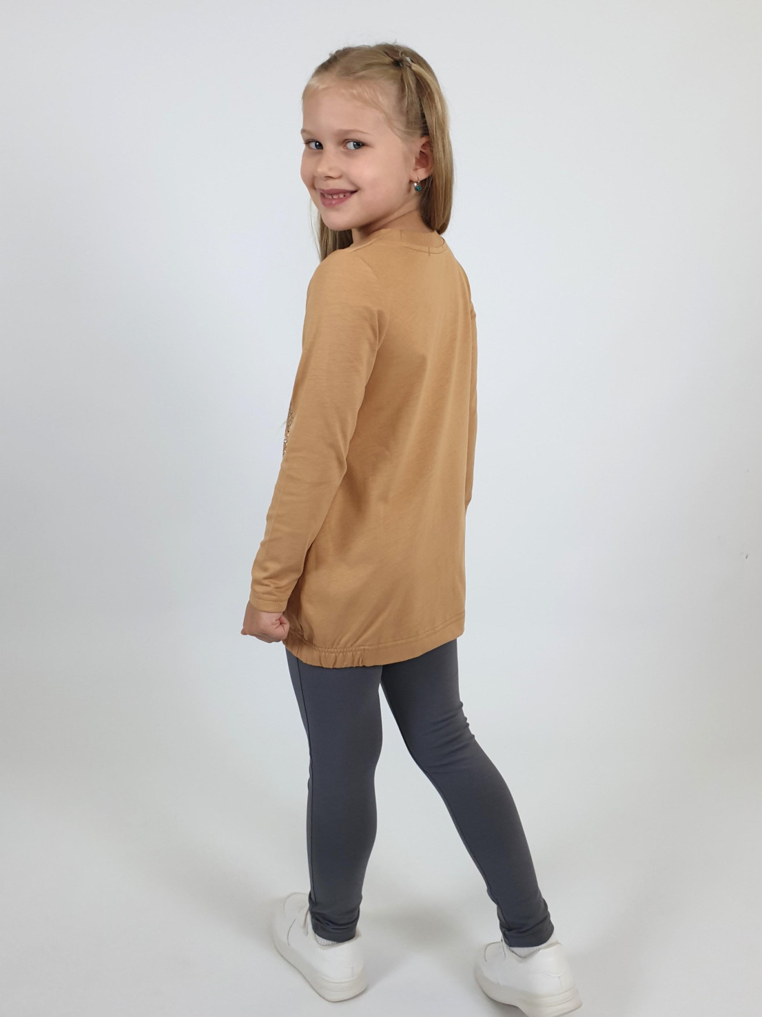 Кулирное полотно:100% х/б.-джемпер,95% х/б,5% лайкра-лосины. Джемпер-свободный,с печатью по переду,с двумя карманами в боковых швах.Рукав втачной,длинный.Низ изделия подшит с резинкой по боковым швам.Горловина обработана ластиком. Лосины-длинные,печать на правой передней половинке внизу.Вверху на резинке.