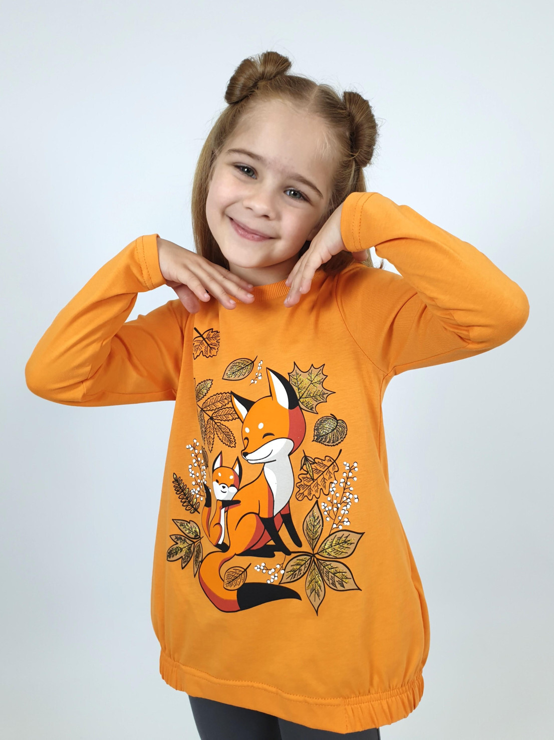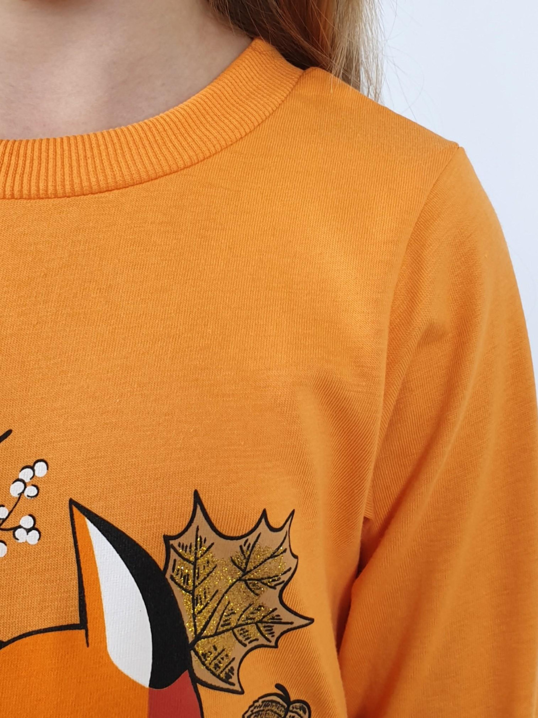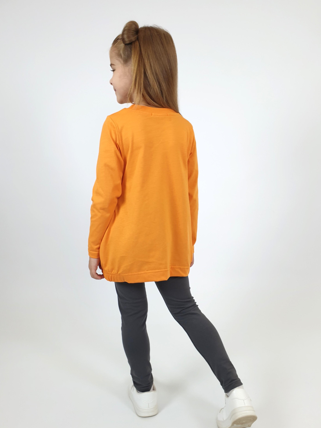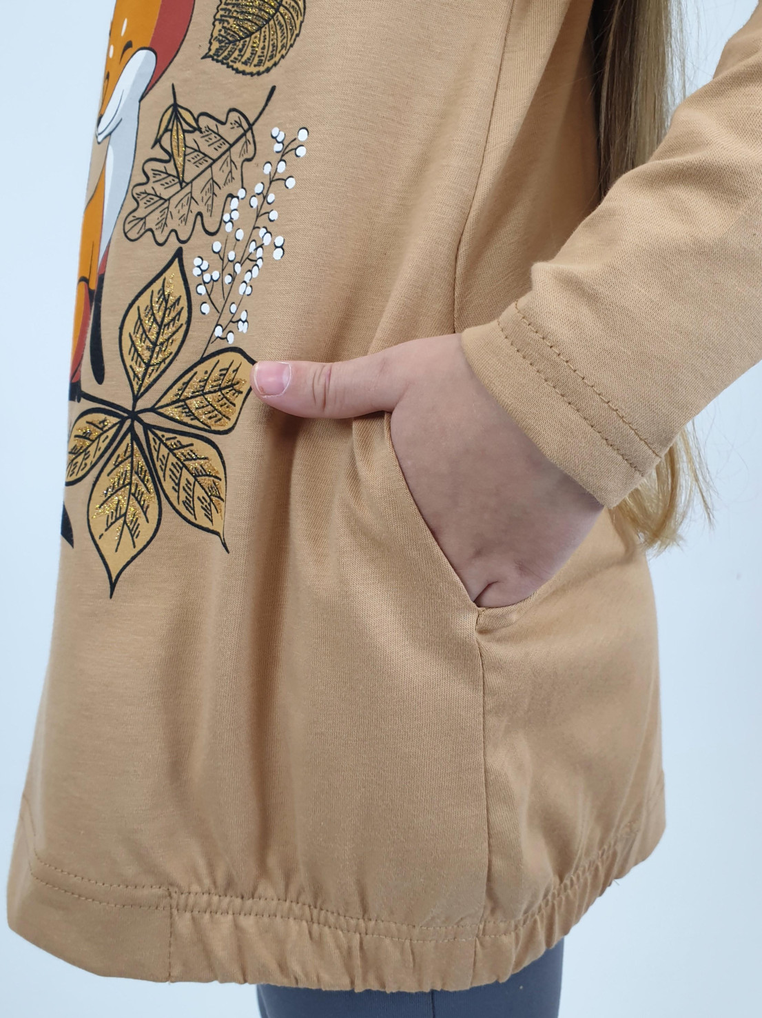 Кулирное полотно:100% х/б.-джемпер,95% х/б,5% лайкра-лосины. Джемпер-свободный,с печатью по переду,с двумя карманами в боковых швах.Рукав втачной,длинный.Низ изделия подшит с резинкой по боковым швам.Горловина обработана ластиком. Лосины-длинные,печать на правой передней половинке внизу.Вверху на резинке.