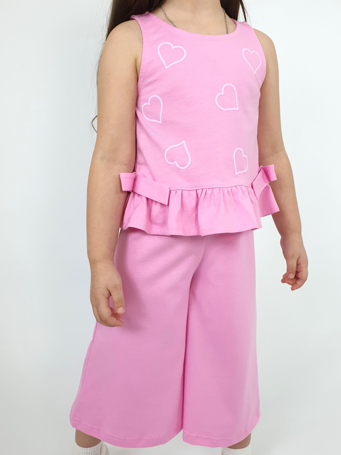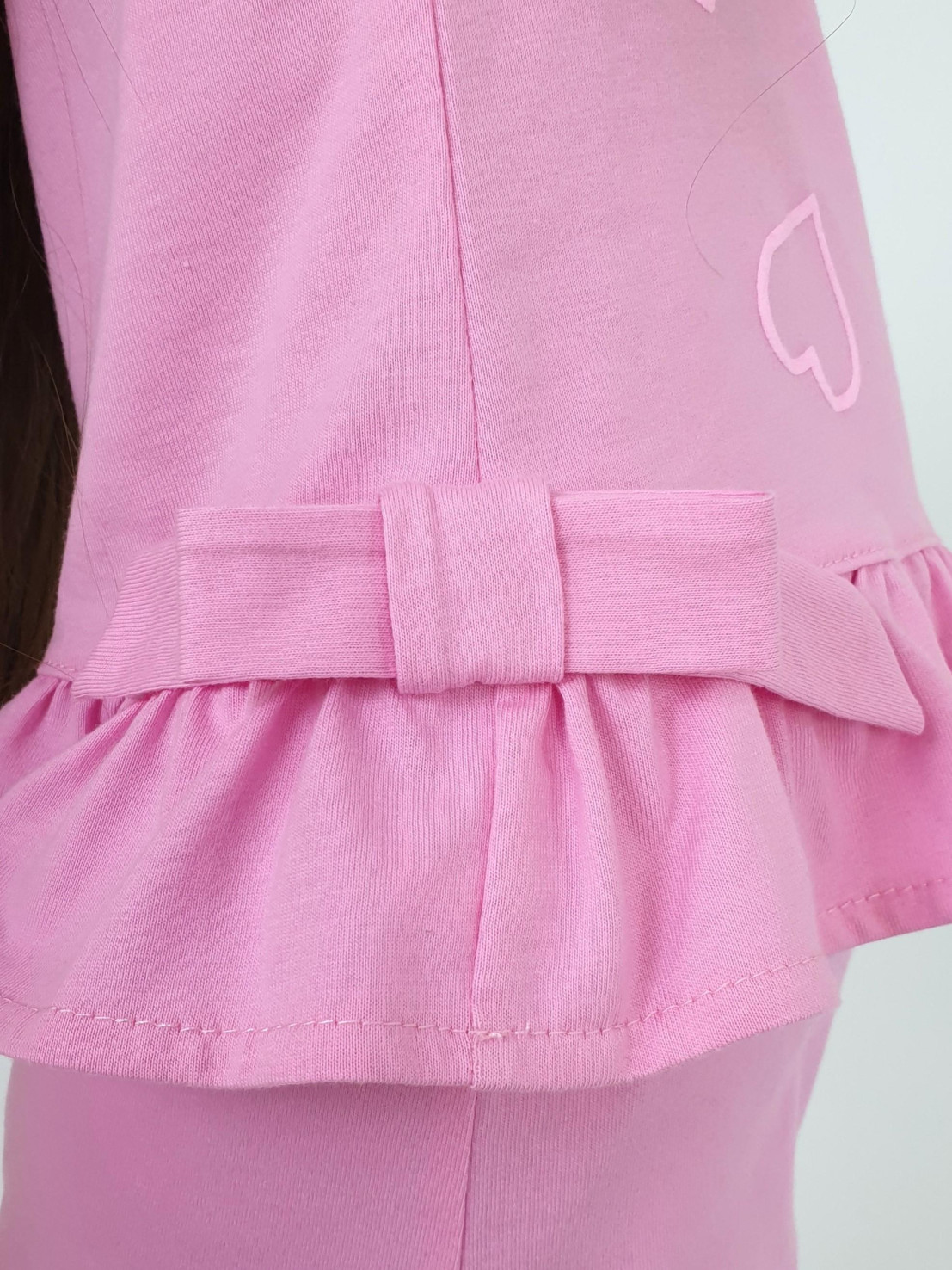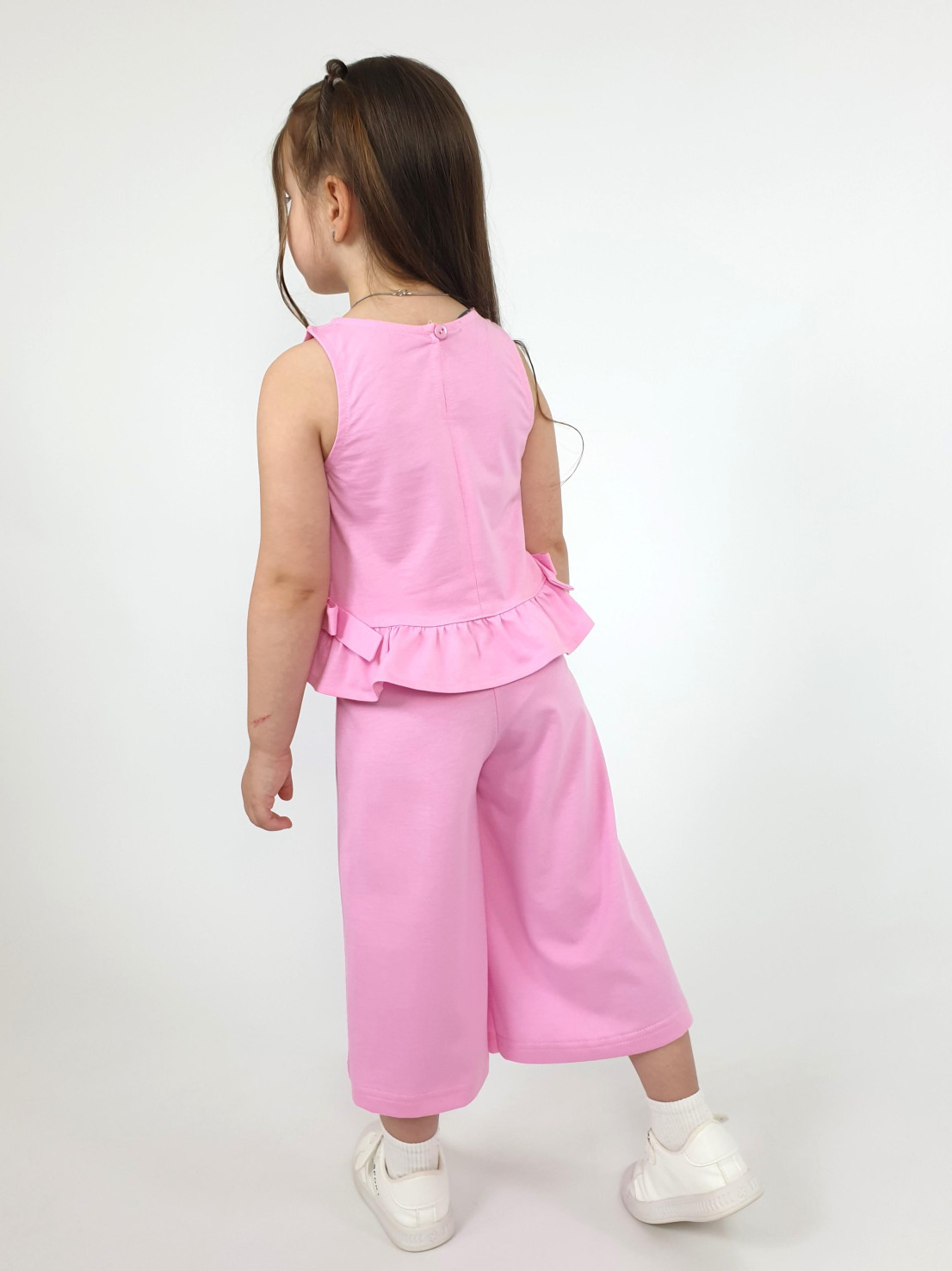 Кулирное полотно:100% х/б. Туника-силуэт трапеция,без рукава,с рюшей внизу.Горловина,пройма окантованы и подшиты.Застежка по спинке на пуговицу.Отделочные бантики внизу на боковом шве.Печать на переде. Брюки-укороченные,расширены к низу,пояс с резинкой.
