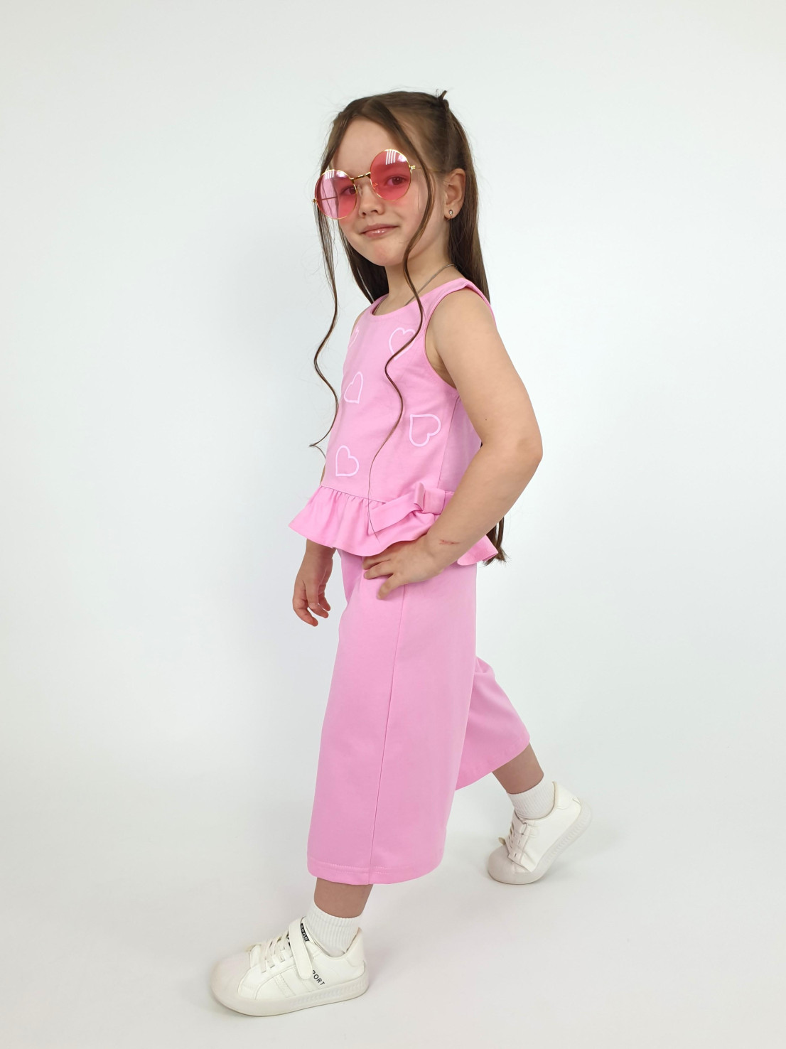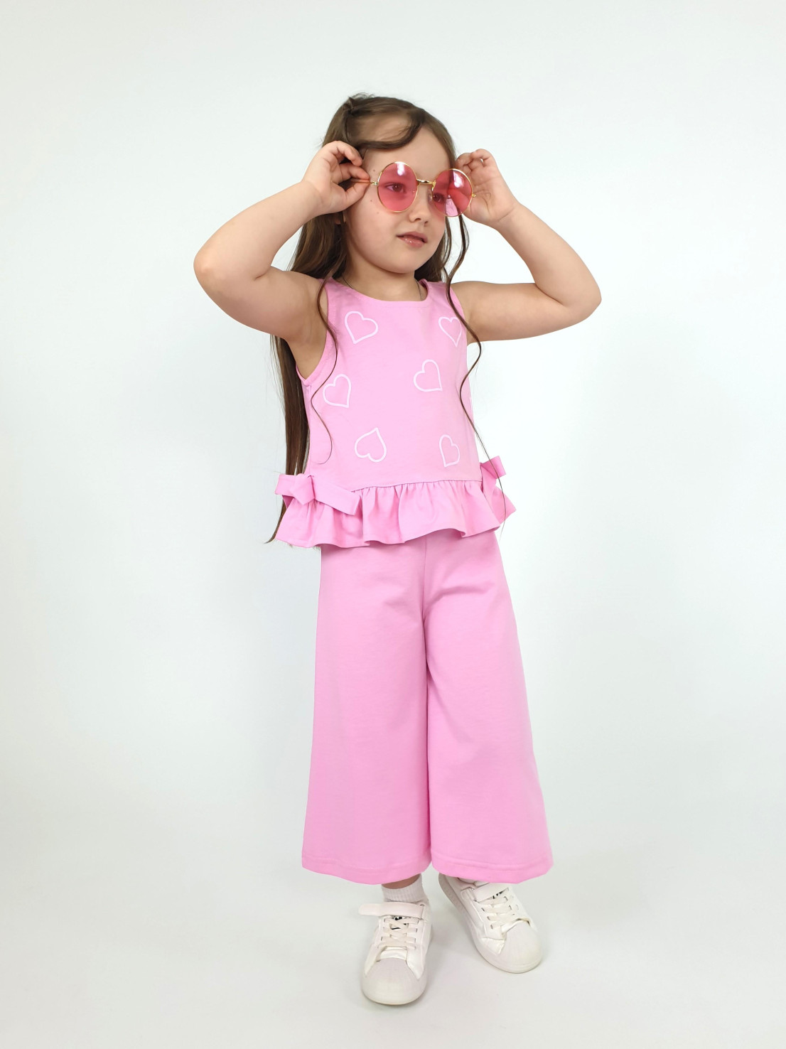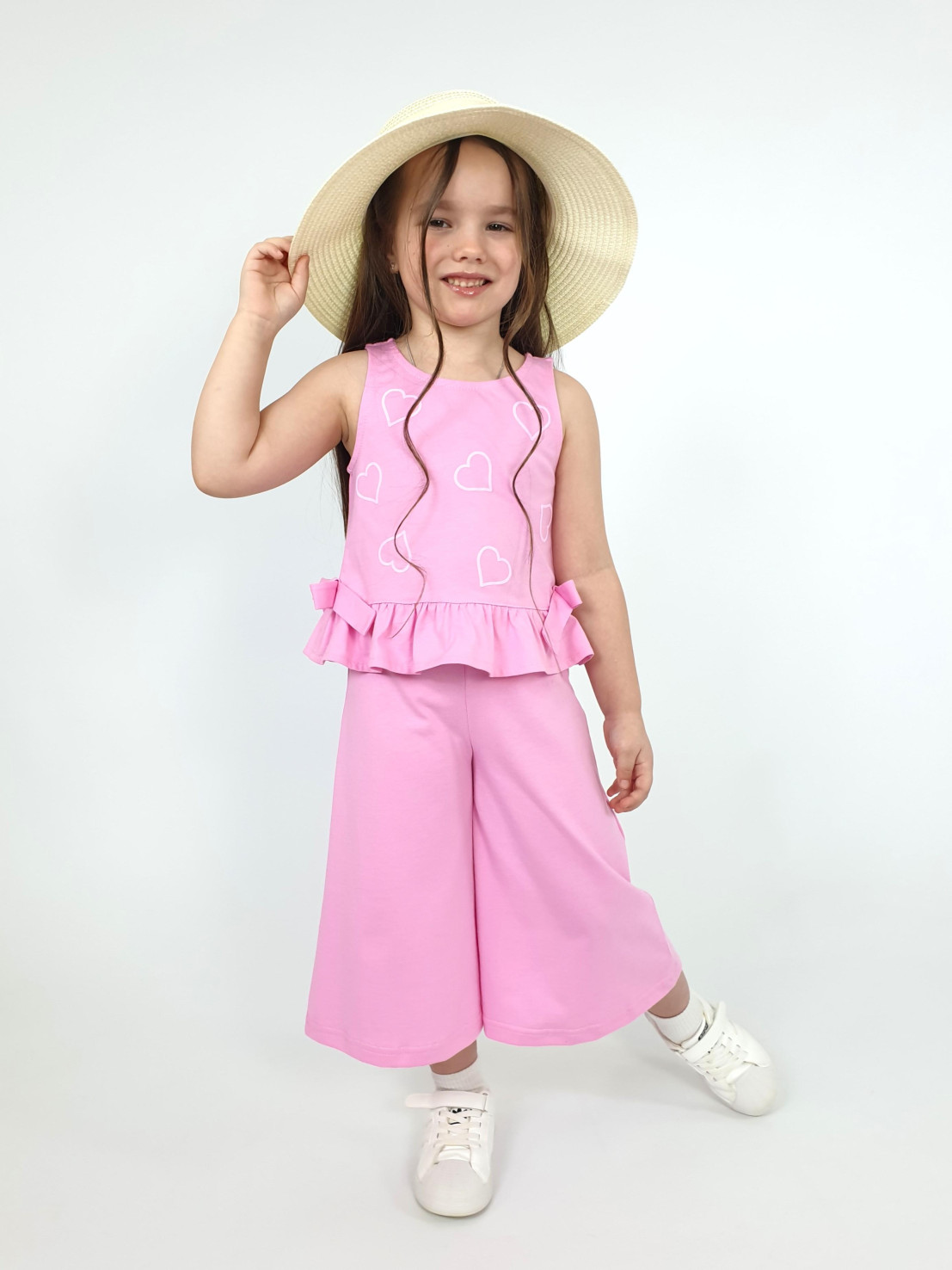 Кулирное полотно:100% х/б. Туника-силуэт трапеция,без рукава,с рюшей внизу.Горловина,пройма окантованы и подшиты.Застежка по спинке на пуговицу.Отделочные бантики внизу на боковом шве.Печать на переде. Брюки-укороченные,расширены к низу,пояс с резинкой.