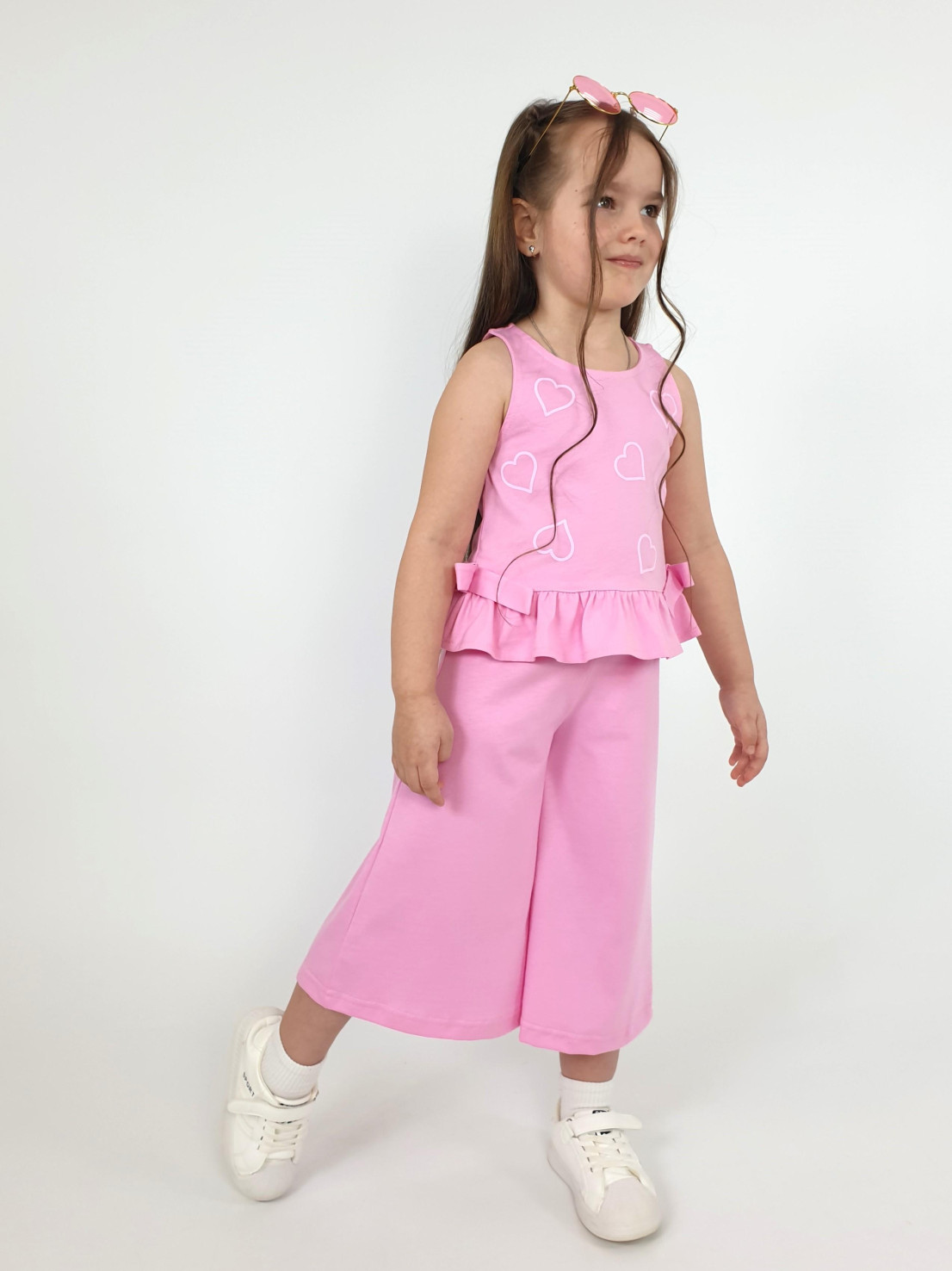 Этот очаровательный комплект от бренда Lunева — идеальный выбор для маленьких принцесс! Комплект включает нежную тунику-трапецию без рукавов с элегантной рюшью и брюки-куlotte с удобным эластичным поясом. Печать на передней части туники добавит образу оригинальности. Изделия из мягкого кулирного полотна (100% хлопок) обеспечат комфорт даже самым активным малышкам.