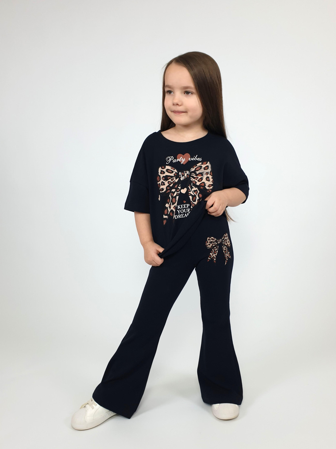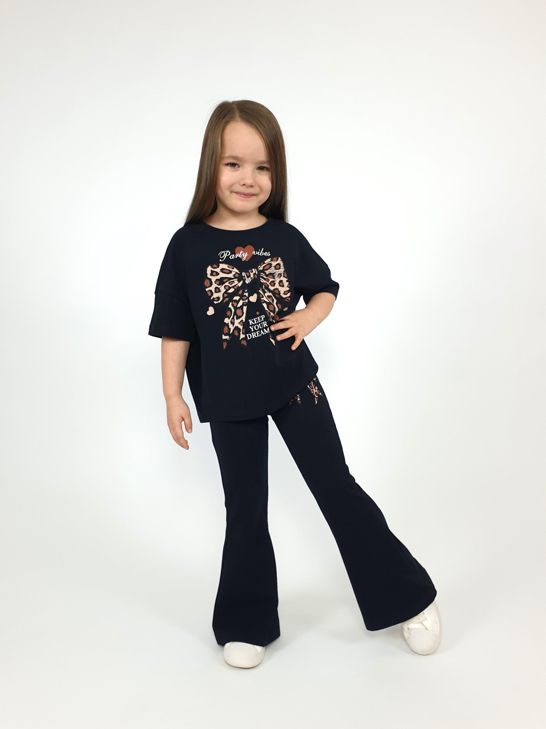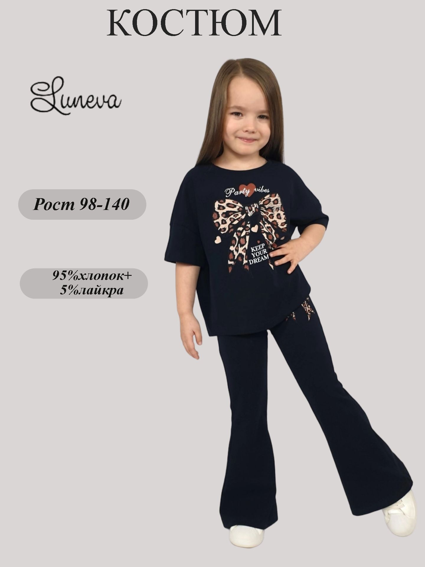 Этот стильный комплект идеально подойдет маленькой моднице! Яркий дизайн, современный оверсайз джемпер со спущенным плечом и удобные брюки-слим – это именно то, что нужно для создания оригинального образа. Черный цвет делает наряд универсальным и легко комбинируемым с другими элементами гардероба. Сделано в России с использованием качественных материалов от бренда Lunева.
