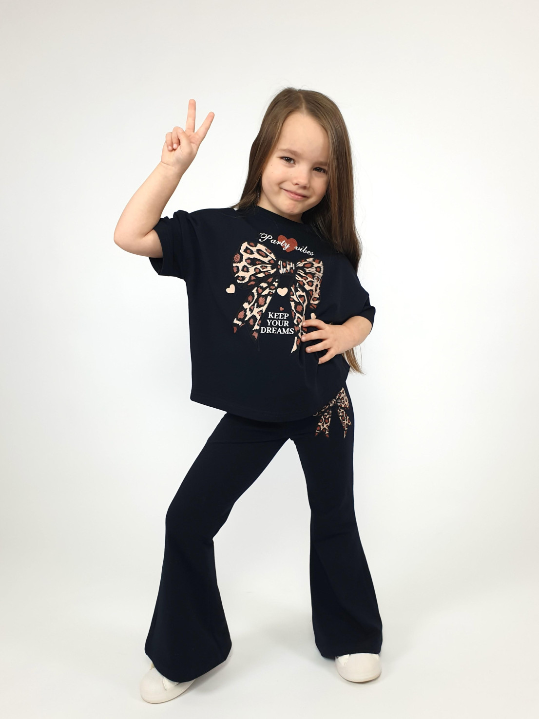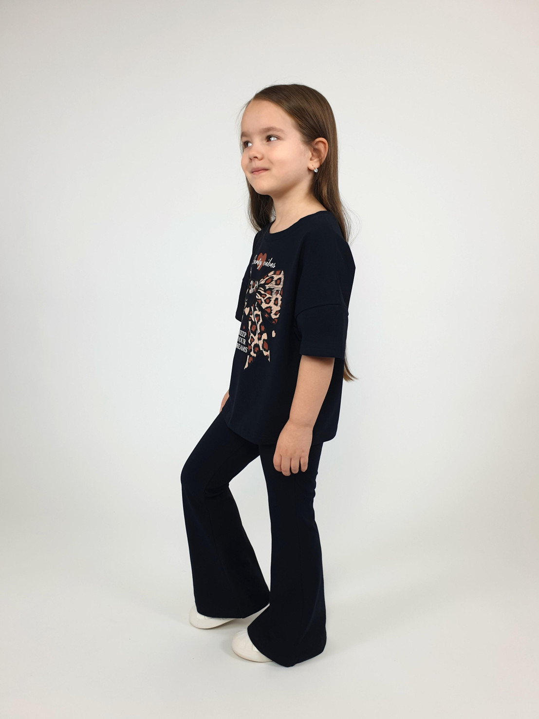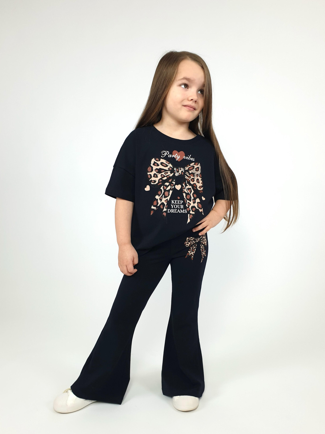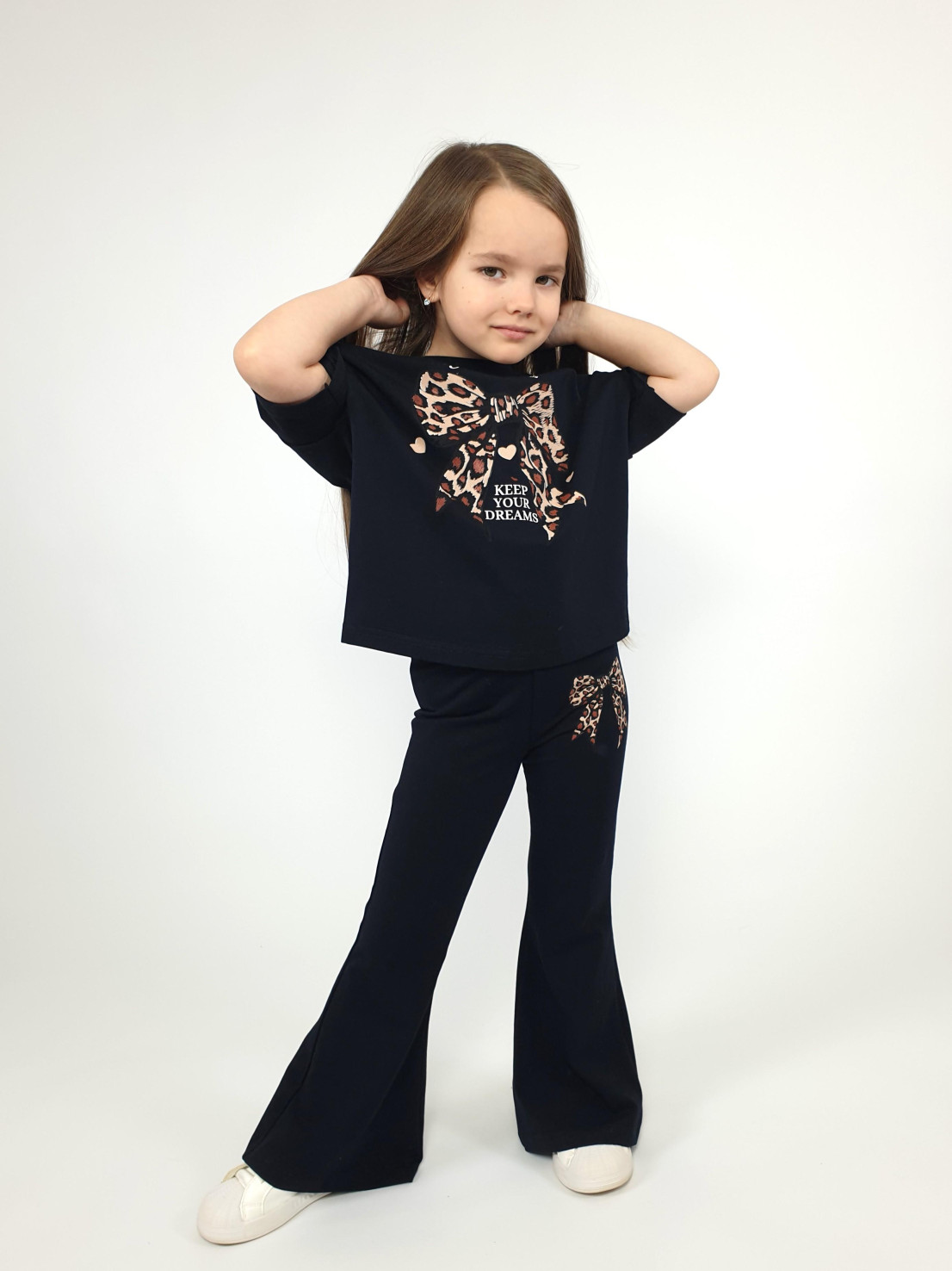 Этот стильный комплект идеально подойдет маленькой моднице! Яркий дизайн, современный оверсайз джемпер со спущенным плечом и удобные брюки-слим – это именно то, что нужно для создания оригинального образа. Черный цвет делает наряд универсальным и легко комбинируемым с другими элементами гардероба. Сделано в России с использованием качественных материалов от бренда Lunева.