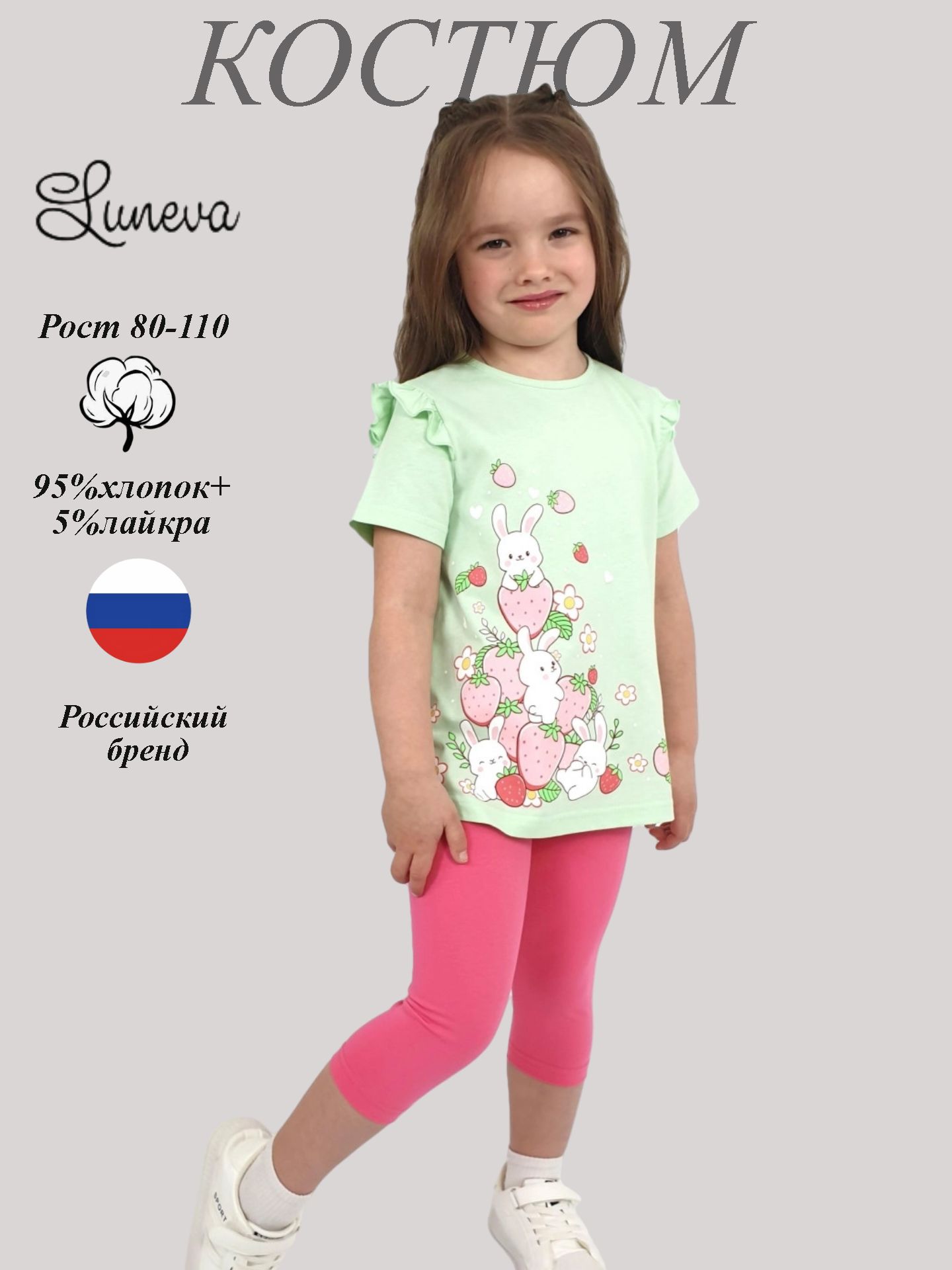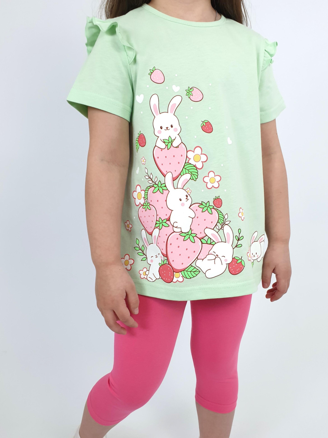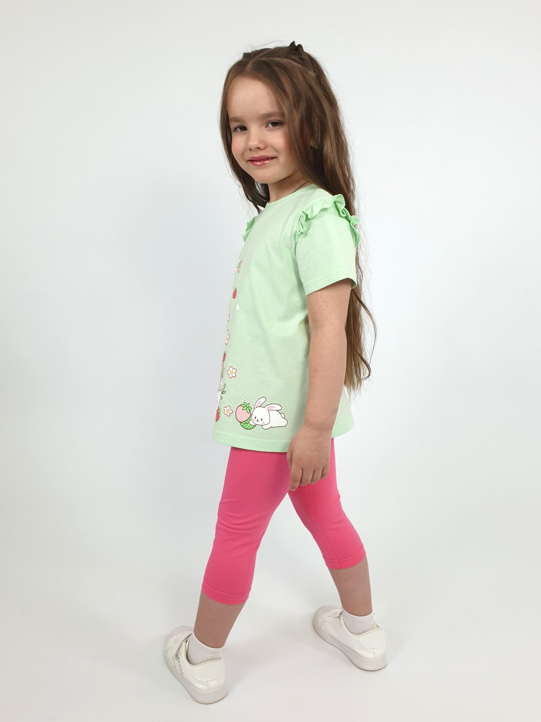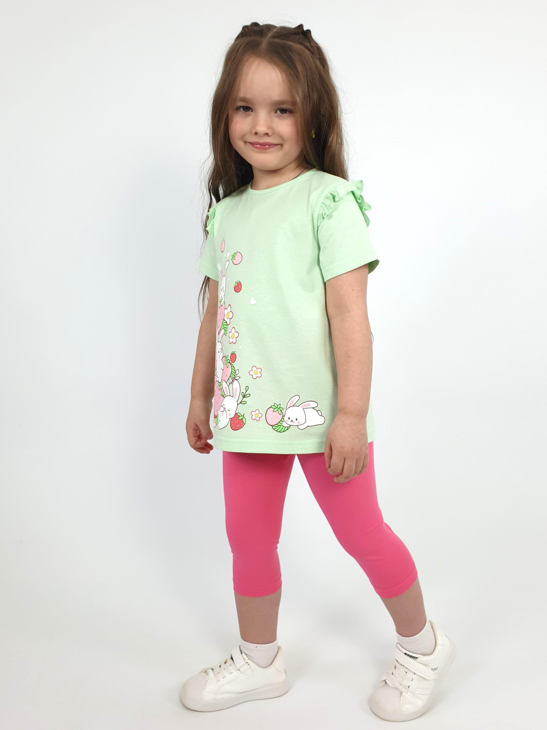 Кулирное полотно:100% х/б;95% х/б,5% лайкра. Джемпер-силуэт трапеция,короткий втачной рукав,в пройме рюша.Горловина окантована,застежка на пуговицу по спинке.Печать на переде. Лосины-укороченные вверху на резинке.