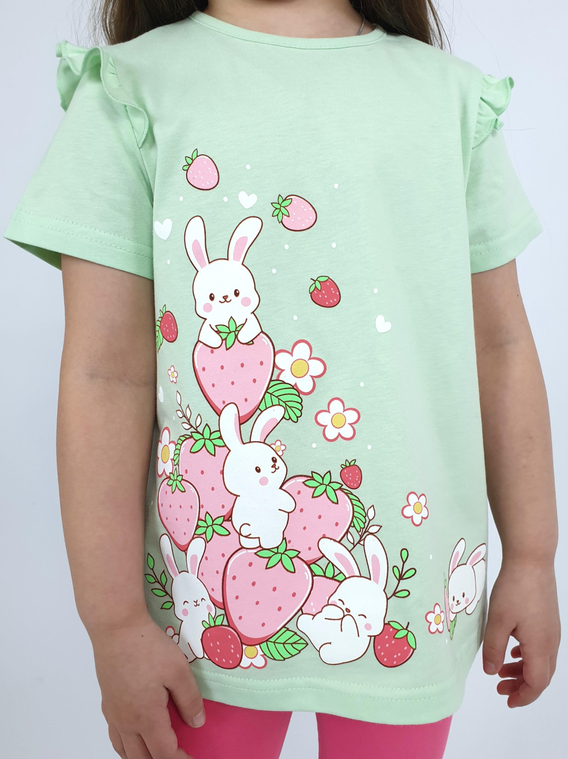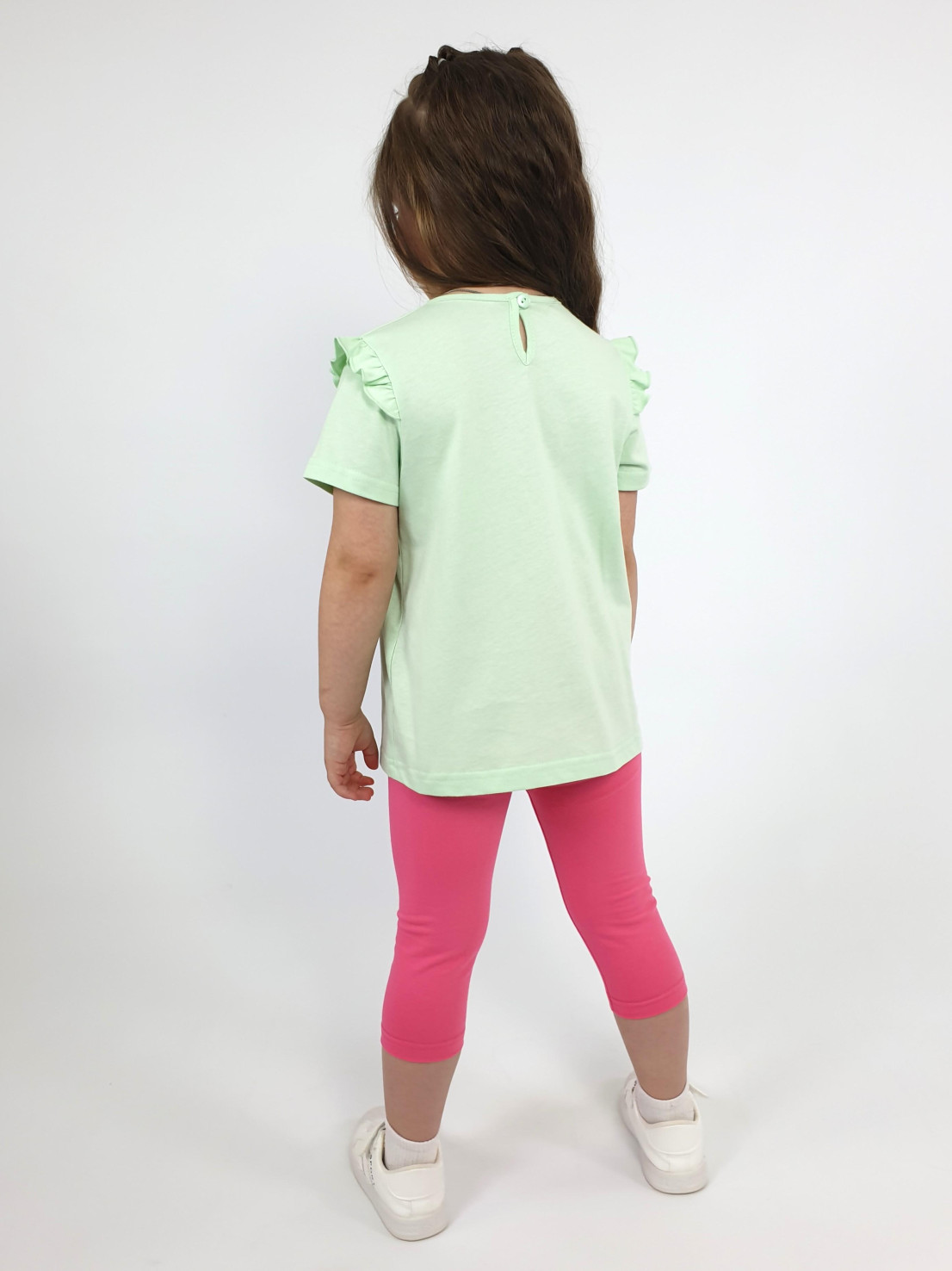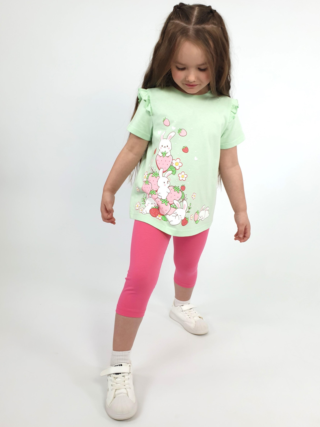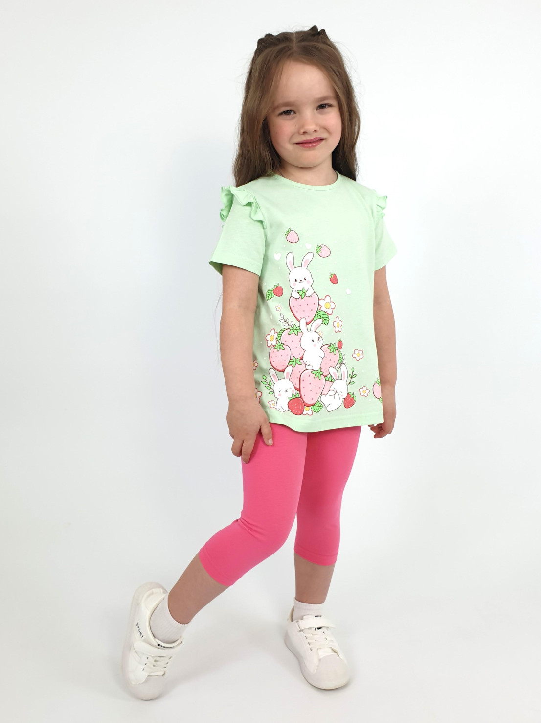 Кулирное полотно:100% х/б;95% х/б,5% лайкра. Джемпер-силуэт трапеция,короткий втачной рукав,в пройме рюша.Горловина окантована,застежка на пуговицу по спинке.Печать на переде. Лосины-укороченные вверху на резинке.