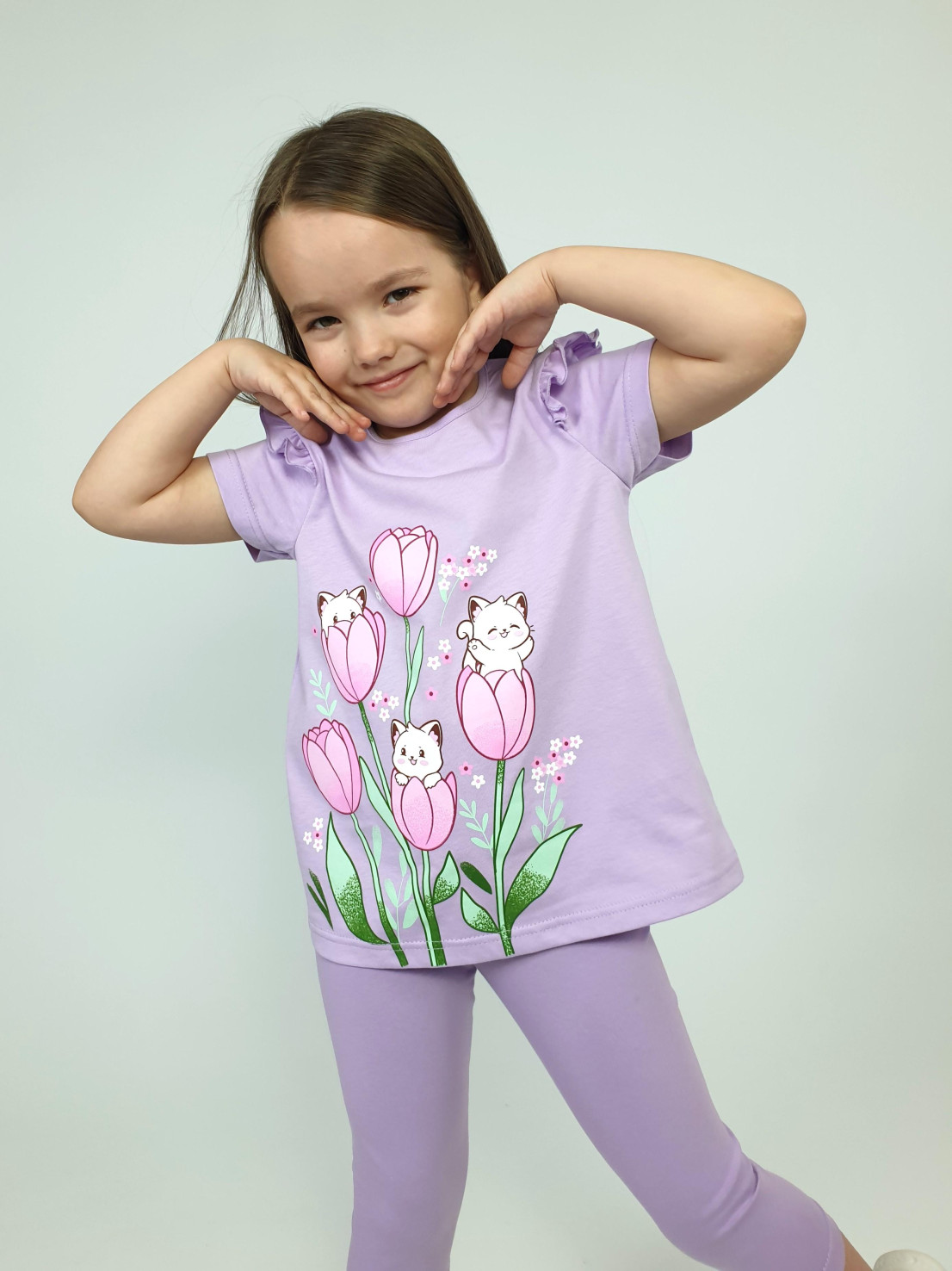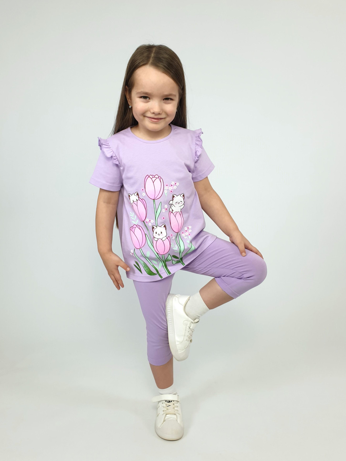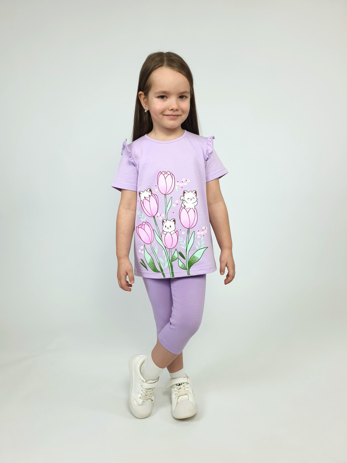 Изготавливаются в России с любовью к каждой деталькой! Комплект от бренда Luneva — это сочетание комфорта хлопка (футболка 100%, лосины 95%) и удобного эластана (5%). Визуально расширяет фигуру благодаря фасону "трапеция" и игривой рюшечке! Добавьте стильности с пёрышком цвета или забавной надписью впереди – прекрасный выбор для маленьких принцесс!