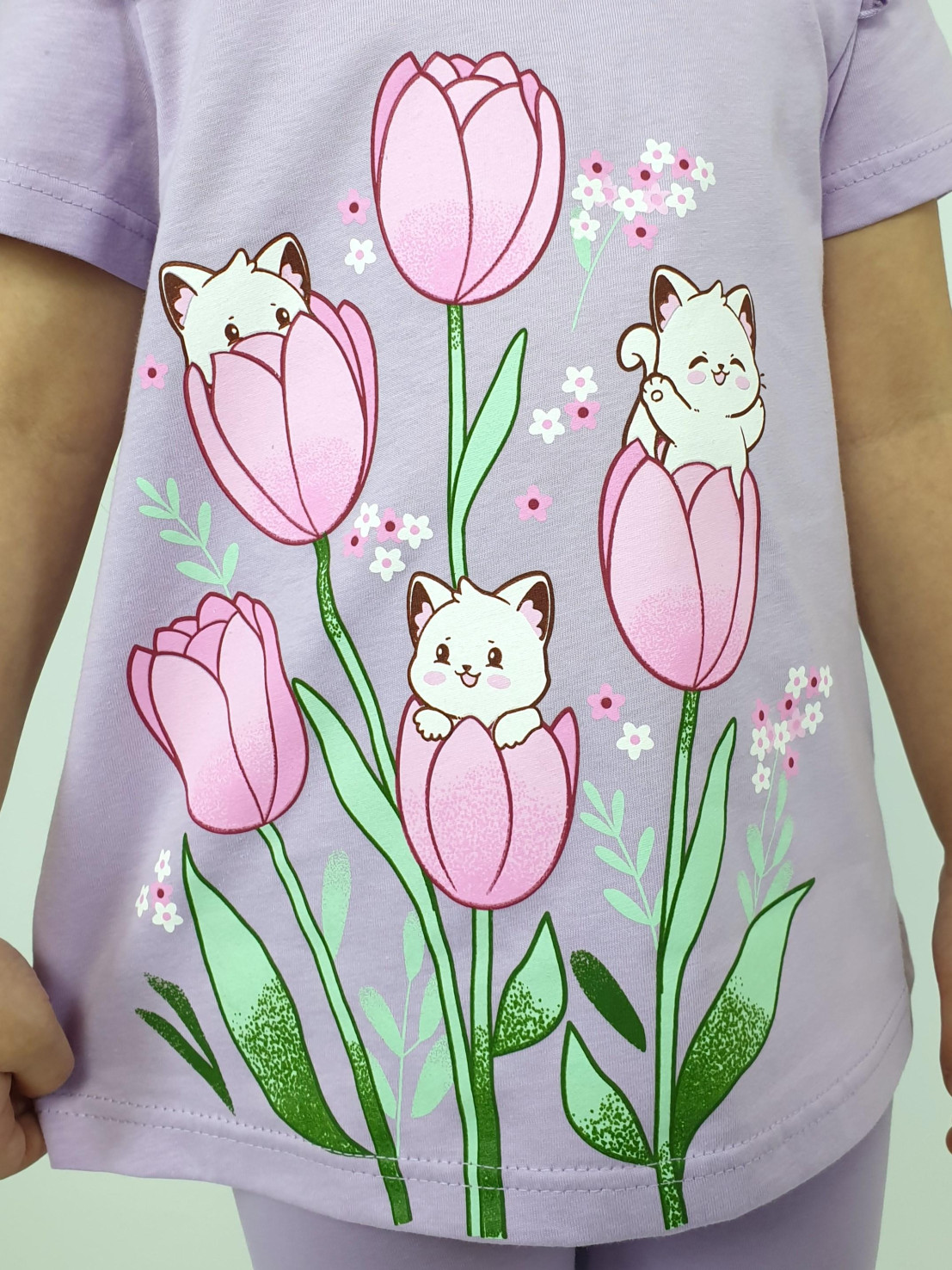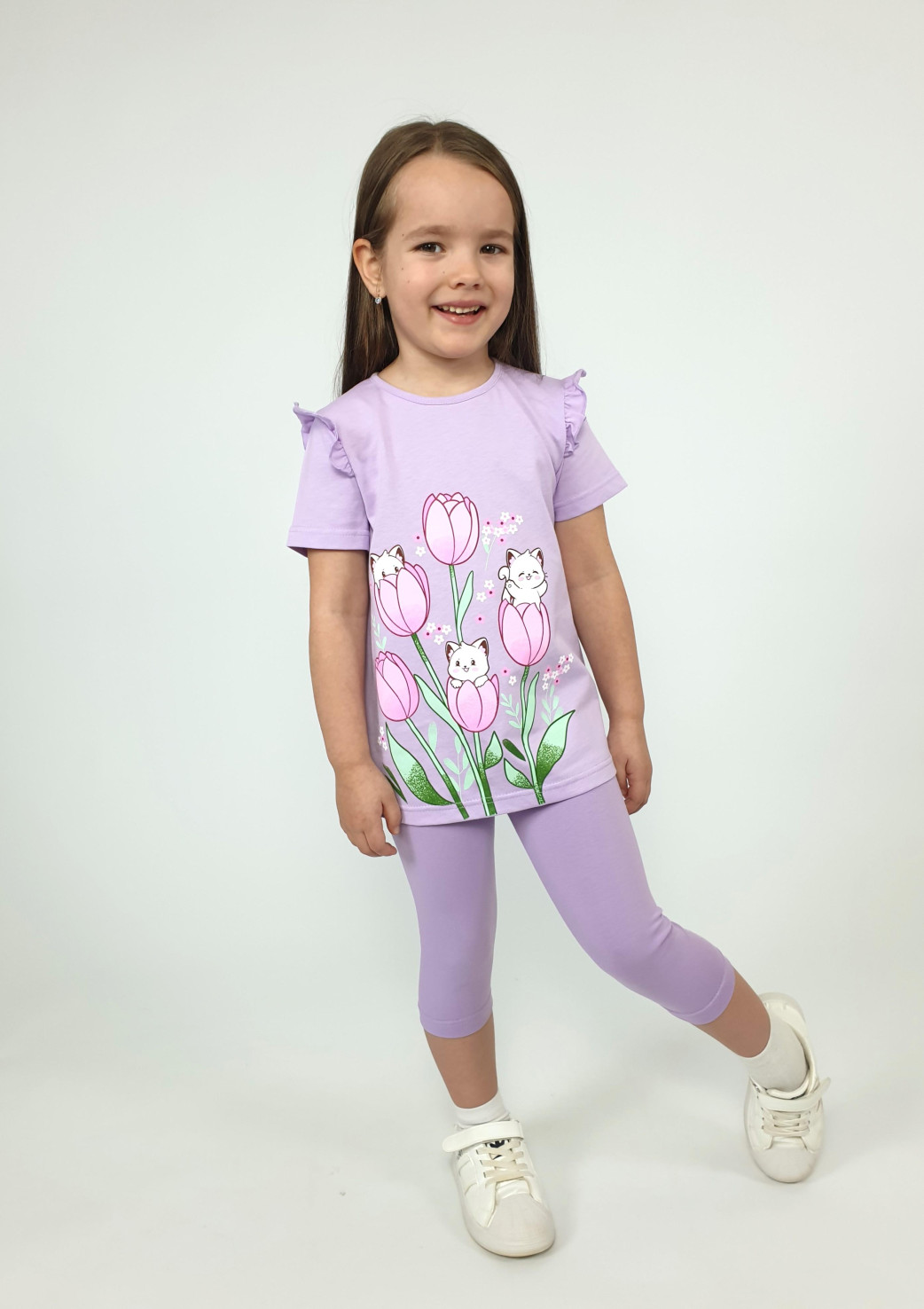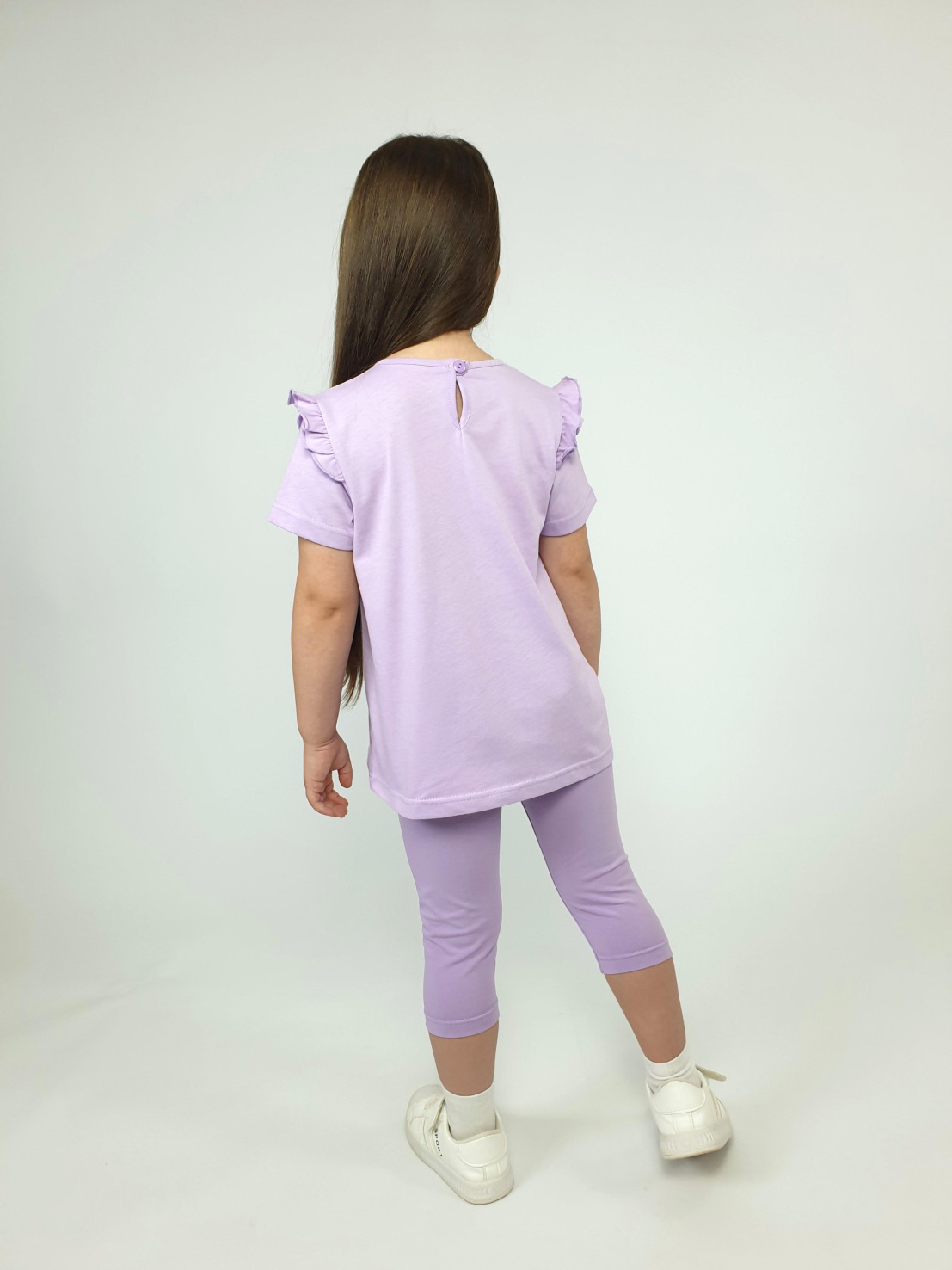 Кулирное полотно:100% х/б;95% х/б,5% лайкра. Джемпер-силуэт трапеция,короткий втачной рукав,в пройме рюша.Горловина окантована,застежка на пуговицу по спинке.Печать на переде. Лосины-укороченные вверху на резинке.