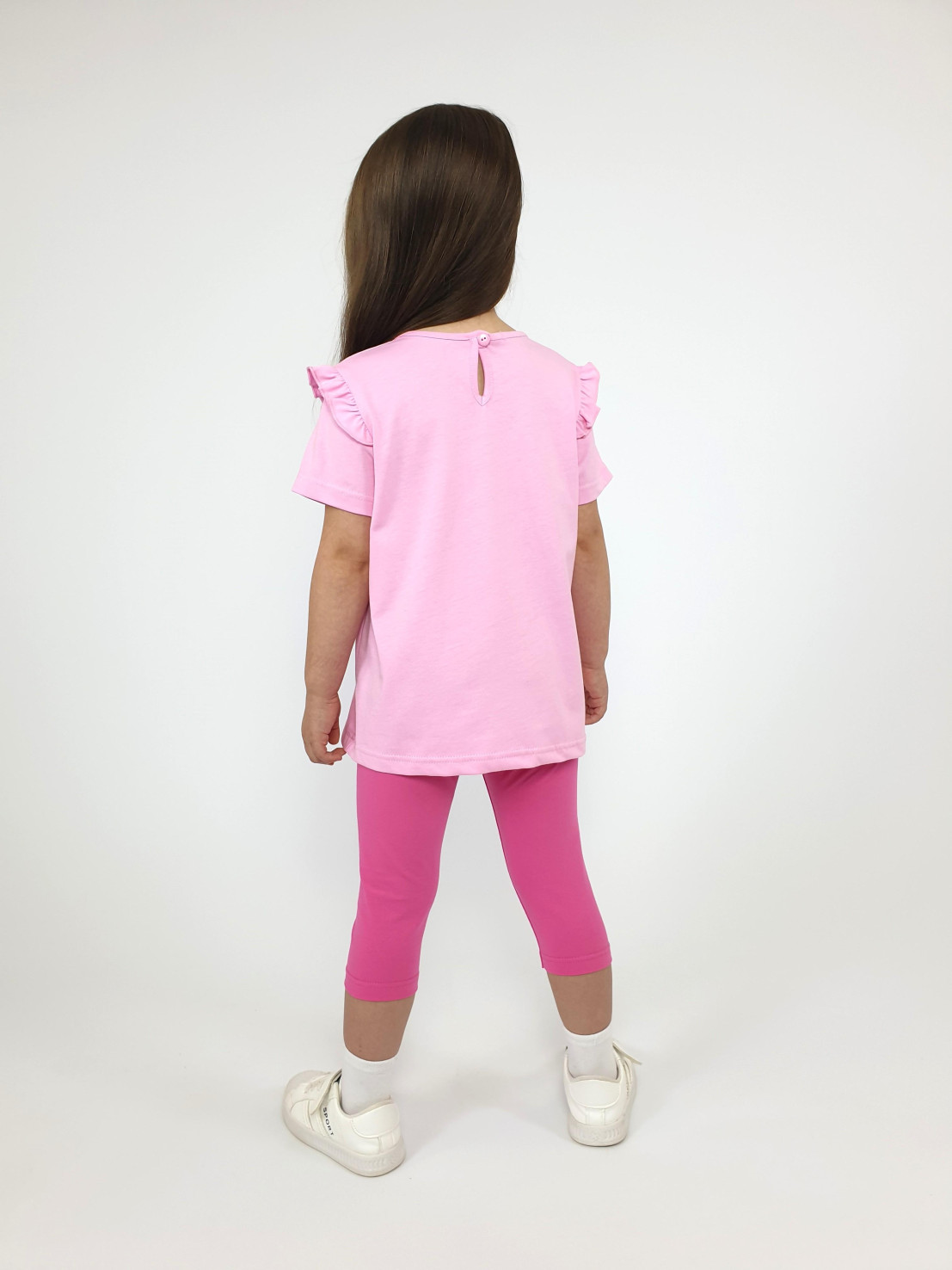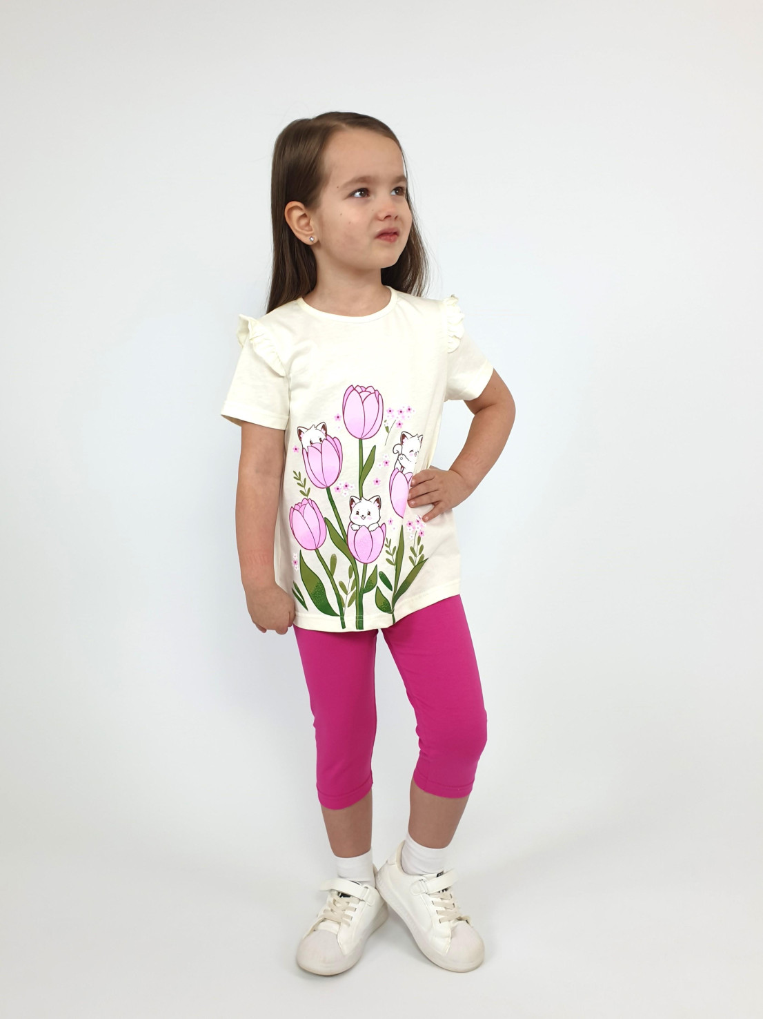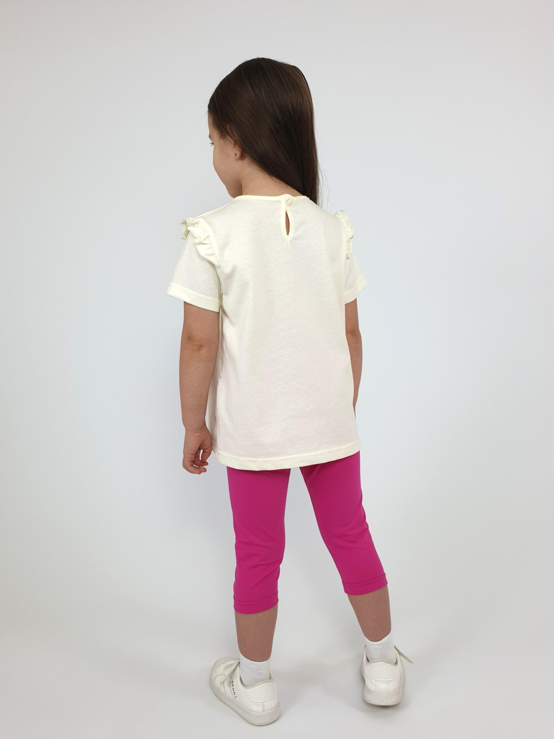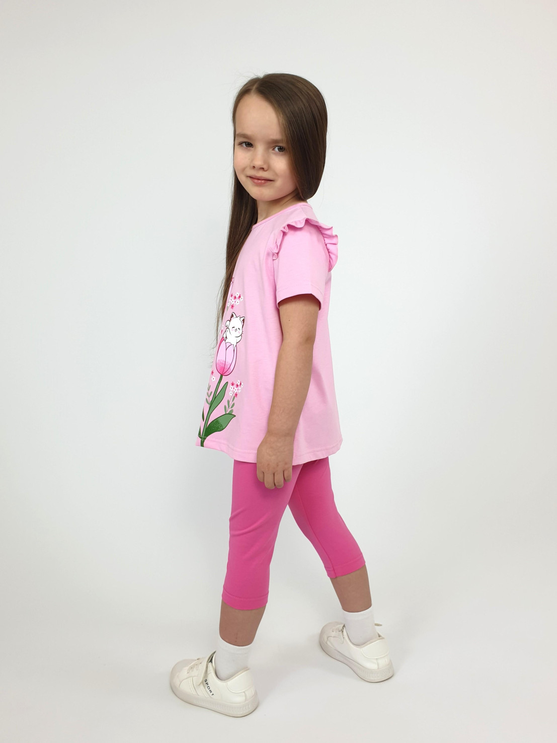 Кулирное полотно:100% х/б;95% х/б,5% лайкра. Джемпер-силуэт трапеция,короткий втачной рукав,в пройме рюша.Горловина окантована,застежка на пуговицу по спинке.Печать на переде. Лосины-укороченные вверху на резинке.
