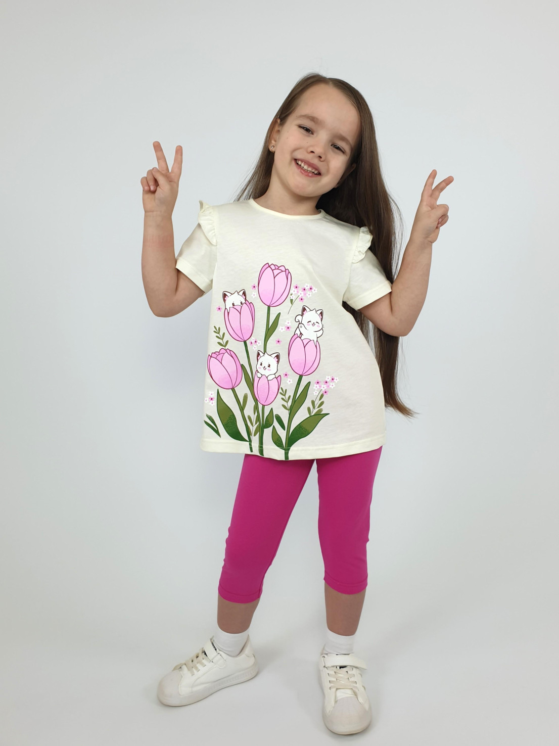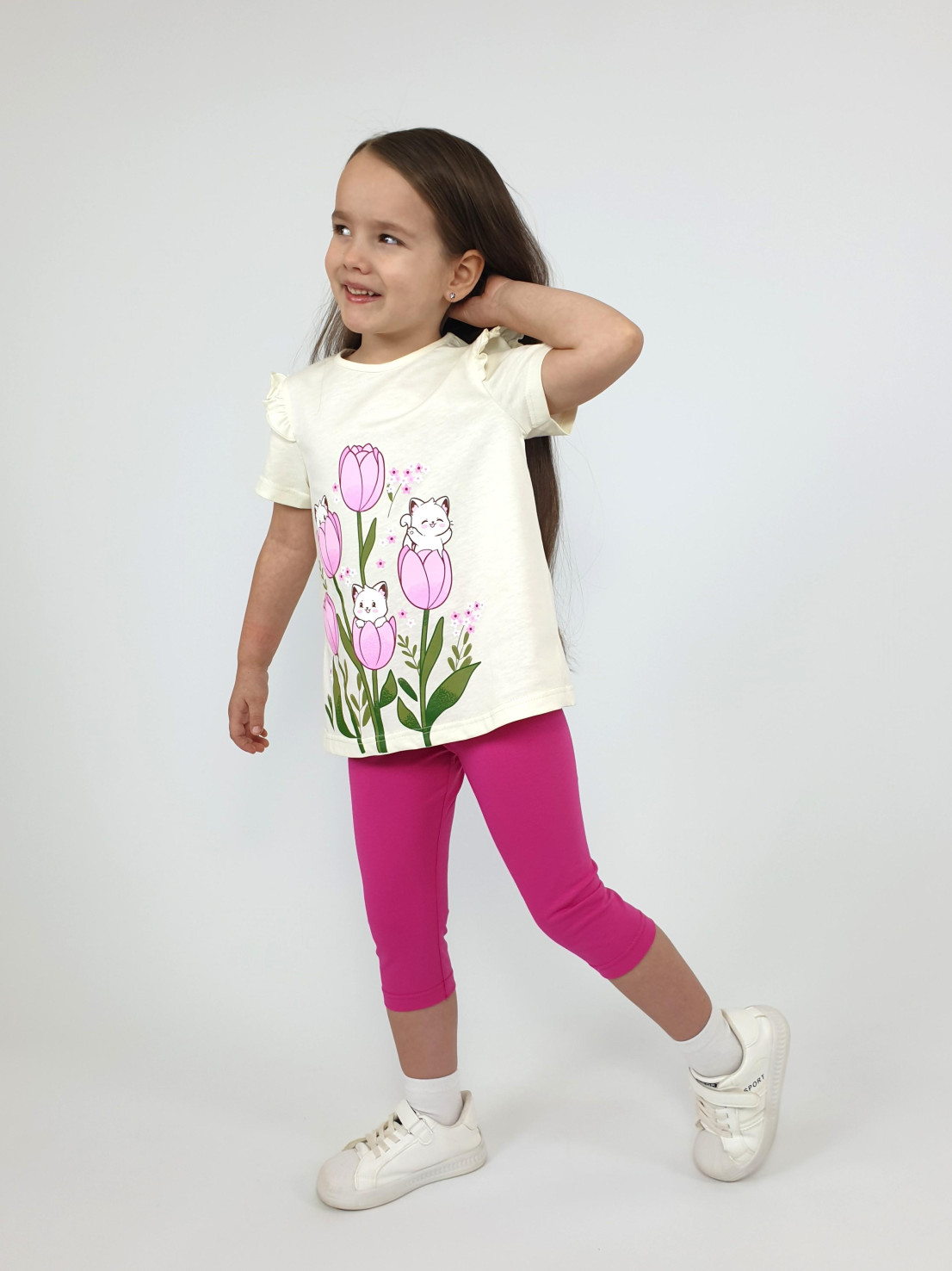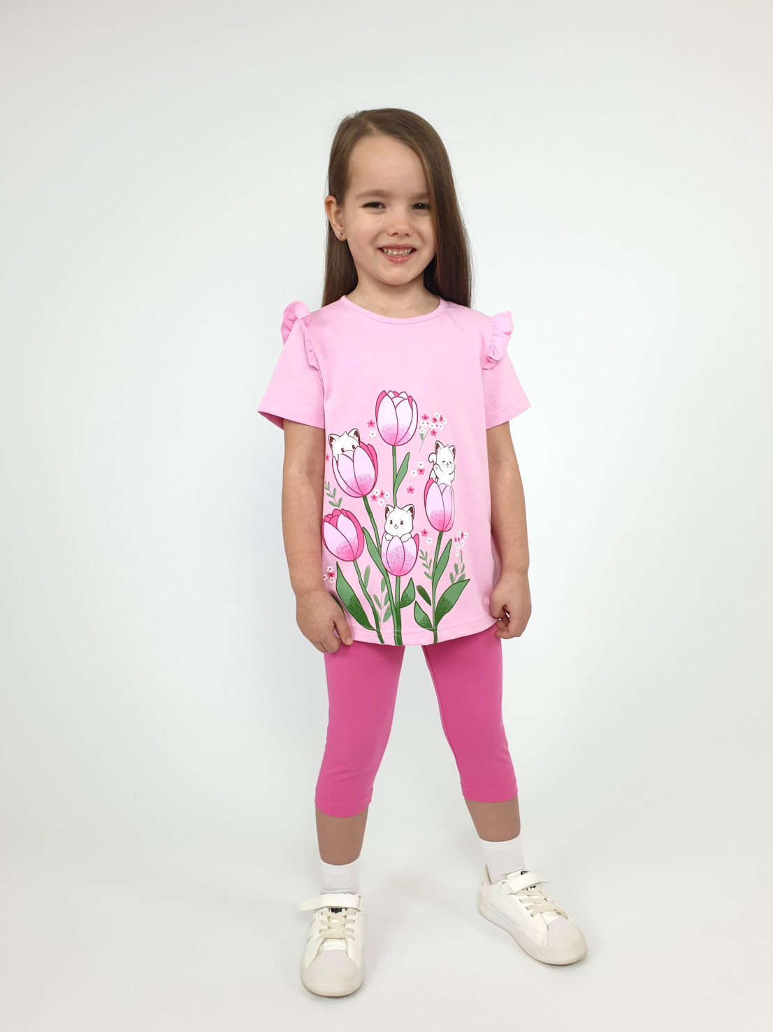 Кулирное полотно:100% х/б;95% х/б,5% лайкра. Джемпер-силуэт трапеция,короткий втачной рукав,в пройме рюша.Горловина окантована,застежка на пуговицу по спинке.Печать на переде. Лосины-укороченные вверху на резинке.