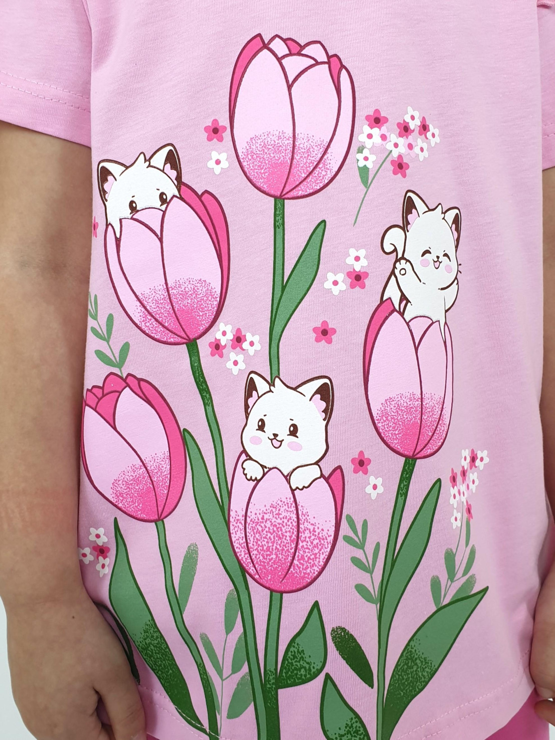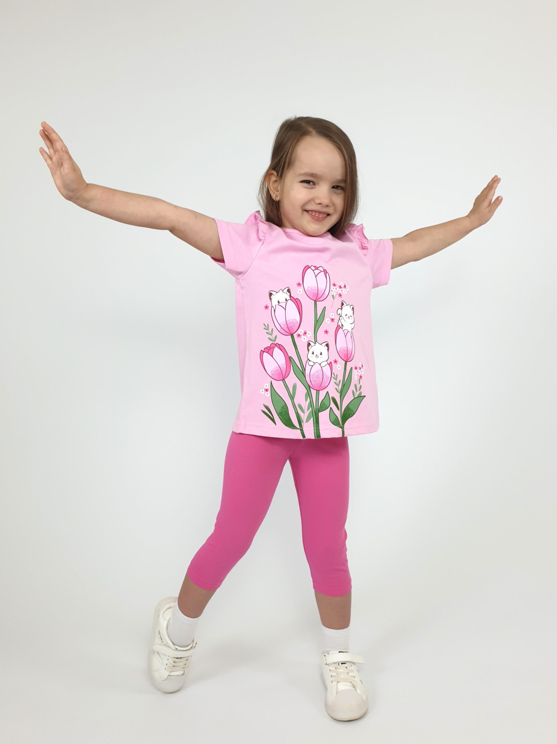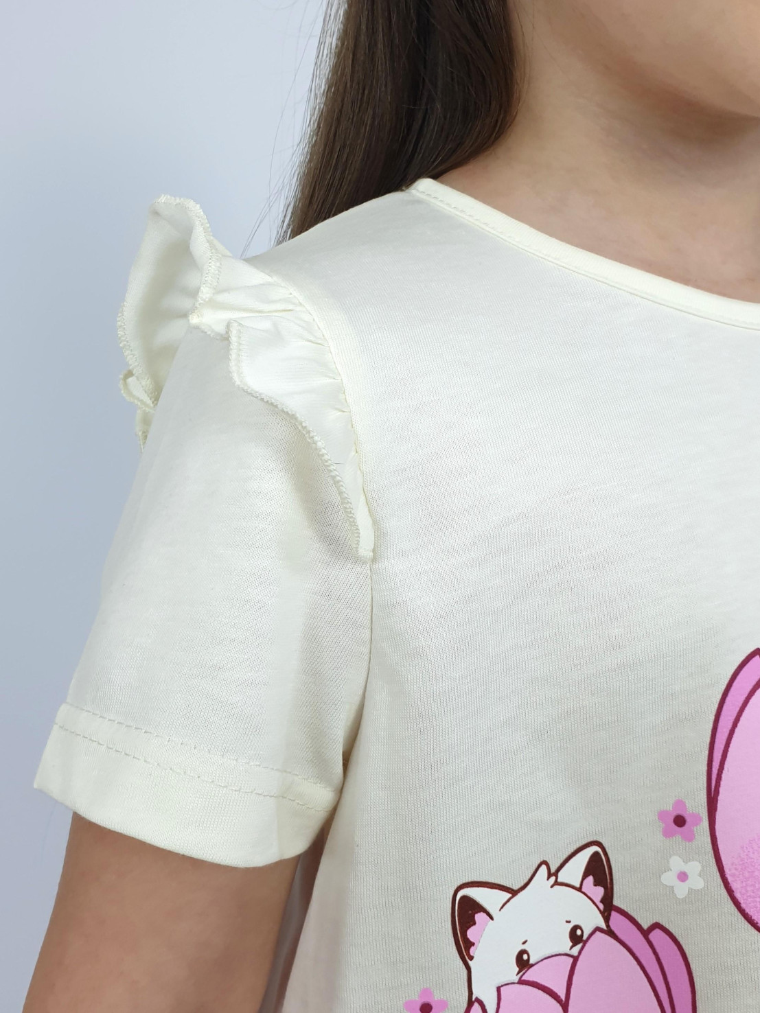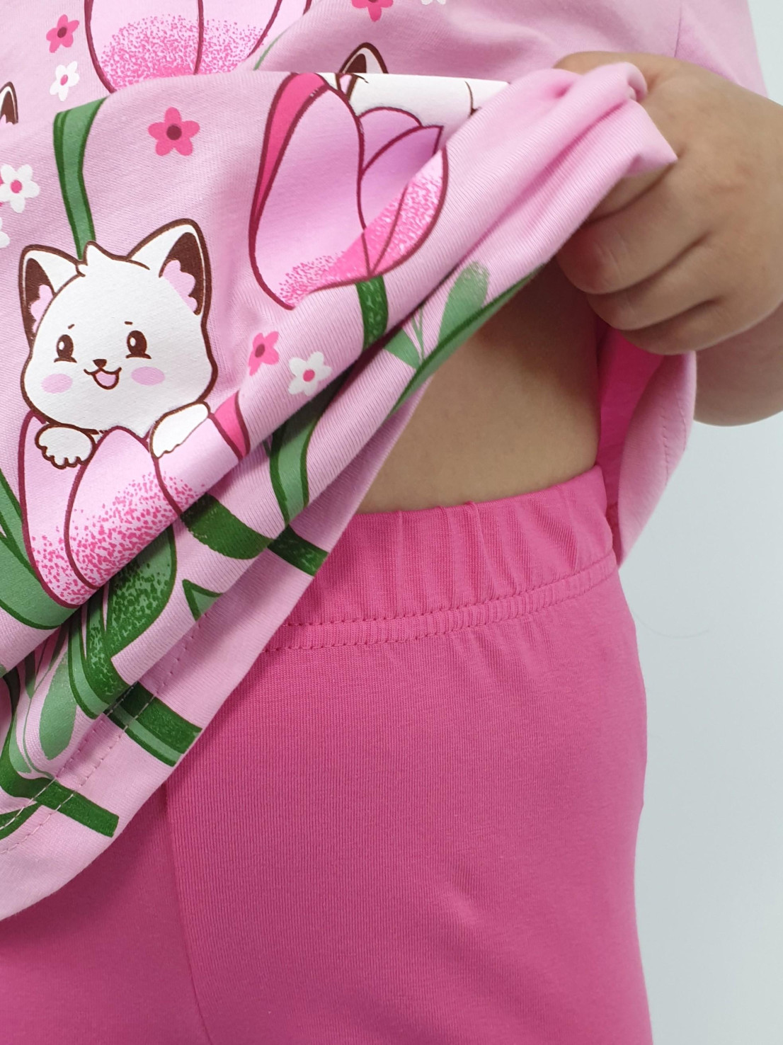 Кулирное полотно:100% х/б;95% х/б,5% лайкра. Джемпер-силуэт трапеция,короткий втачной рукав,в пройме рюша.Горловина окантована,застежка на пуговицу по спинке.Печать на переде. Лосины-укороченные вверху на резинке.