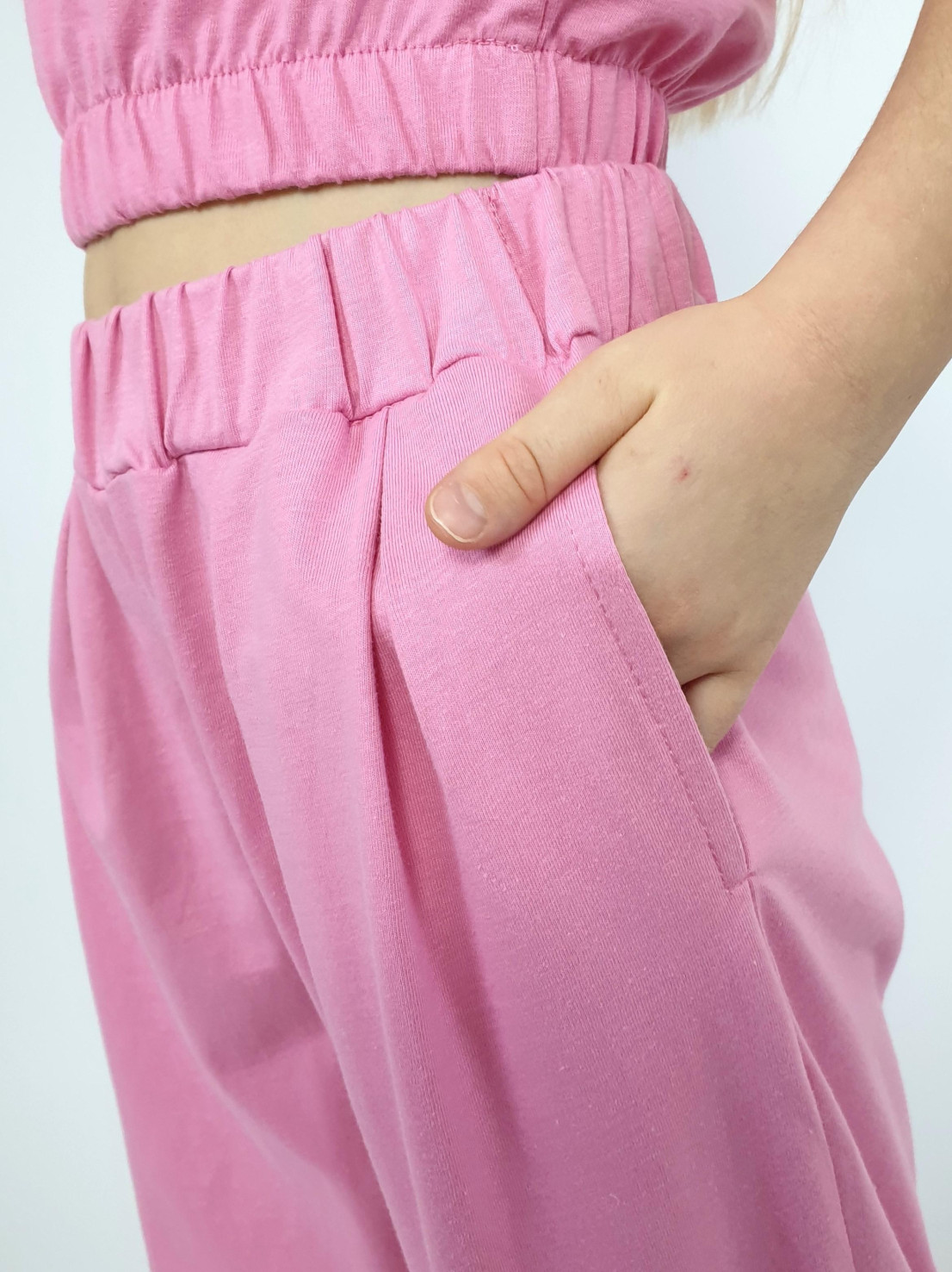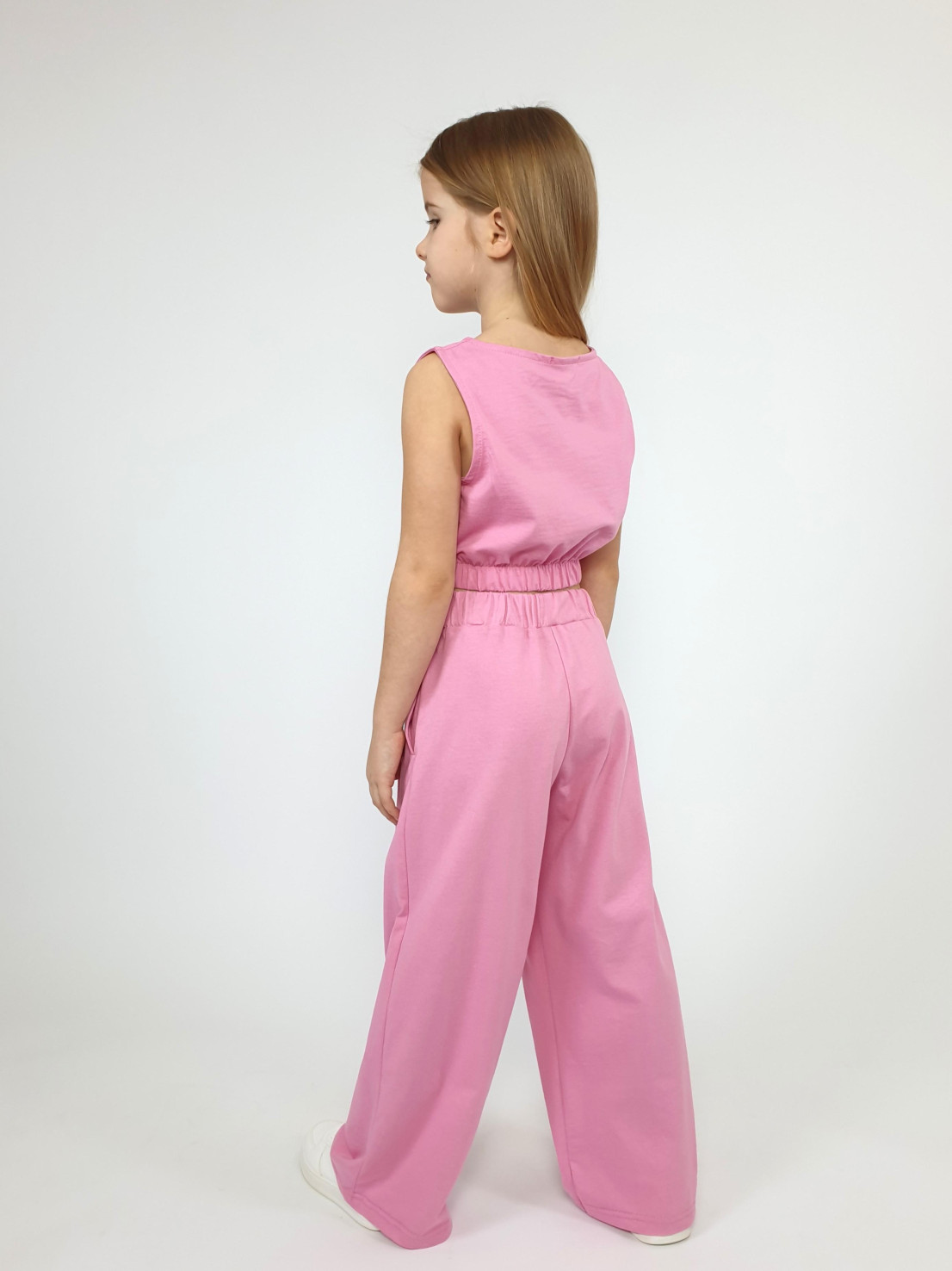 Кулирное полотно:100% х/б. Джемпер-прямой без рукава,внизу на резинке.Горловина,пройма-окантованы и подшиты. Брюки-длинные,свободные.На переде складки и карманы в боковом шве.Пояс с резинкой.