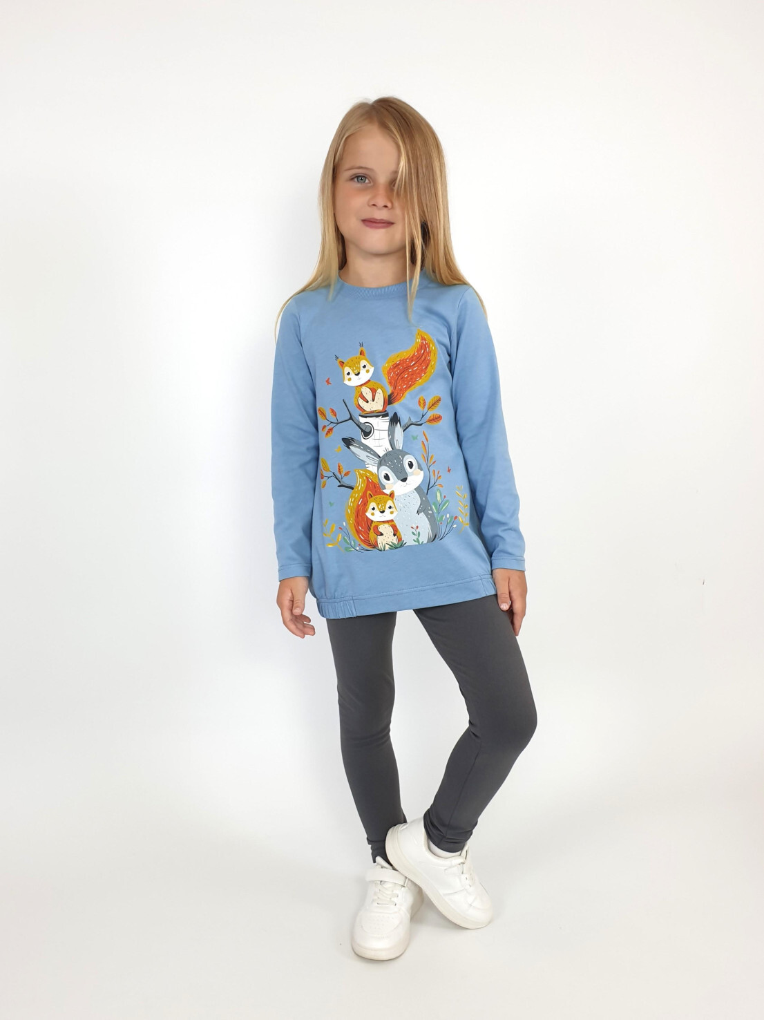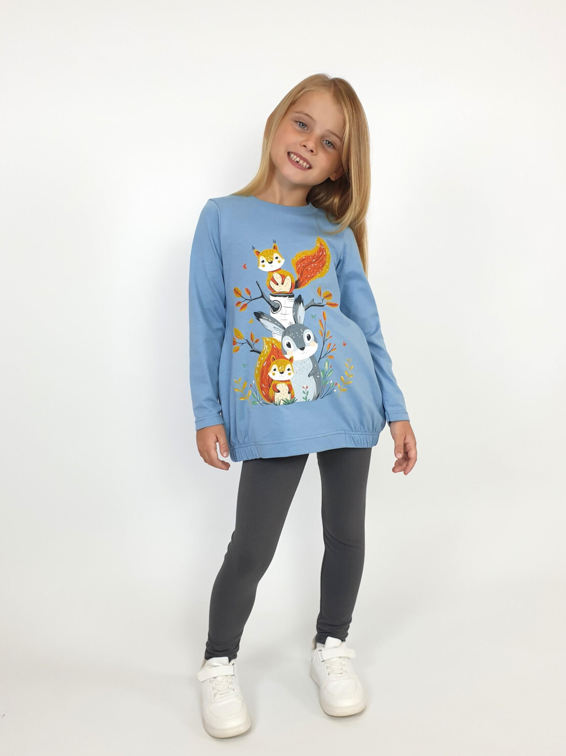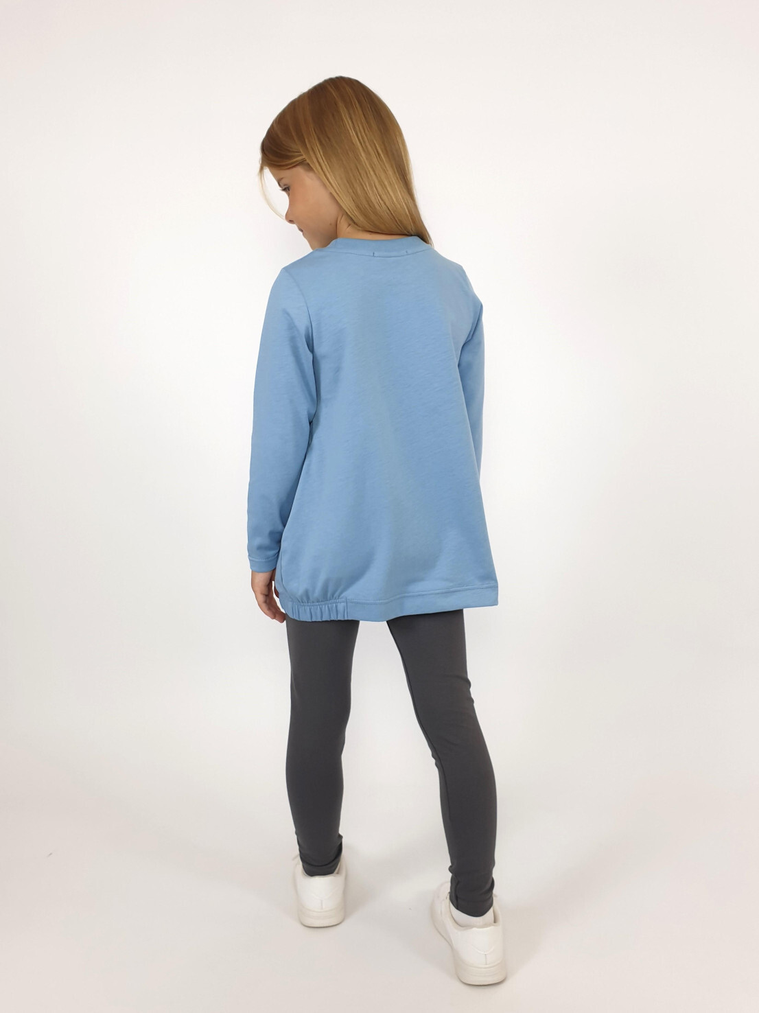 Кулирное полотно:100% х/б.,95% х/б,5% лайкра. Джемпер-свободный,с печатью по переду и двумя карманами в боковых швах.Рукав втачной,длинный.Низ изделия подшит с резинкой по боковым швам.Горловина обработана ластиком. Лосины-длинные на резинке,без боковых швов.