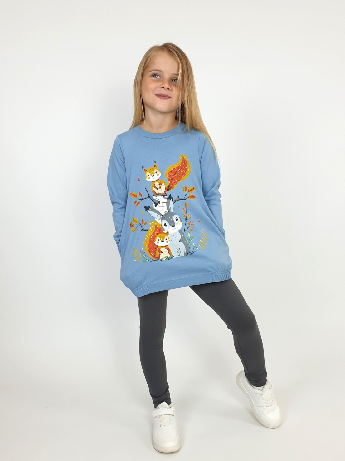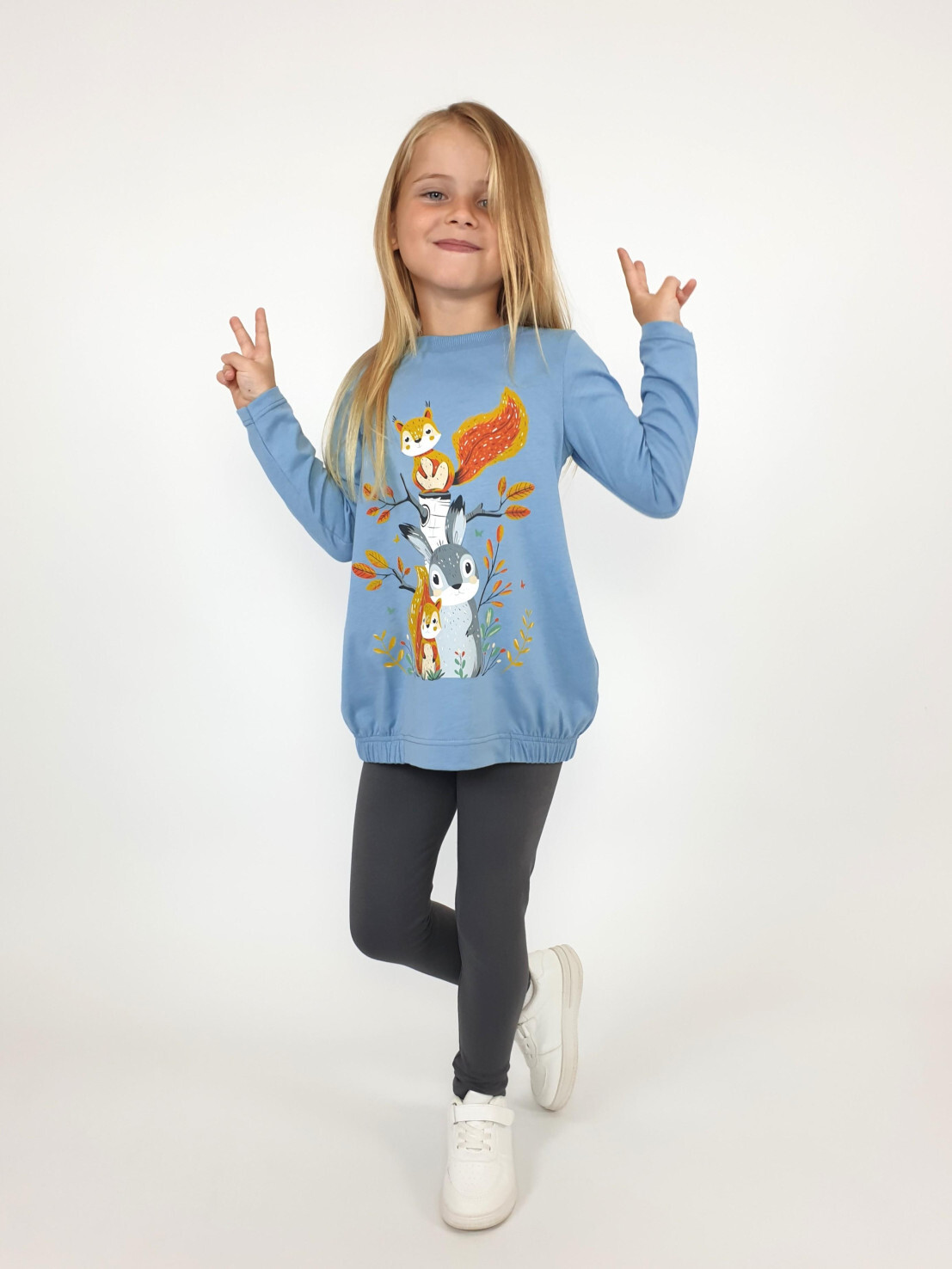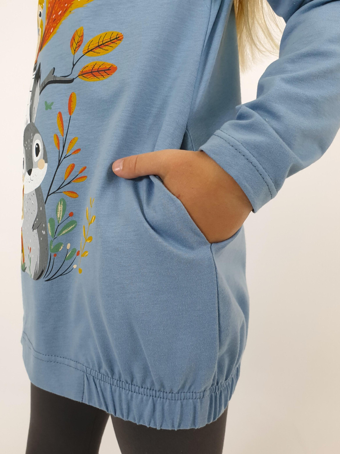 Кулирное полотно:100% х/б.,95% х/б,5% лайкра. Джемпер-свободный,с печатью по переду и двумя карманами в боковых швах.Рукав втачной,длинный.Низ изделия подшит с резинкой по боковым швам.Горловина обработана ластиком. Лосины-длинные на резинке,без боковых швов.