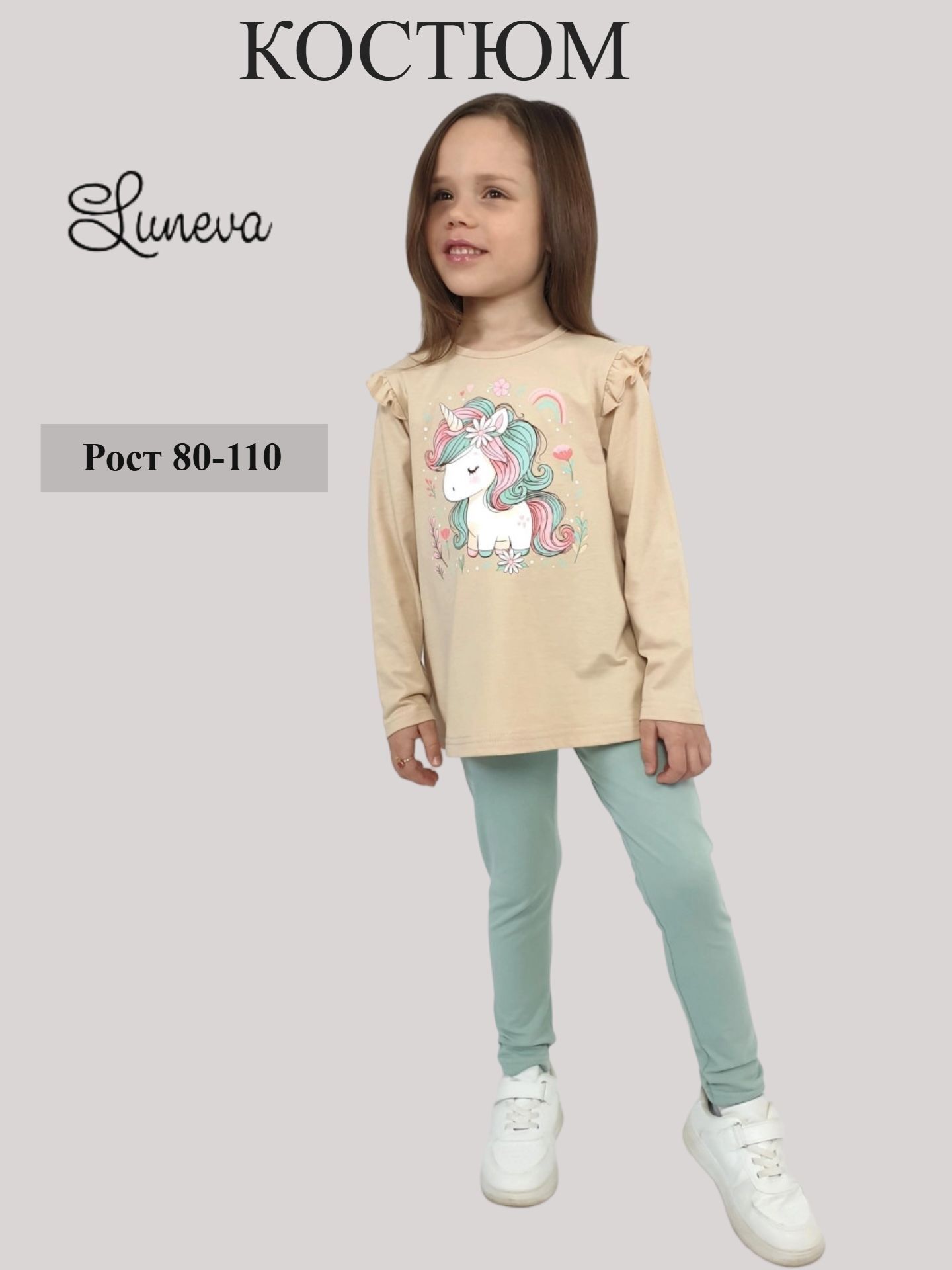 Благодаря сочетанию комфорта хлопка и эластичности лайкры, этот комплект идеально подойдет для активных девочек! Рельефная печать на джемпере придаст образу оригинальности и станет изюминкой детского гардероба. Комплект от российского бренда Lunева – стиль, качество и удобство для вашего ребенка!