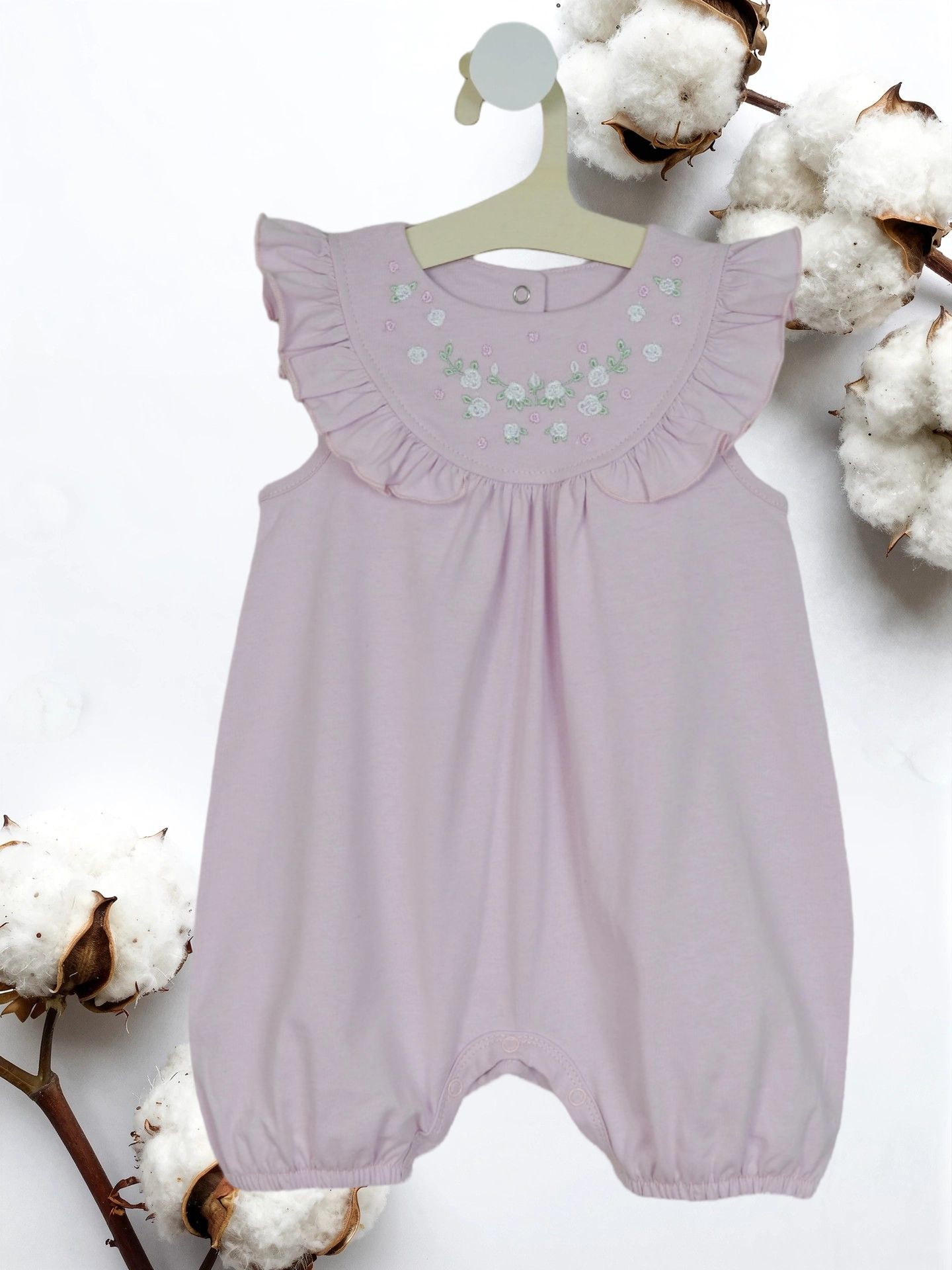Кулирное полотно:100% х/б. Полукомбинезон-свободный,перед и спинка с кокеткой и рюшей.Горловина обработана обтачкой.Застежка по спинке и по шаговому на кнопки.Низ ножек на резинке.