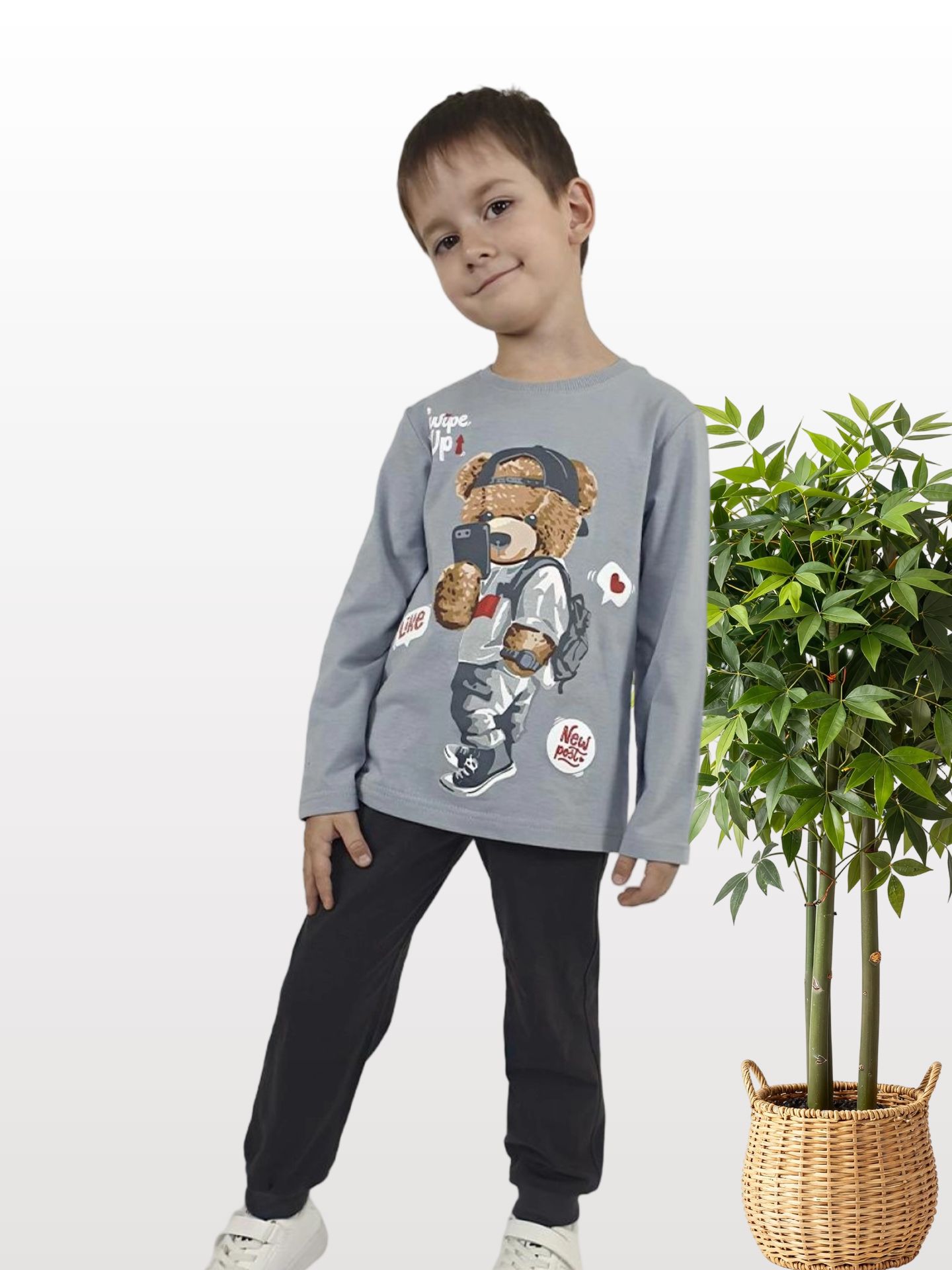 Кулирное полотно:100% х/б. Брюки-длинные на манжете из ластика.Притачной пояс с резинкой и шнуром.Два кармана на переде.