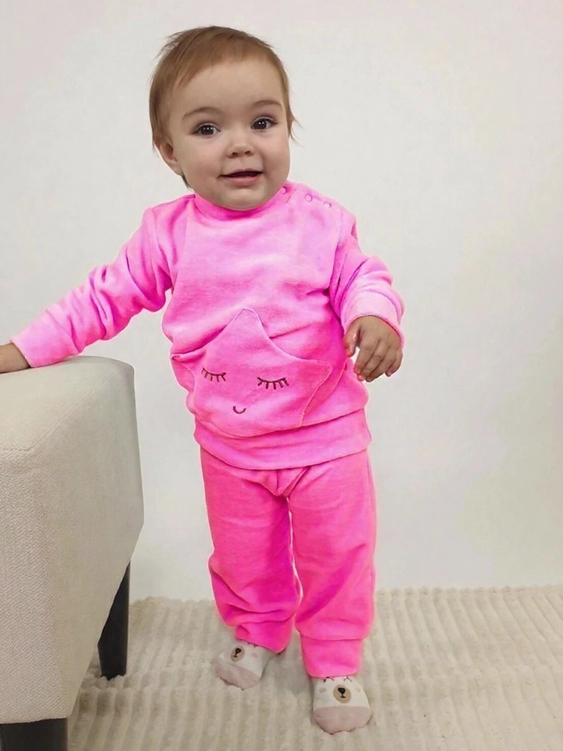Костюм детский теплый из велюра ( 80% хлопок, 20% полиэстер) состоит из лонгслива и брюк на резинке. Модель с длинным рукавом на манжете и воротником-стойкой. На лонгсливе накладной карман с вышивкой . Застежка на кнопках существенно облегчает переодевание ребенка. В таком костюме малыш будет чувствовать себя свободно и комфортно.