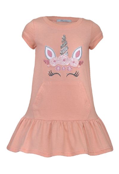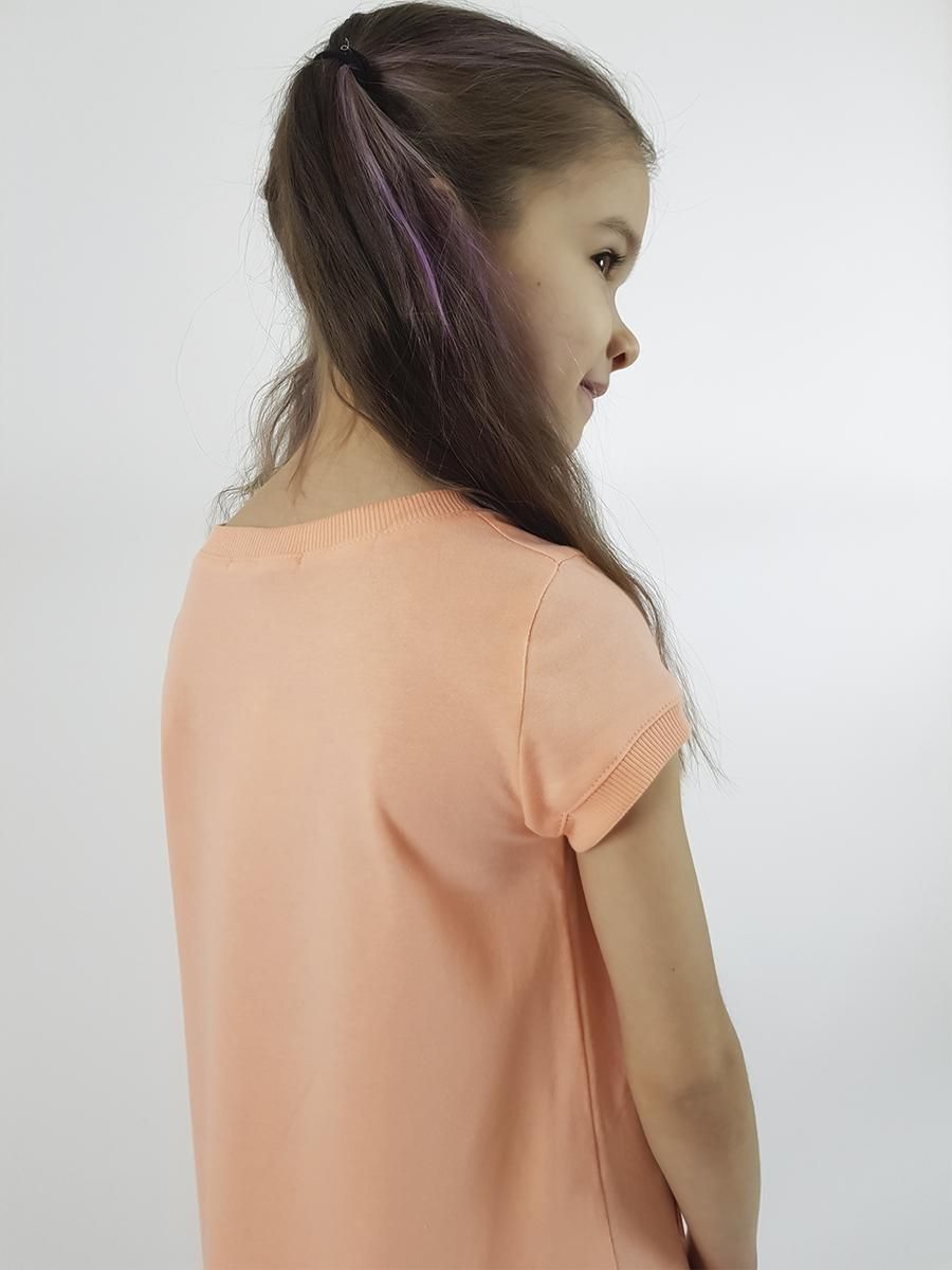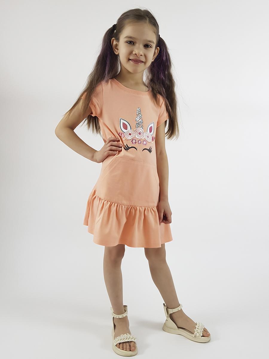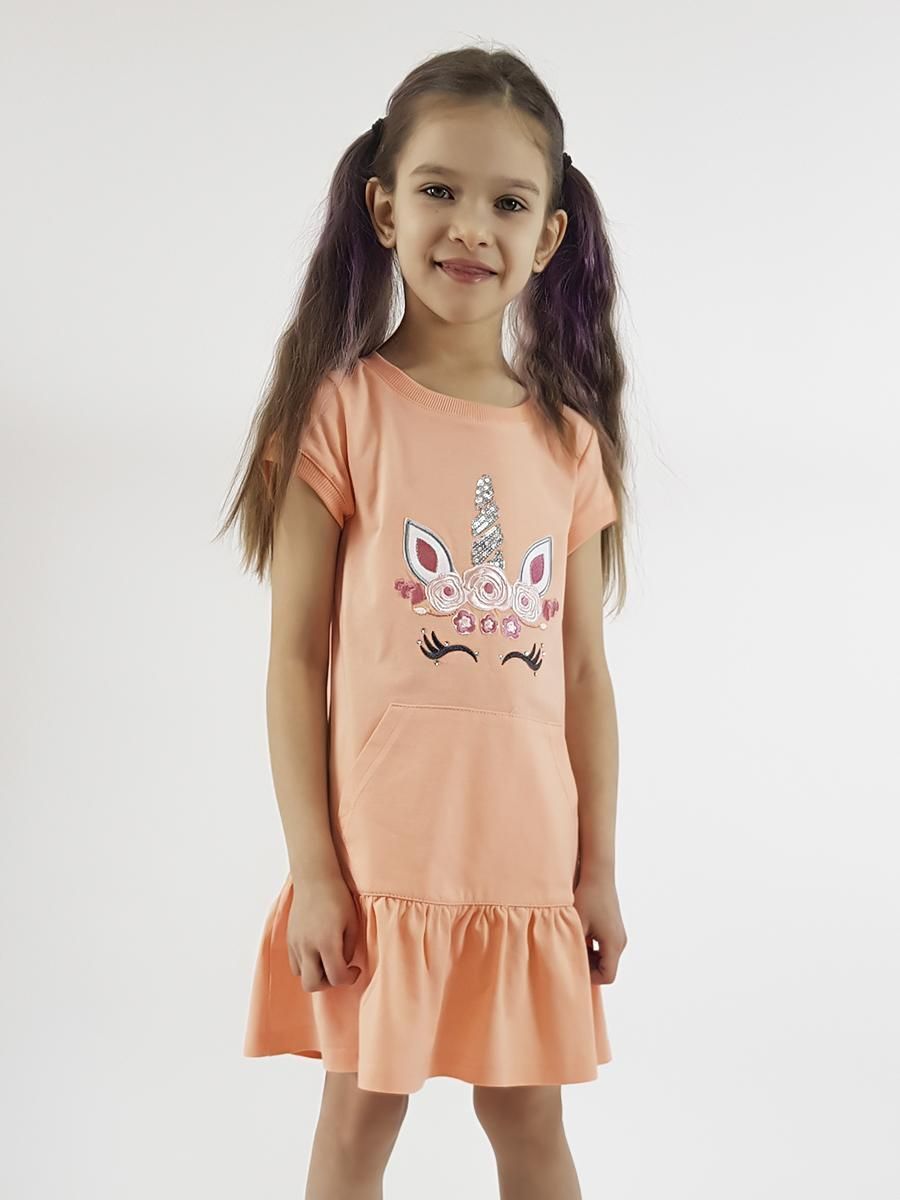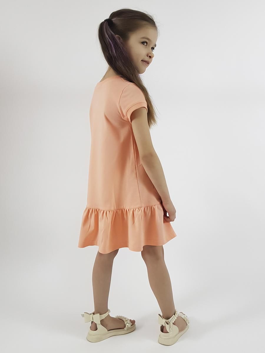 Летнее платье для девочки выполнено из качественного кулирного полотна (100% хлопок).Платье – силуэт трапеция с воланом , декорировано оригинальным принтом с вышивкой и стразами. Короткий рукав на манжете. Стильная модель обязательно понравится юным модницам. Такое платье идеально подойдёт для прогулки в тёплый день, а также для садика, похода в гости.