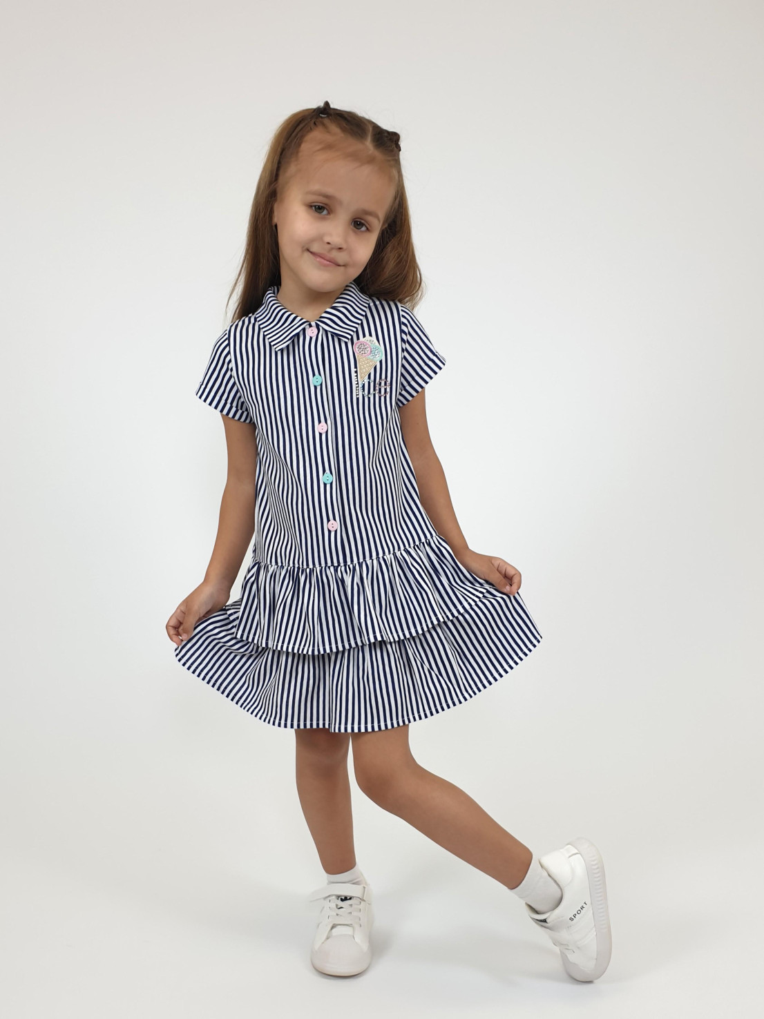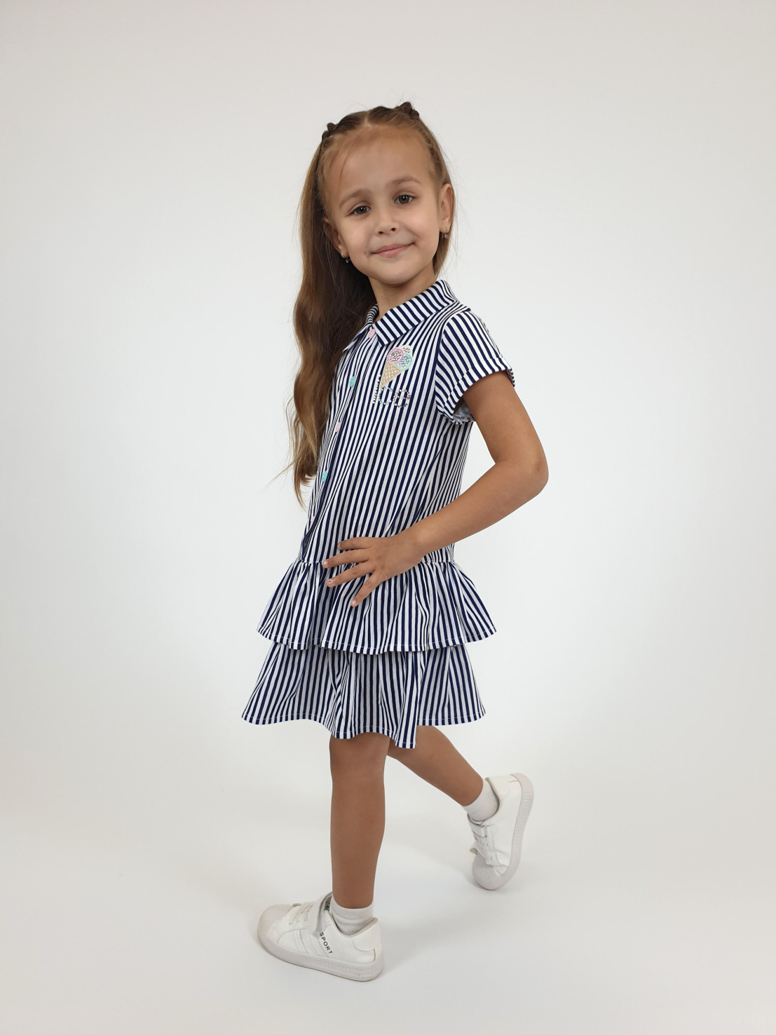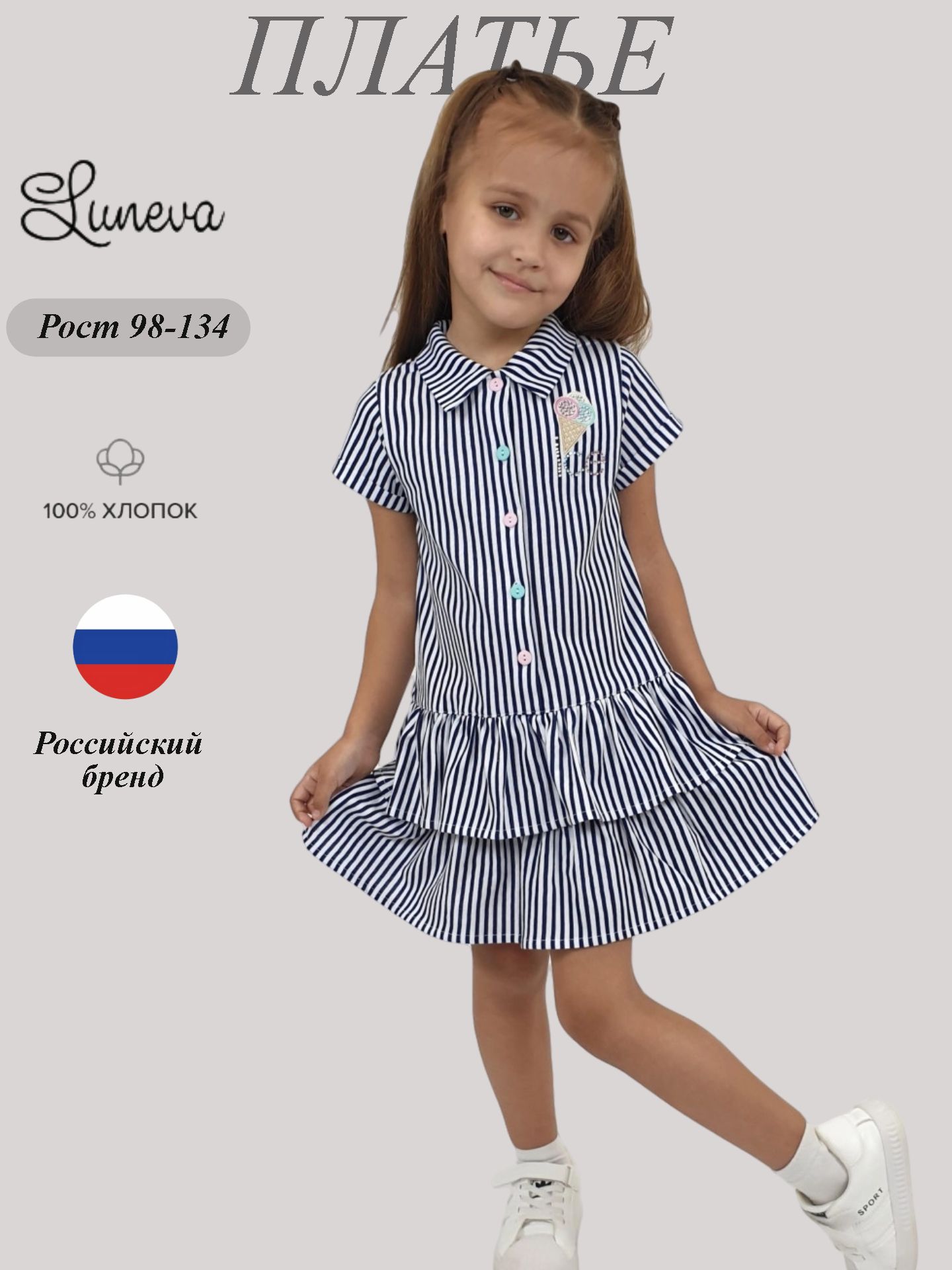 Милое и стильное платье-трапеция от бренда Lunева идеально подойдет маленькой моднице! Черно-синяя гамма вышивки подчеркнет индивидуальность девочки и станет изюминкой образа. Удобный рубашечный воротничок и застежки на пуговицах обеспечивают комфорт при надевании. Два декоративных волана придают платью особую женственность и элегантность. Изделие выполнено из качественного кулирного полотна (100% хлопок), что гарантирует безопасность и удобство в носке. Сделано в России.