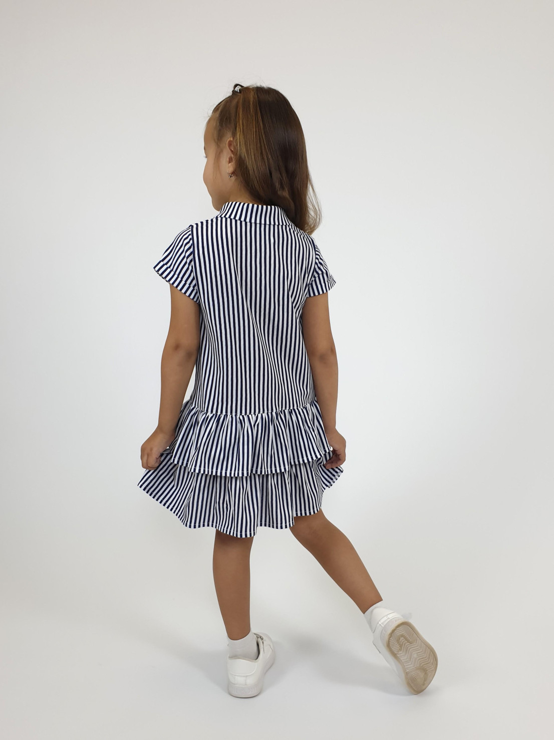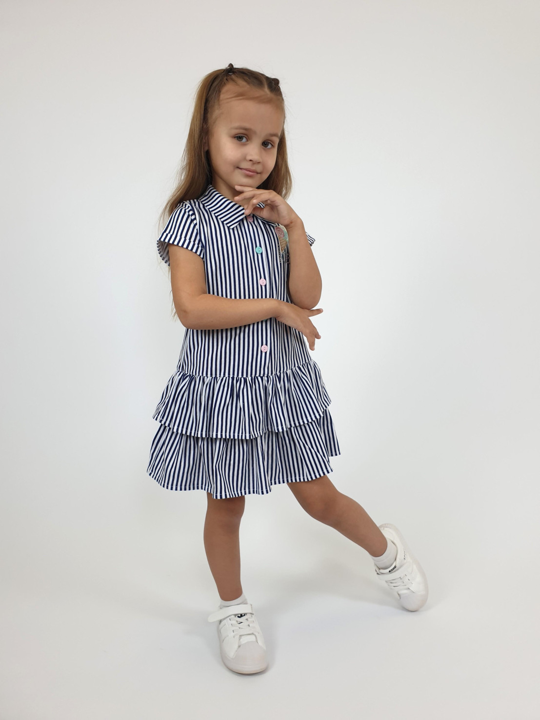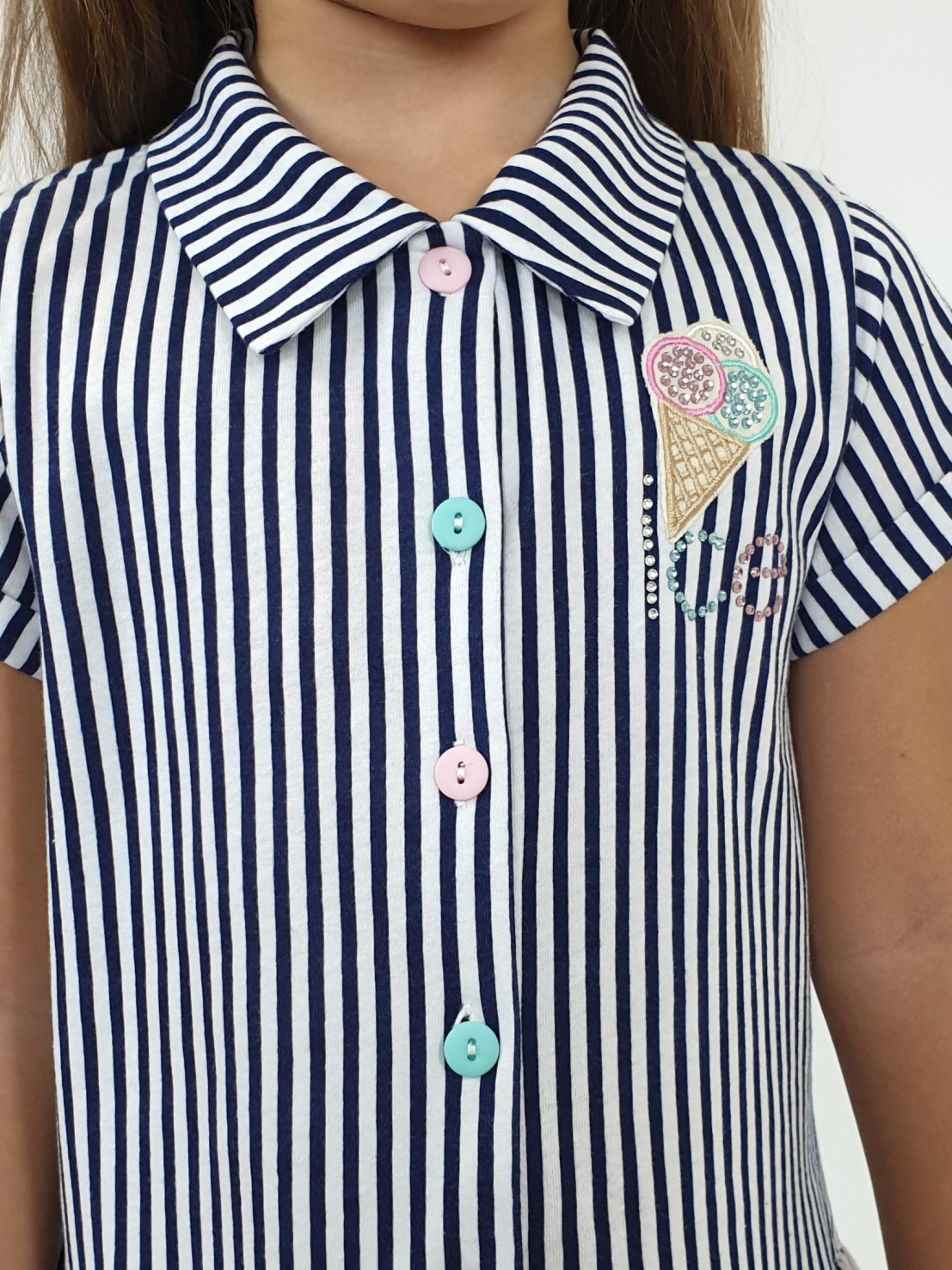 Кулирное полотно:100% х/б. Платье-силуэт трапеция,короткий рукав с манжетой,внизу два волана. Застежка центральная на пуговицы,воротник-рубашечный(шов втачивания оконтован).Вышивка на переде слева.