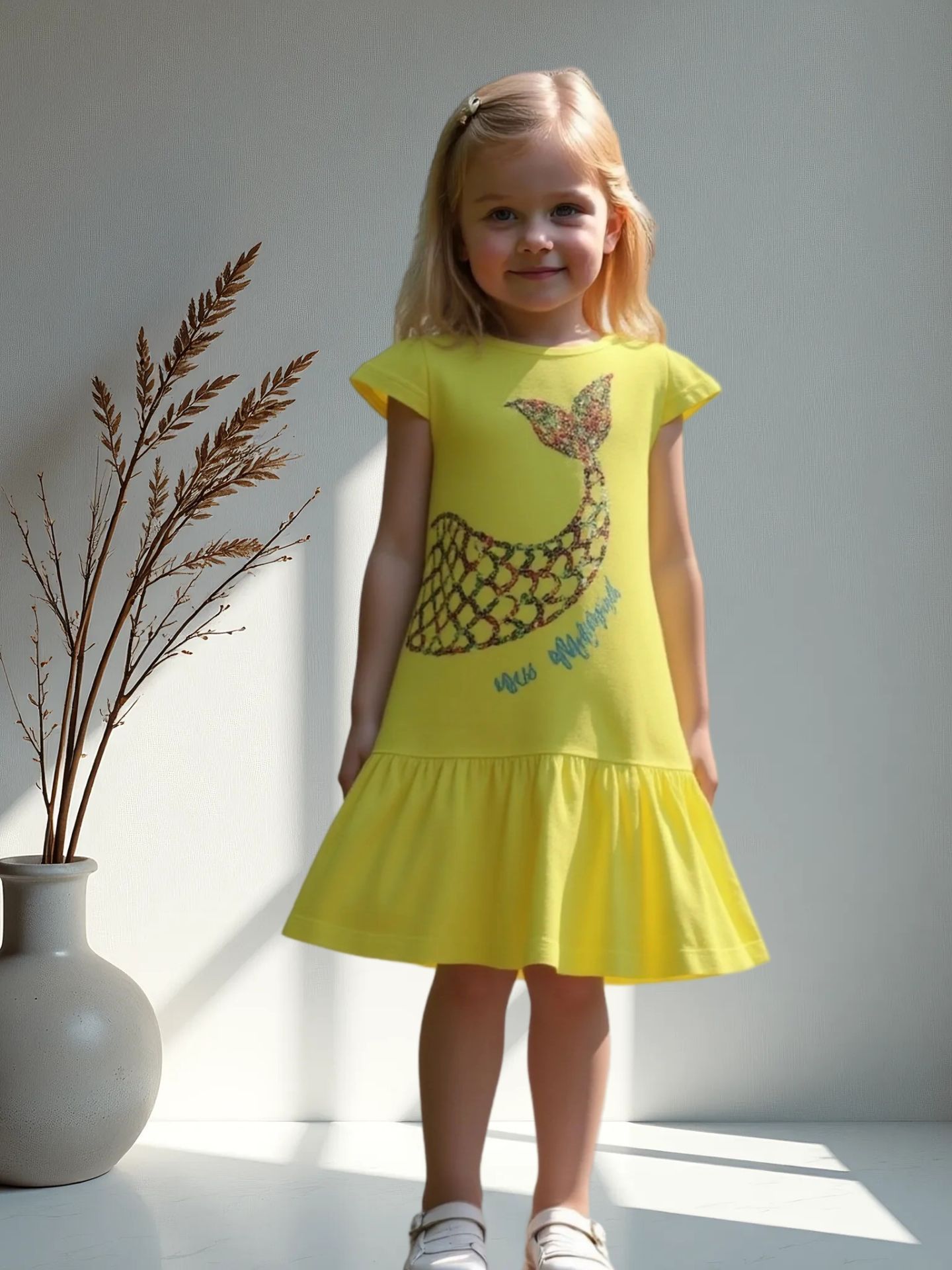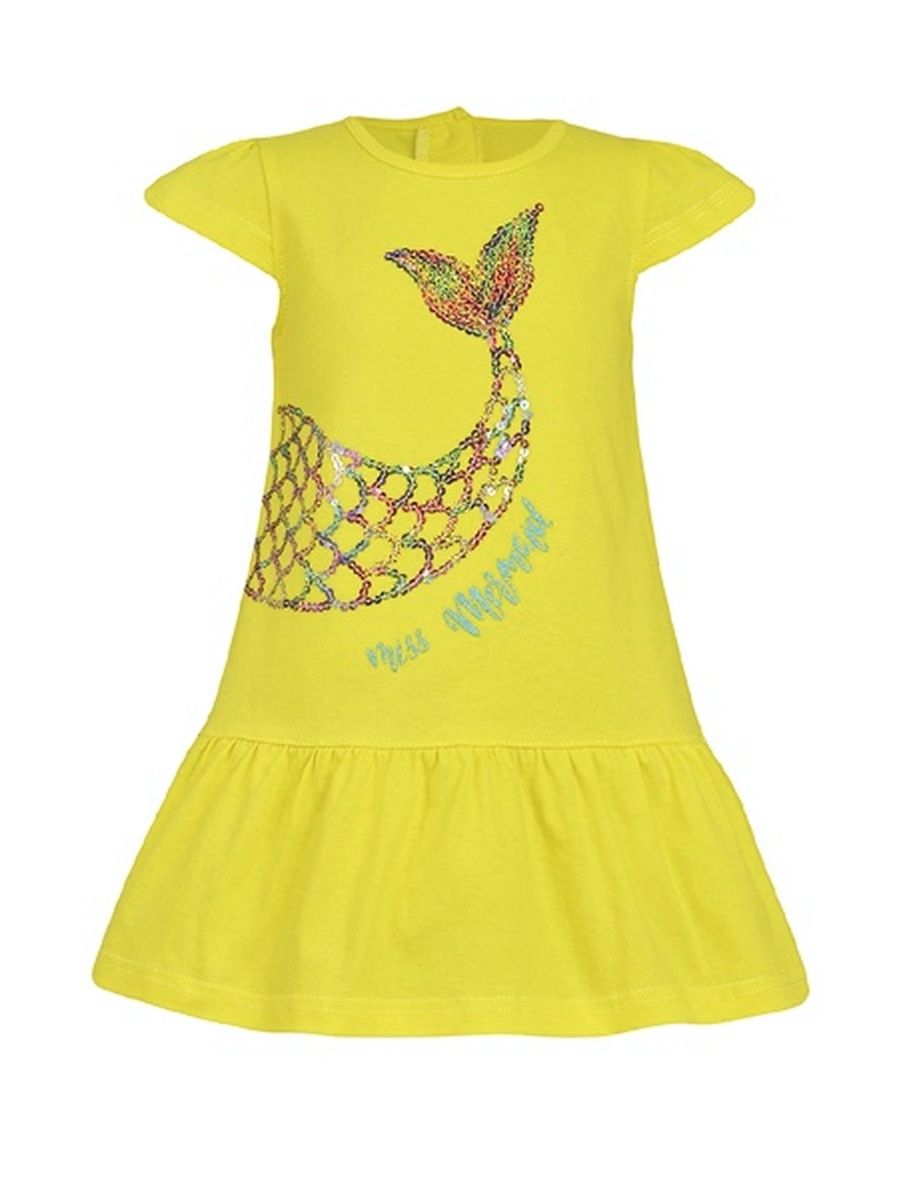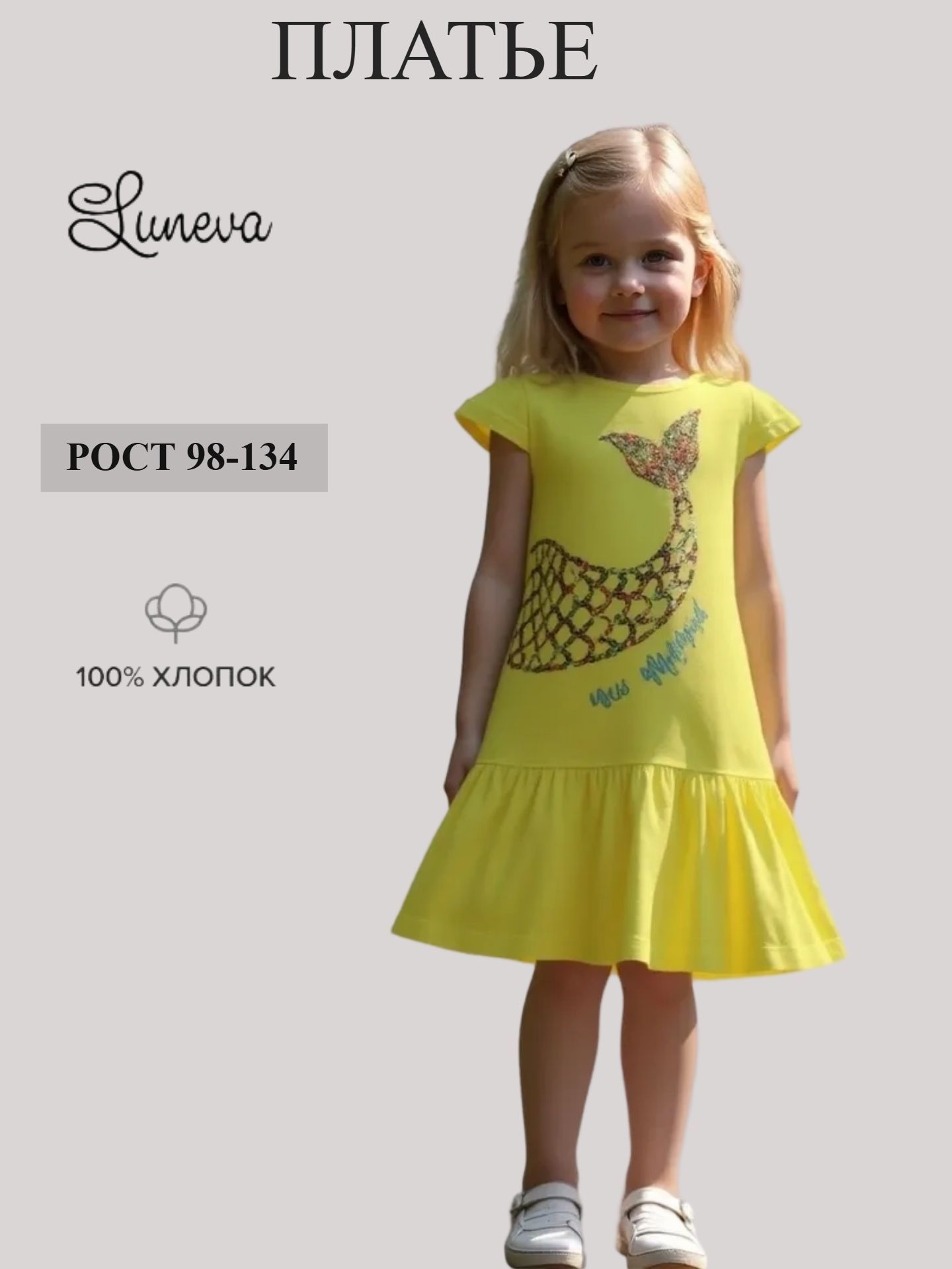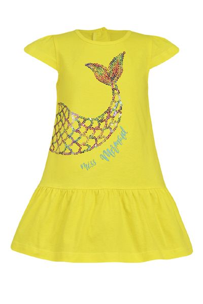 Платье-силуэт трапеция,отрезной волан,по переду вышивка-пайетки и печать.Горловина окантована,застежка по спинке на планку с пуговицами.Рукав-крылышко со сборкой по окату.