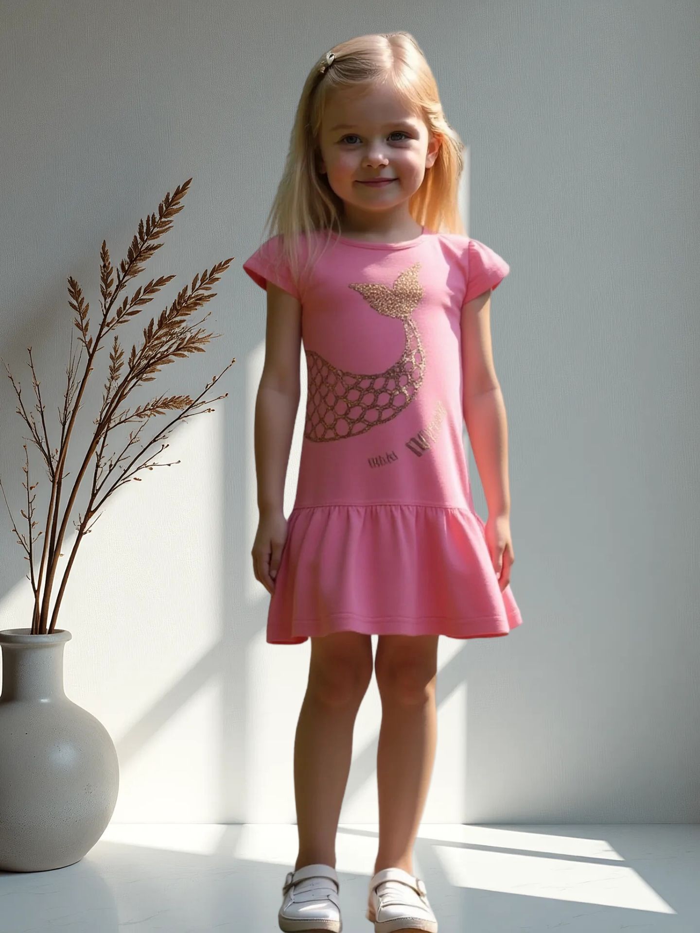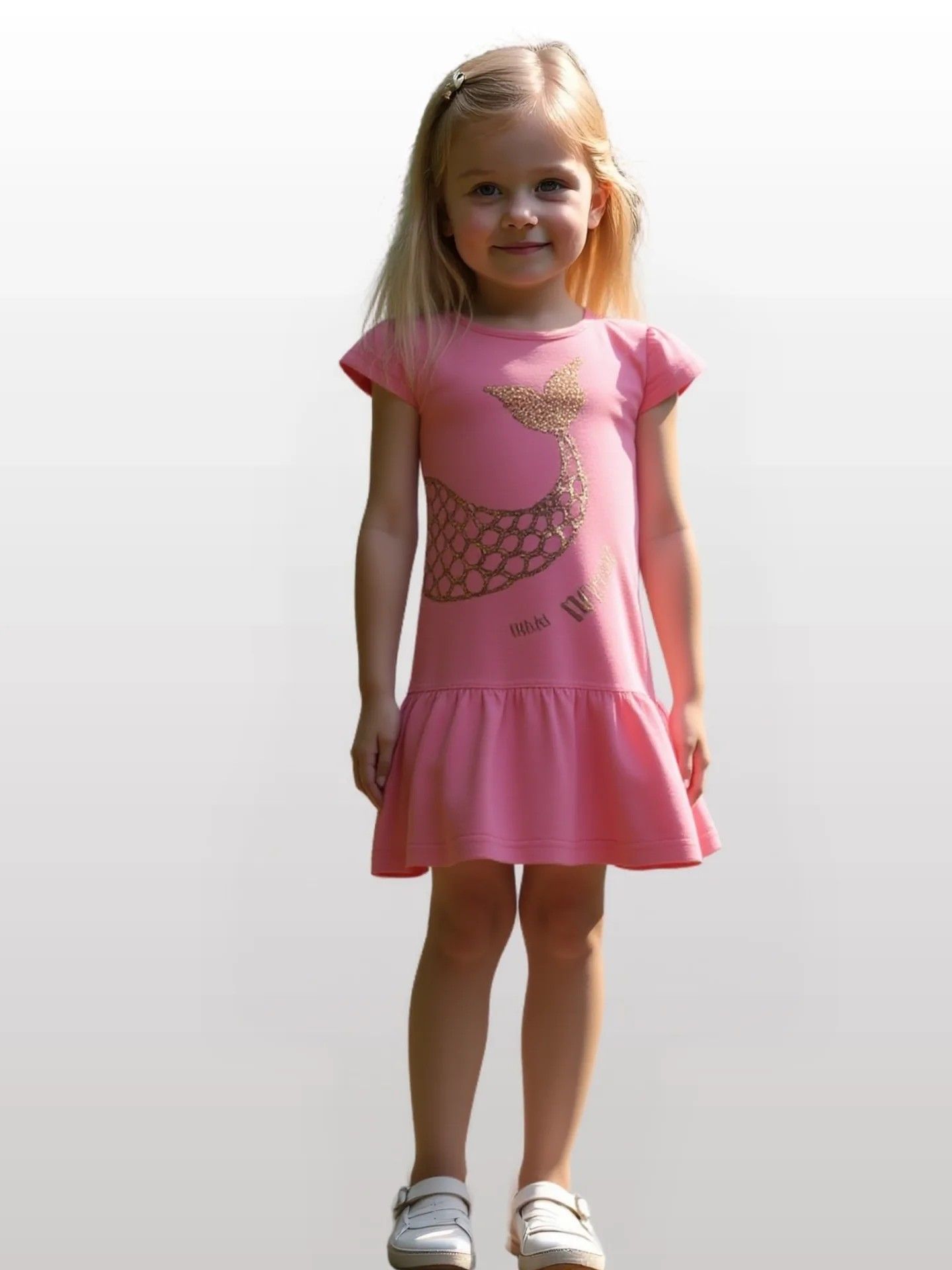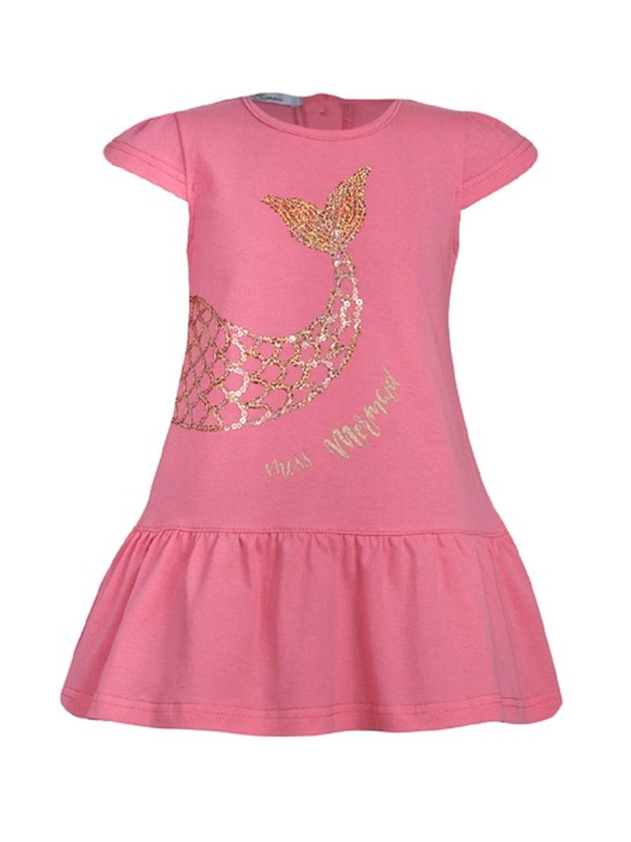 Платье-силуэт трапеция,отрезной волан,по переду вышивка-пайетки и печать.Горловина окантована,застежка по спинке на планку с пуговицами.Рукав-крылышко со сборкой по окату.