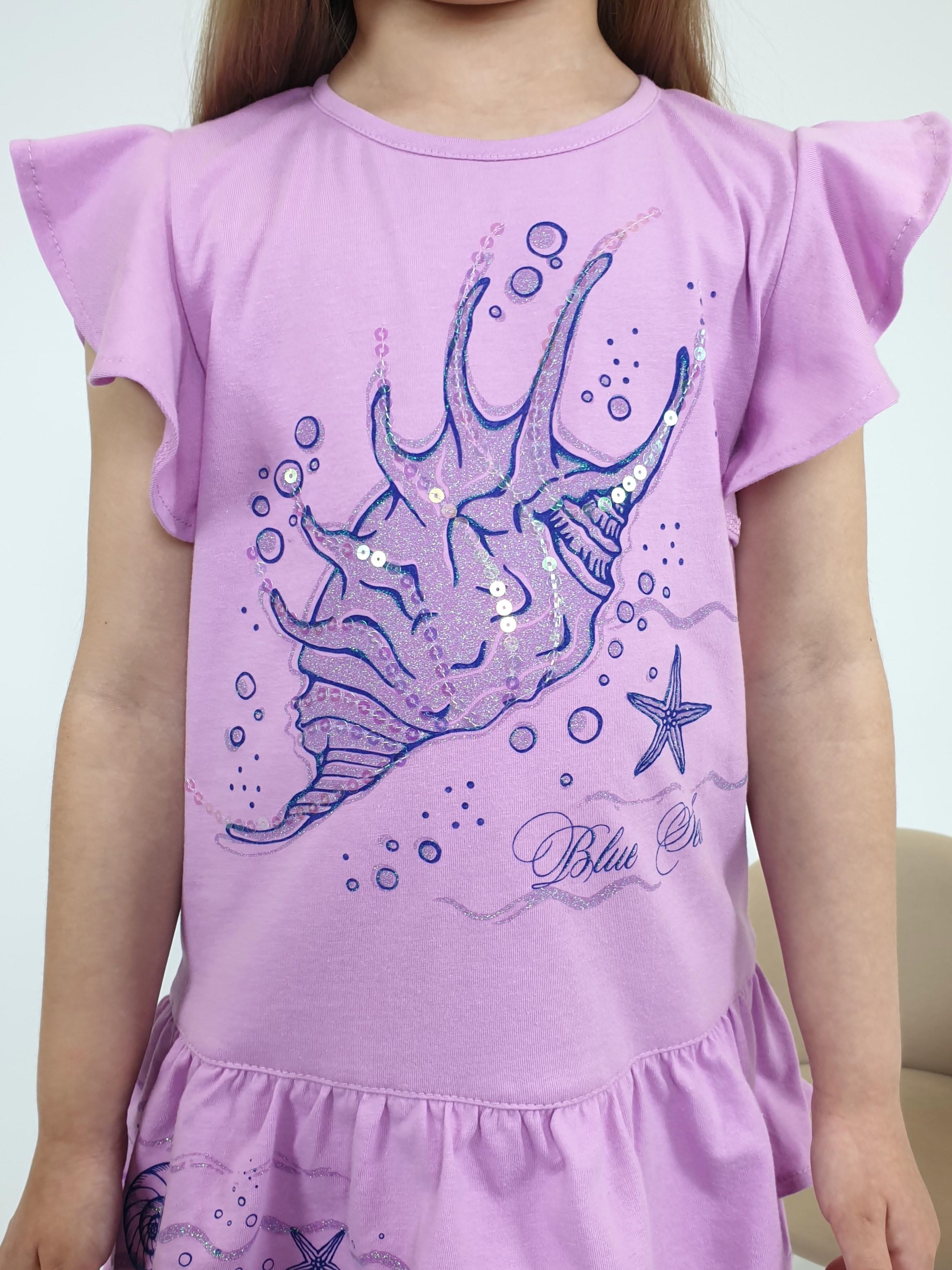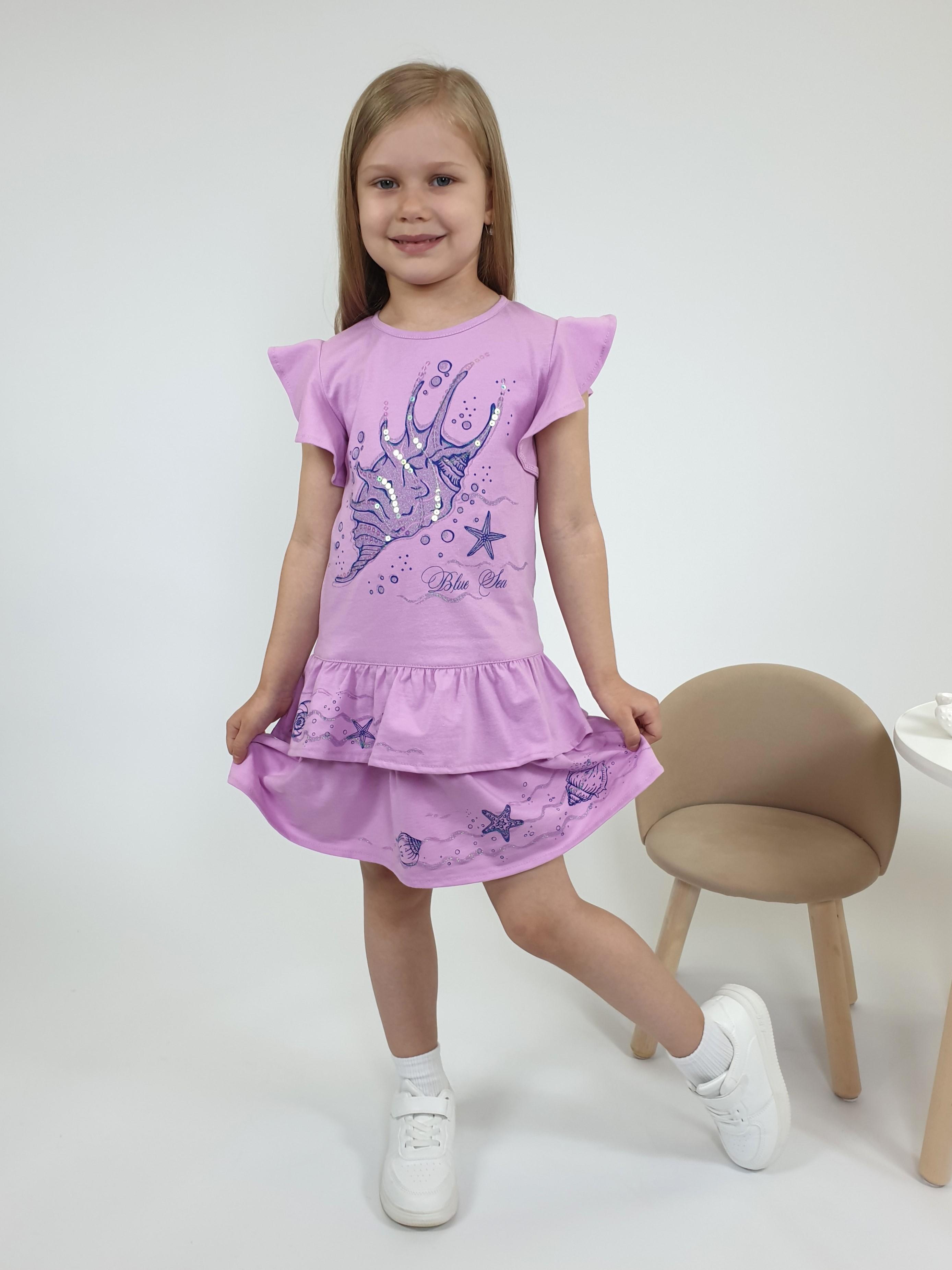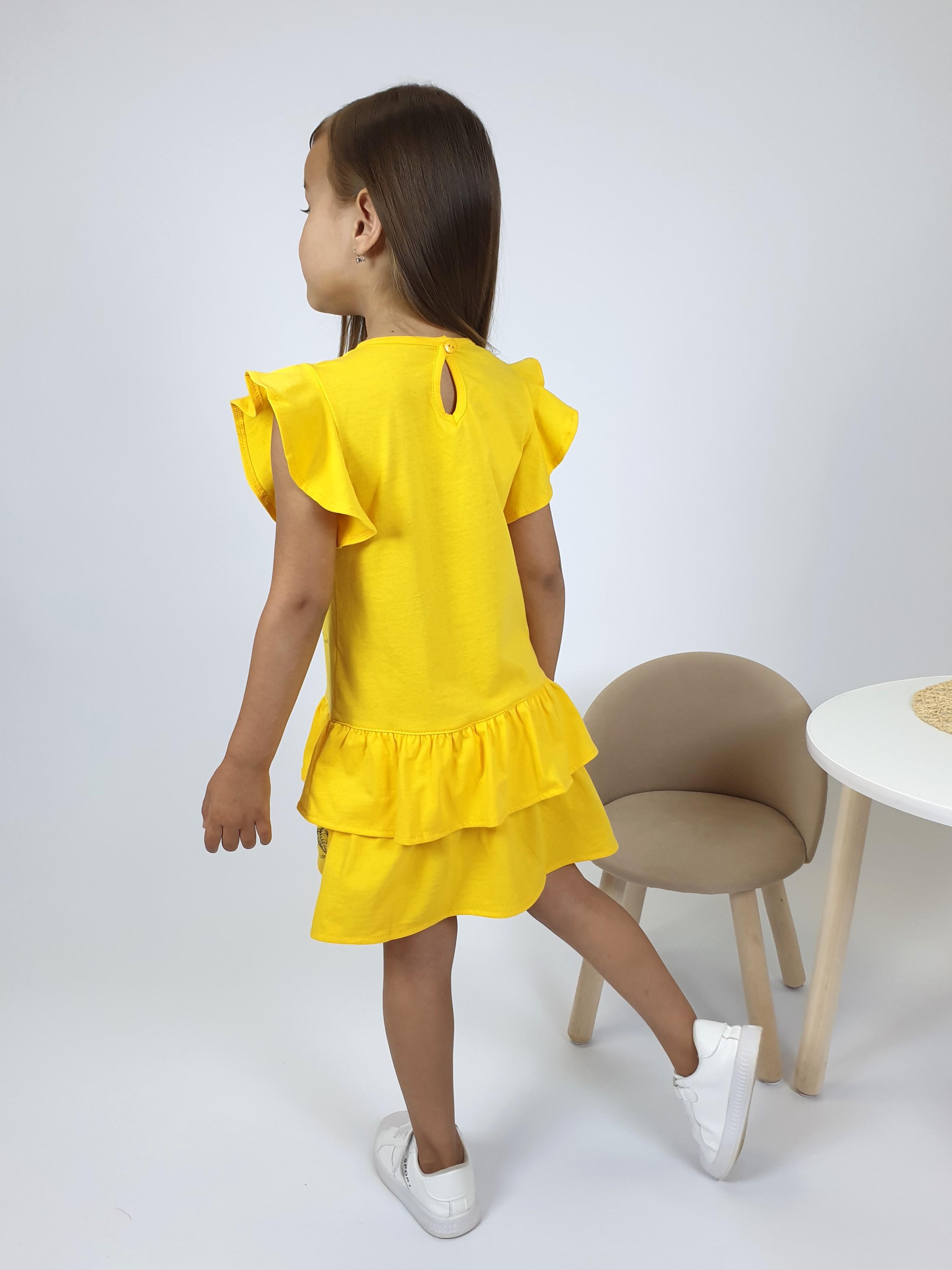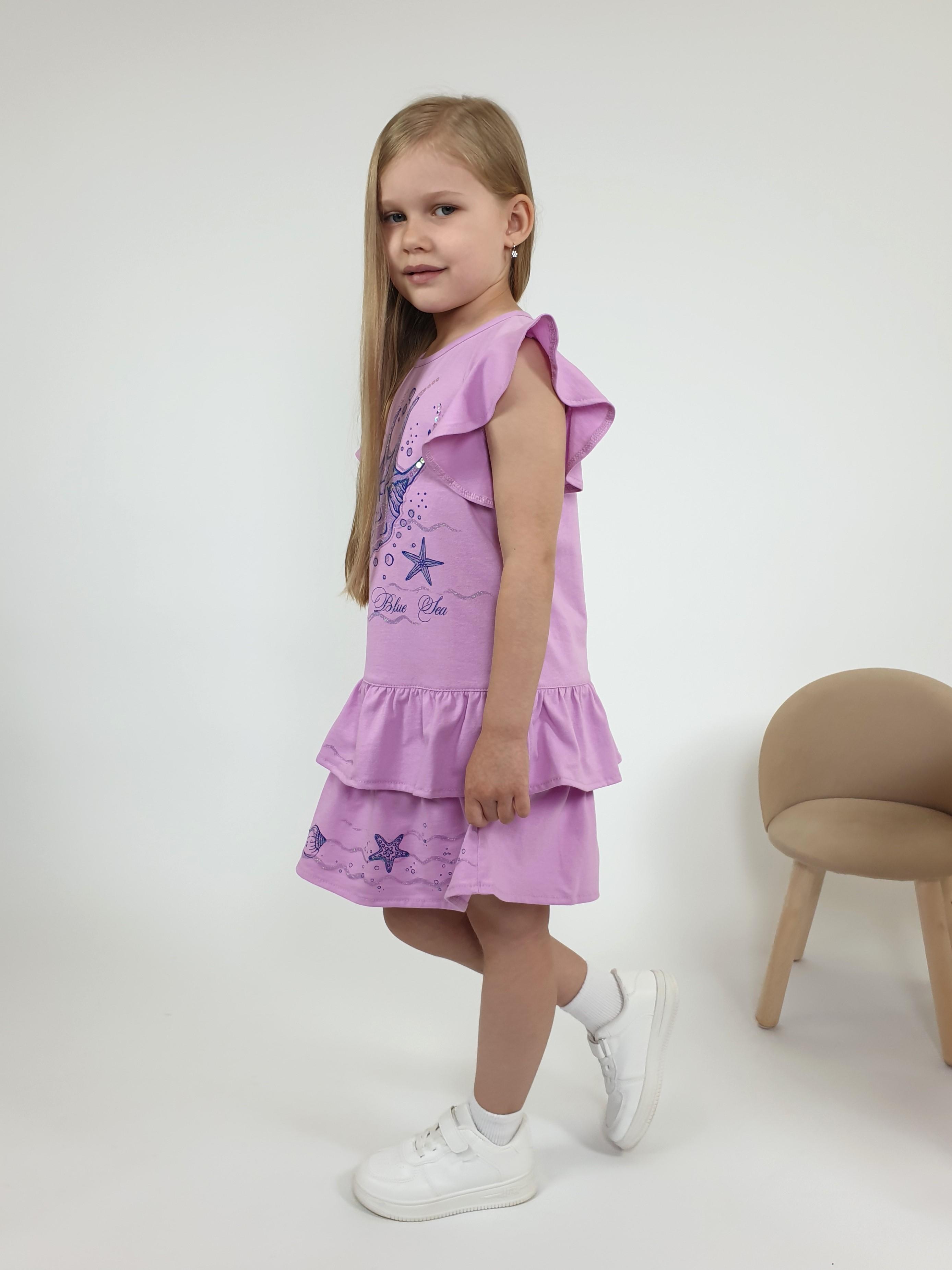 Платье-силуэт трапеция,короткий рукав-волан,юбка из двух воланов с печатью.Застежка по спинке капелька на пуговицу.Горловина окантована.Печать и вышивка-пайетки на переде.