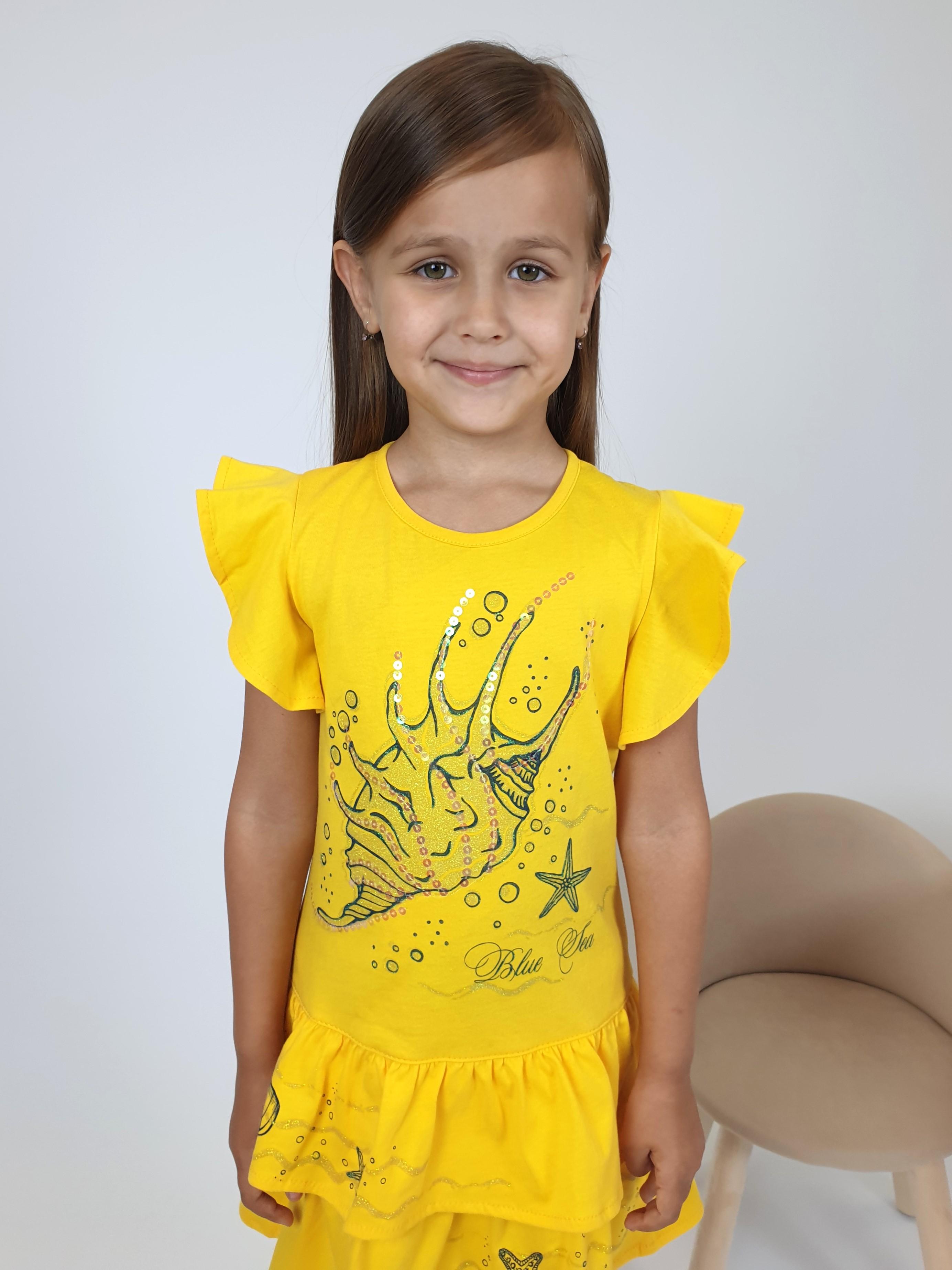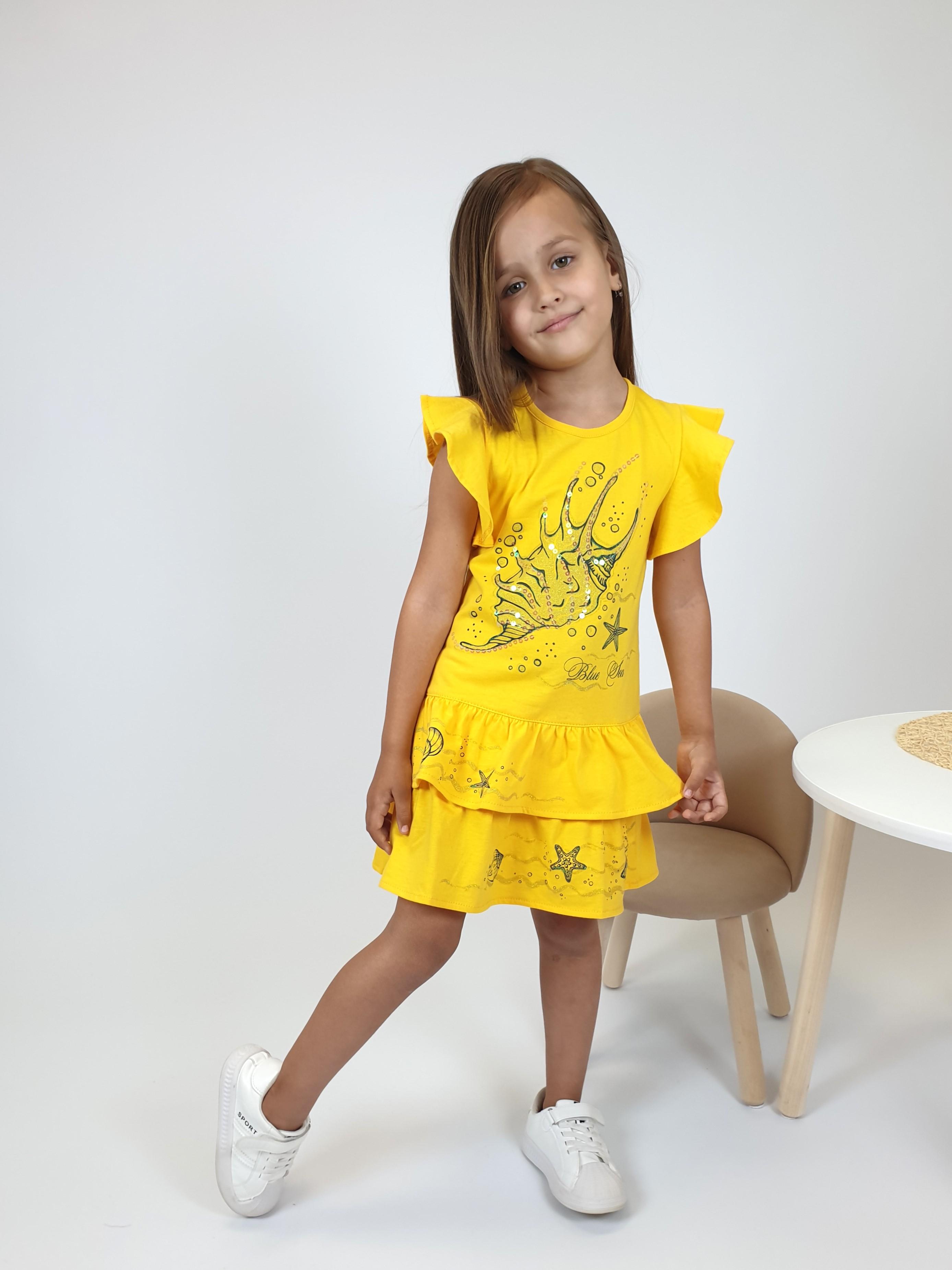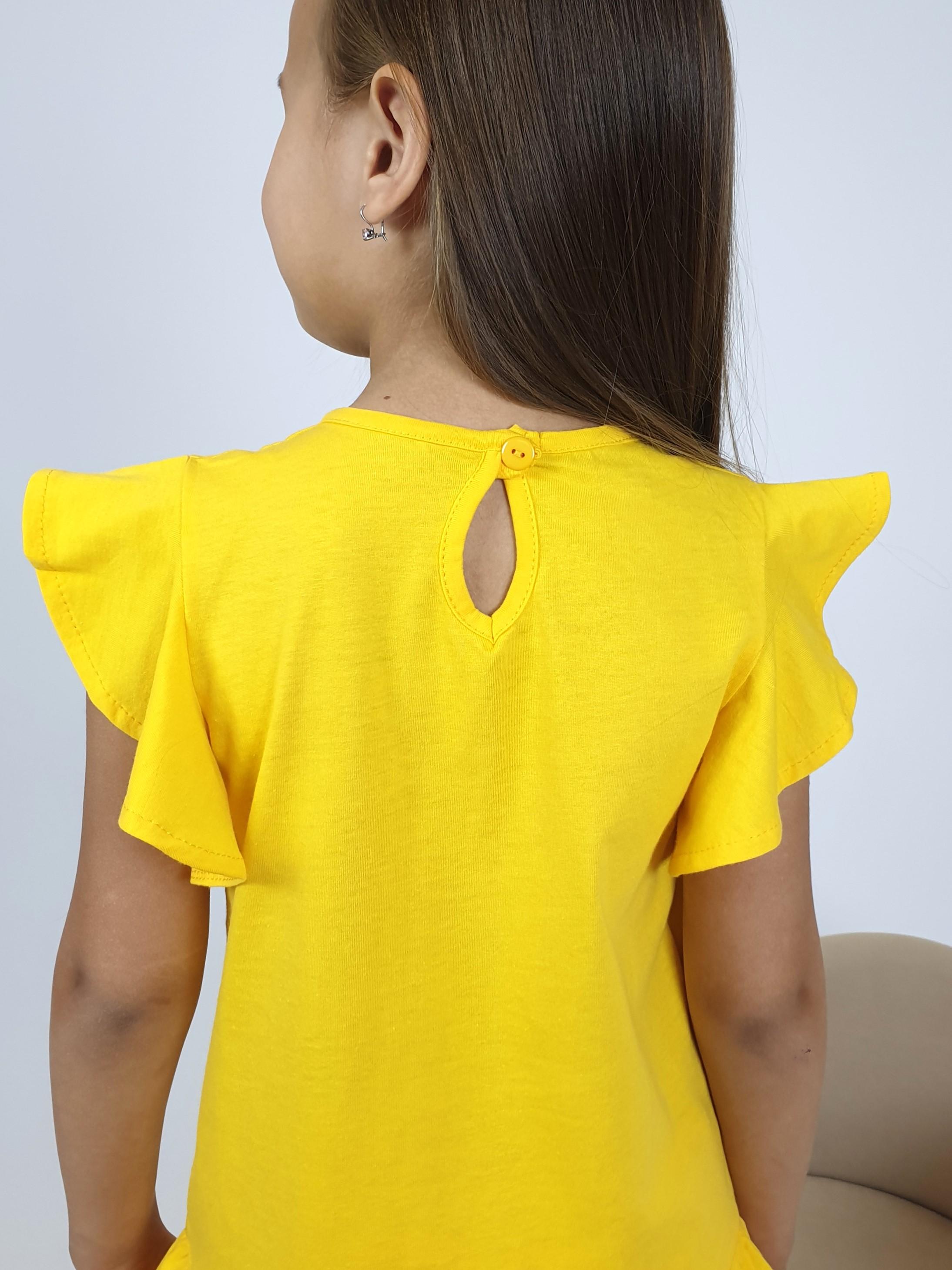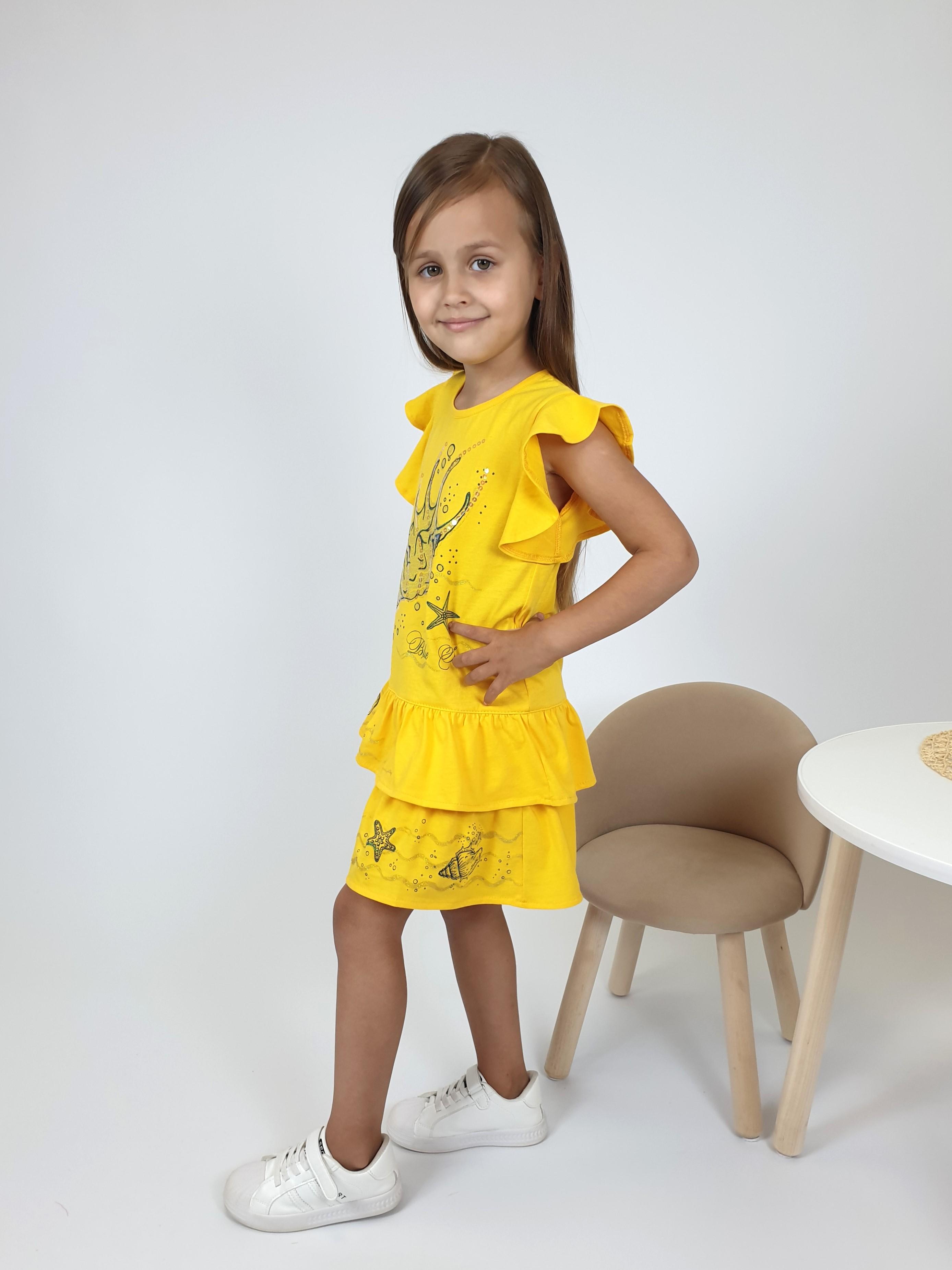 Платье-силуэт трапеция,короткий рукав-волан,юбка из двух воланов с печатью.Застежка по спинке капелька на пуговицу.Горловина окантована.Печать и вышивка-пайетки на переде.