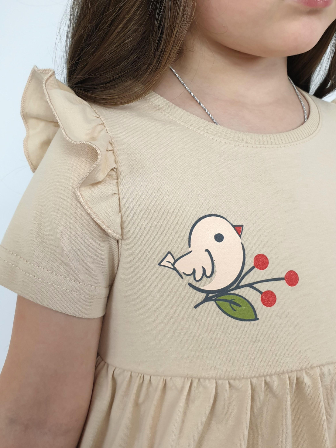 Кулирное полотно:100% х/б. Платье-отрезная юбка со сборкой,с вышивкой на переде.Кокетка переда с печатью.Короткий рукав,в пройме рюша,горловина обработана ластиком.