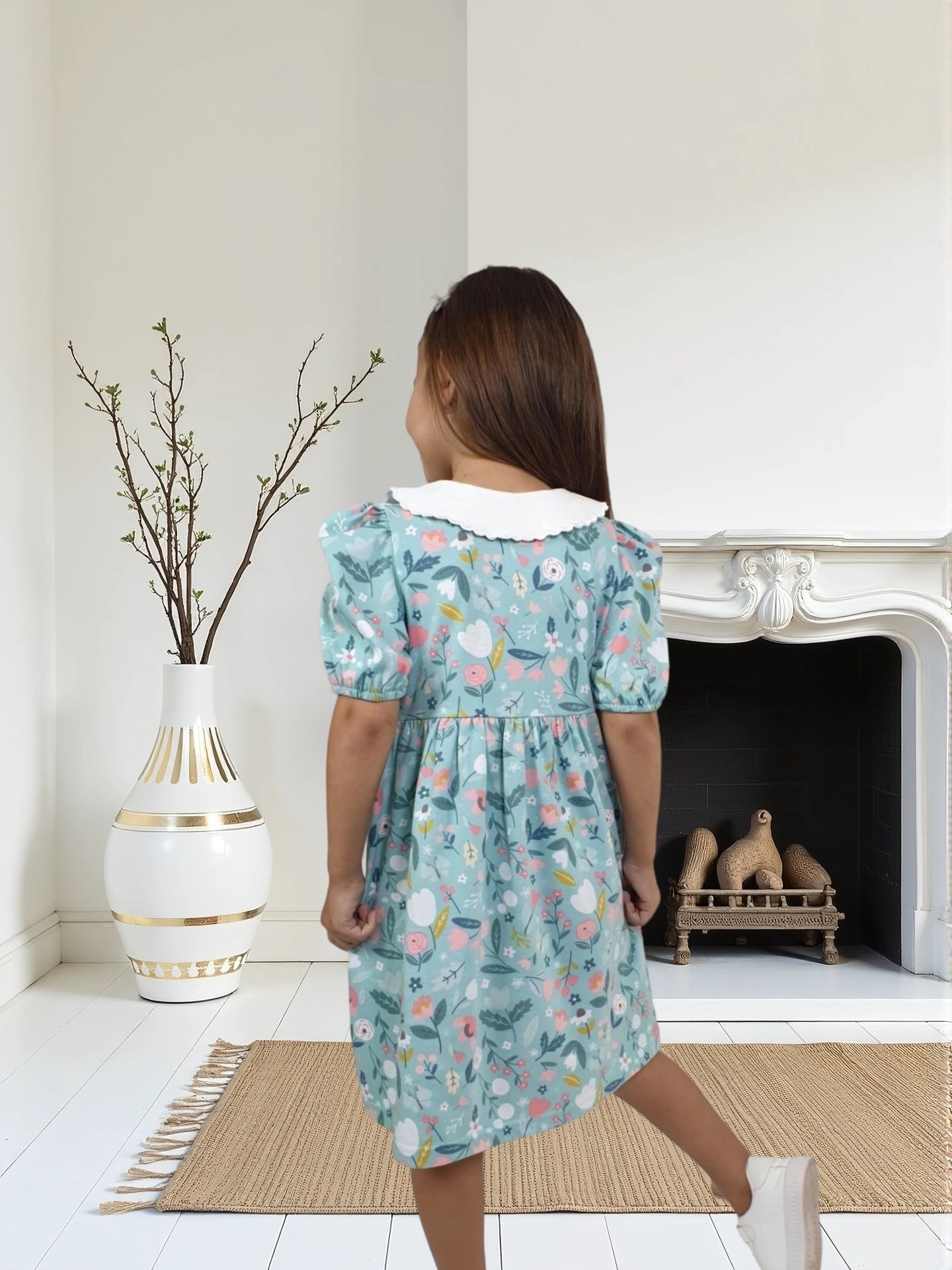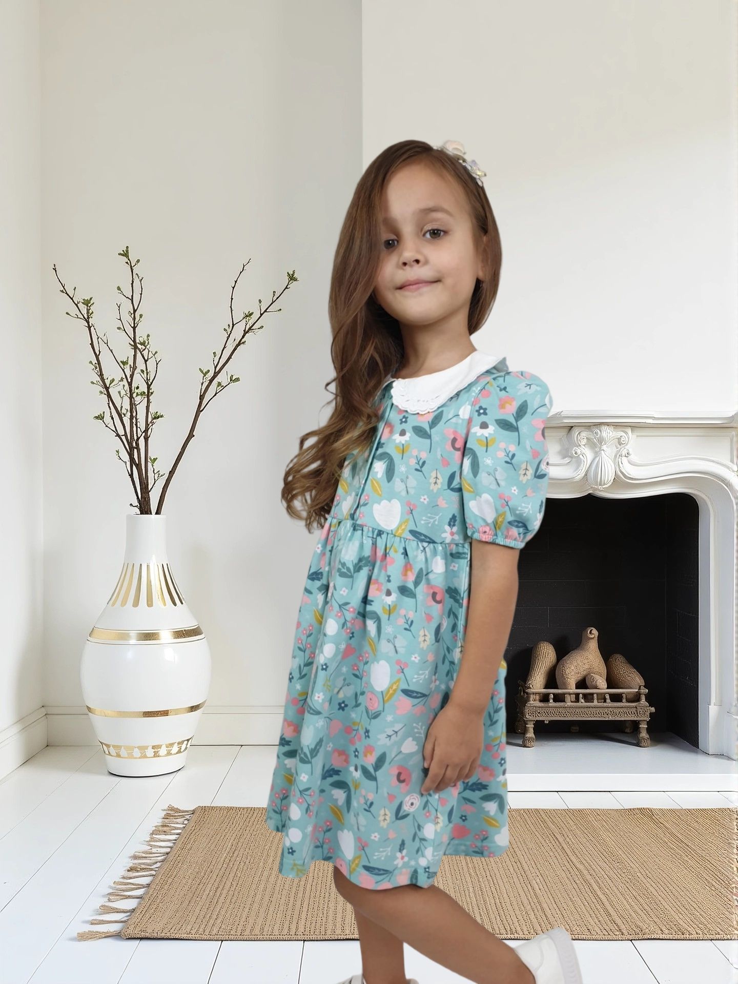 Кулирное полотно(набивка):100% х/б. Платье-с отрезной юбкой в сборку.Короткий рукав с резинкой внизу,сборка по окату.Горловина окантована и подшита.Вышитый отделочный воротник,настрочен на окантовку.Застежка центральная на пуговицы.